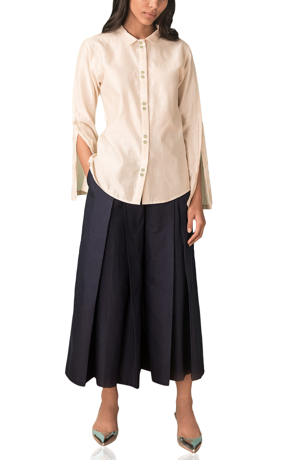 Kanelle breathes new life to the classic white shirt by slitting the sleeves and adding a hint of embroidery. Tucked in with flared tailored or pinstriped trousers, it's just the kind of power piece you need to climb the corporate ladder.