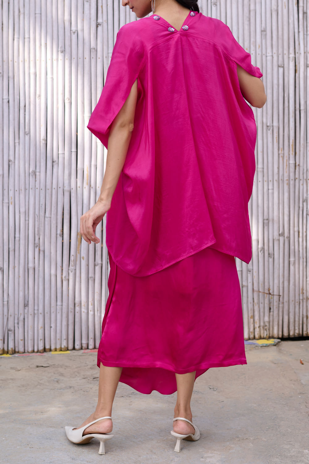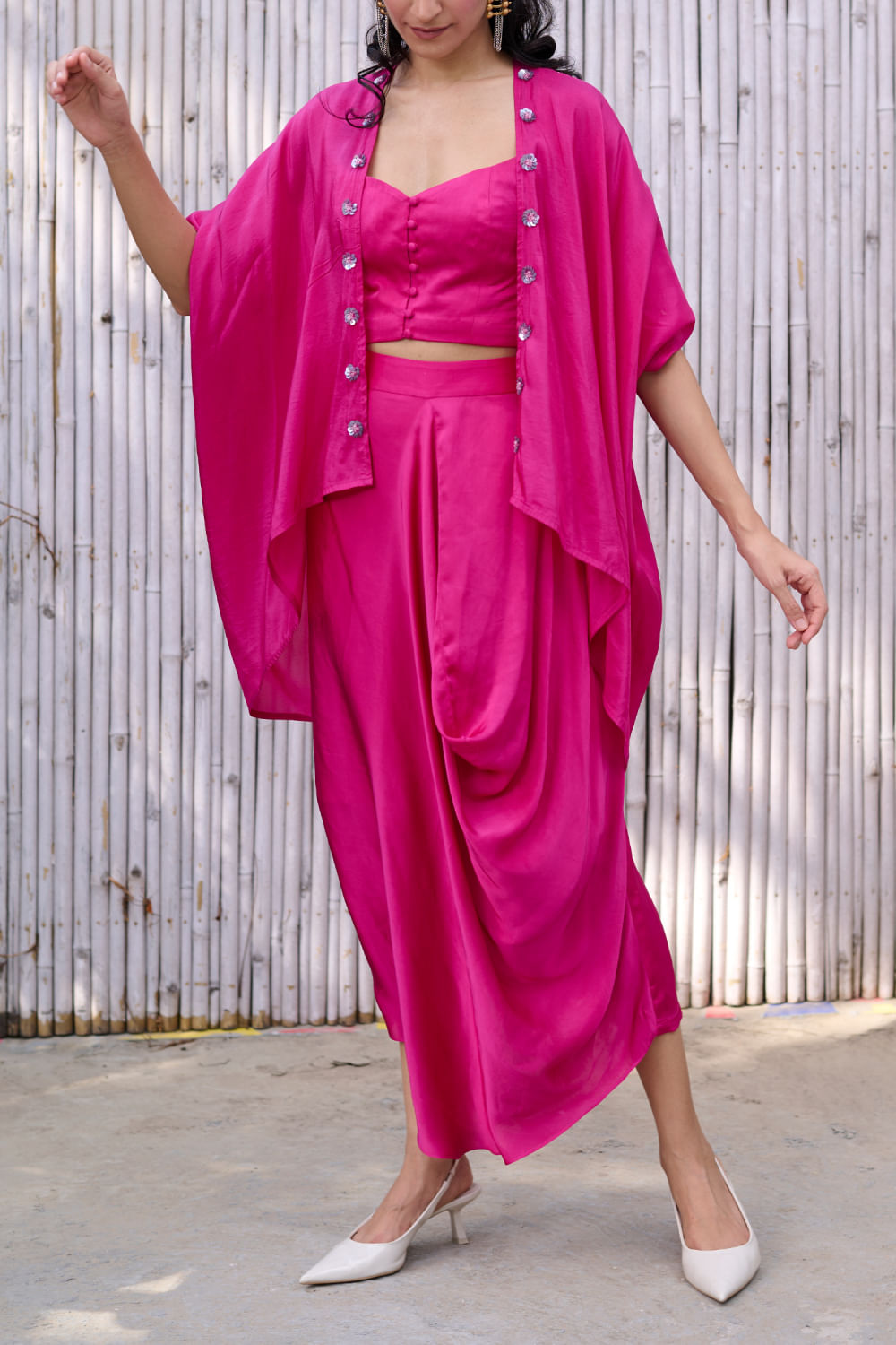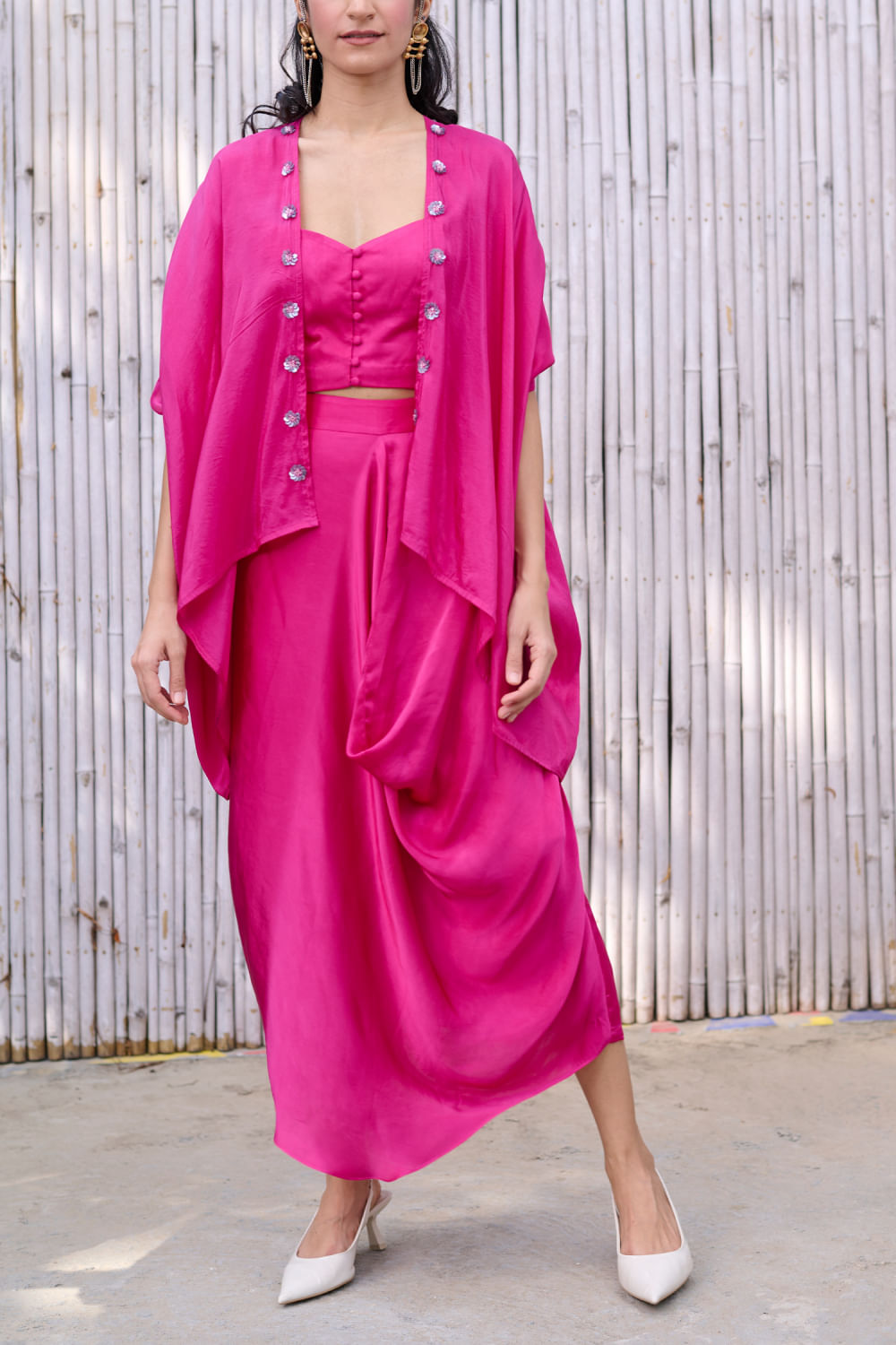 Kanelle designs this stunning cape rendered in viscose silk with sequin embroidery detailing in floral motifs featuring an oversized fit, complementing it with a matching crop top and a matching draped skirt. Style the look with cuff earrings and a cuff bracelet for a stylish update.