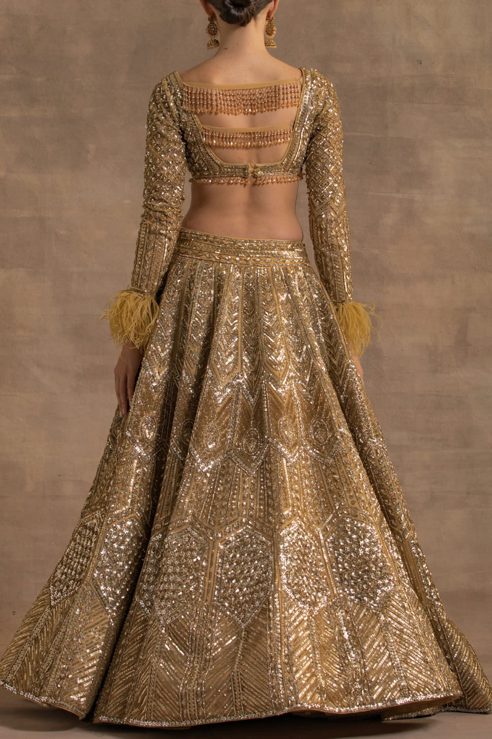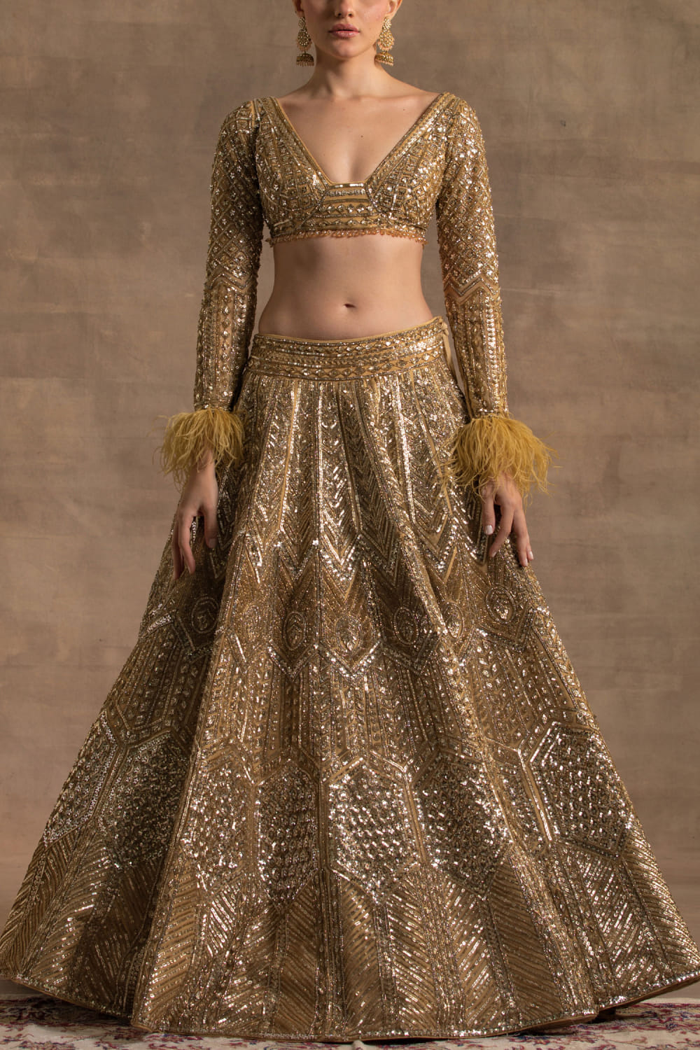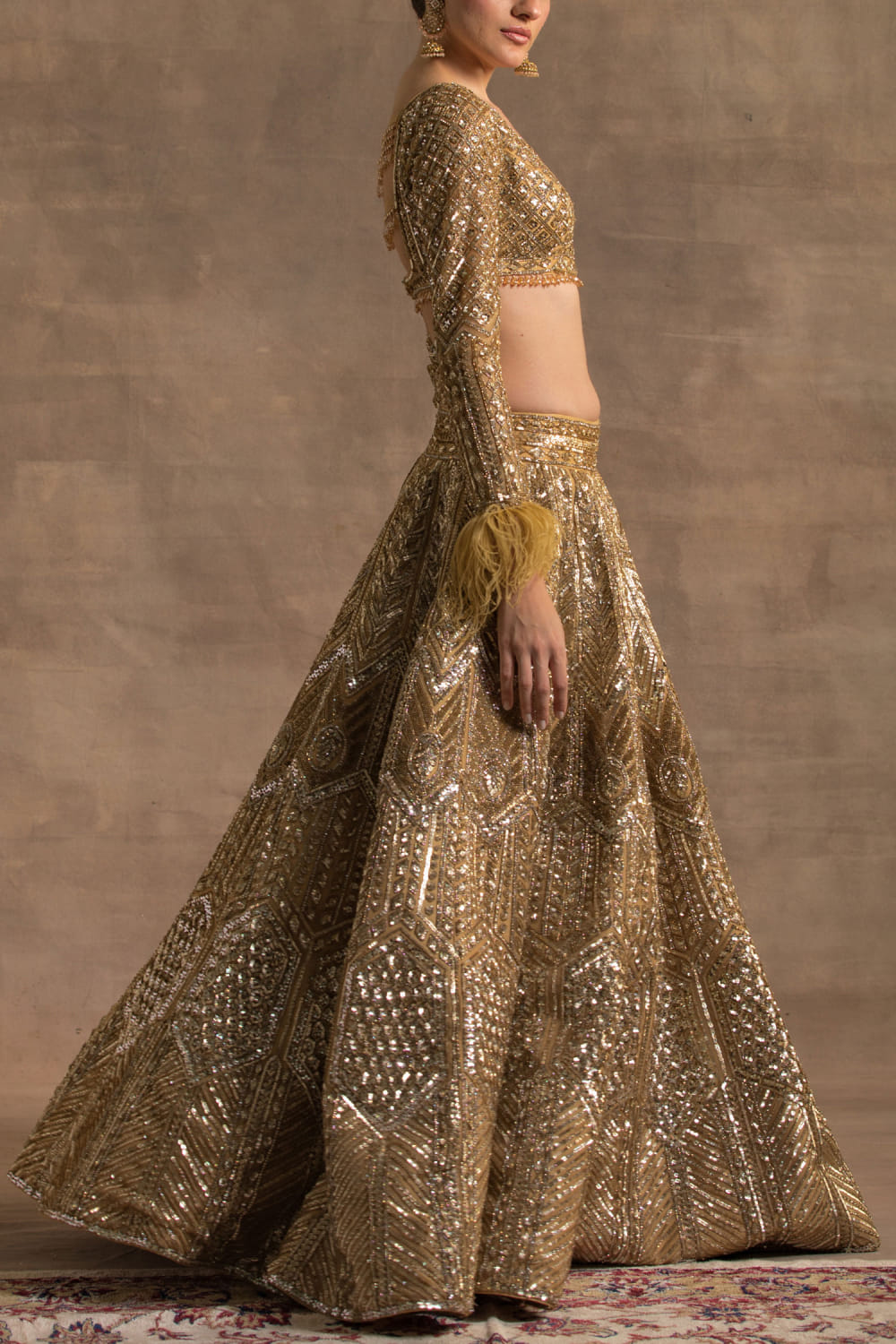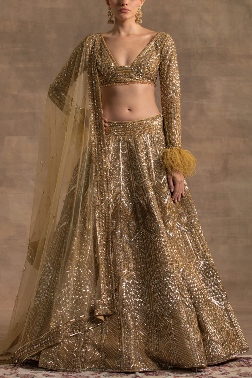 Kapda Dori designs this sparkling lehenga with intricate crystal, cutdana and sequin gold embroidery detailing, complementing the look with a feather detailed embroidered blouse and a dupatta. Style the look with a statement necklace set and stilettoes for a pre-wedding ceremony.