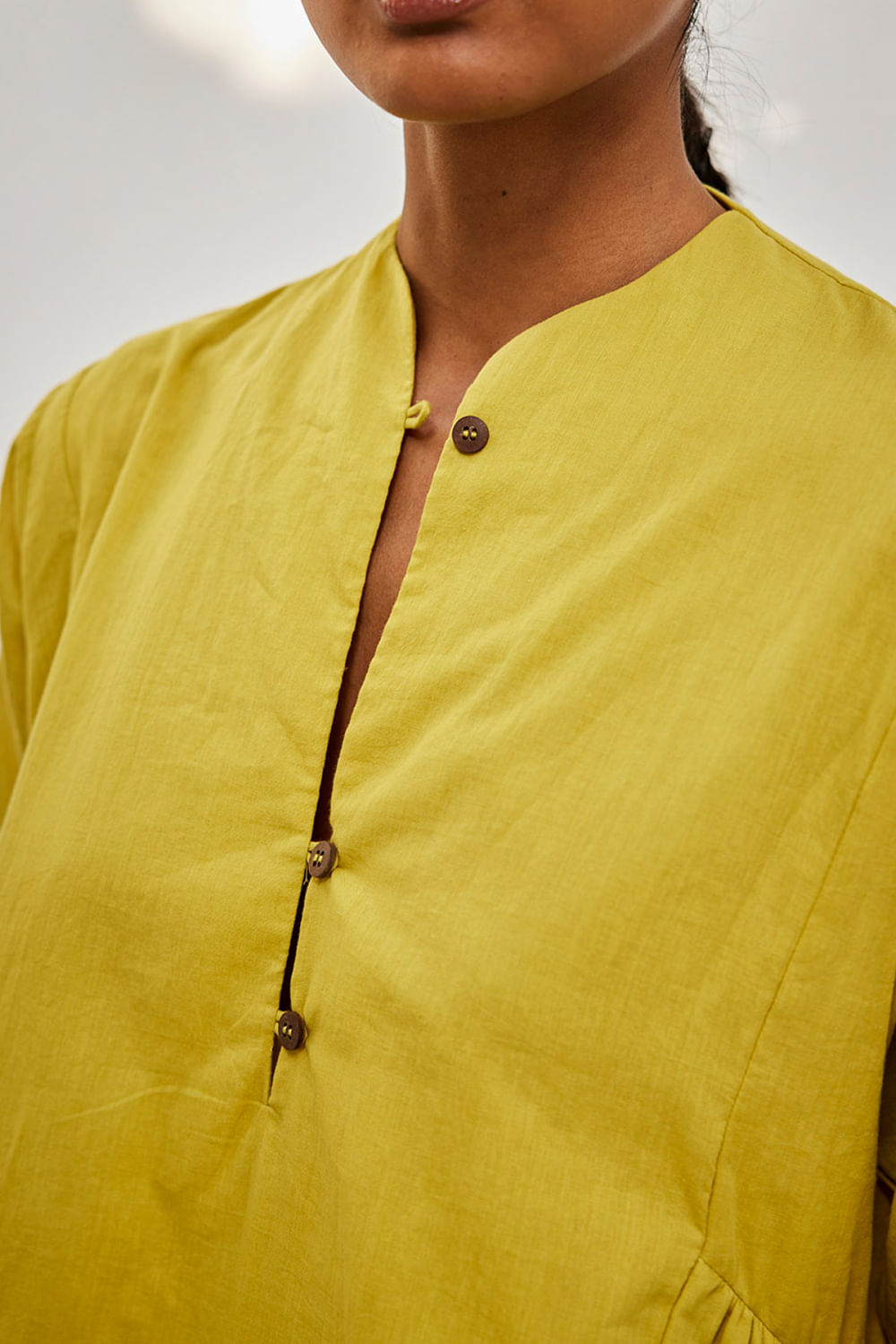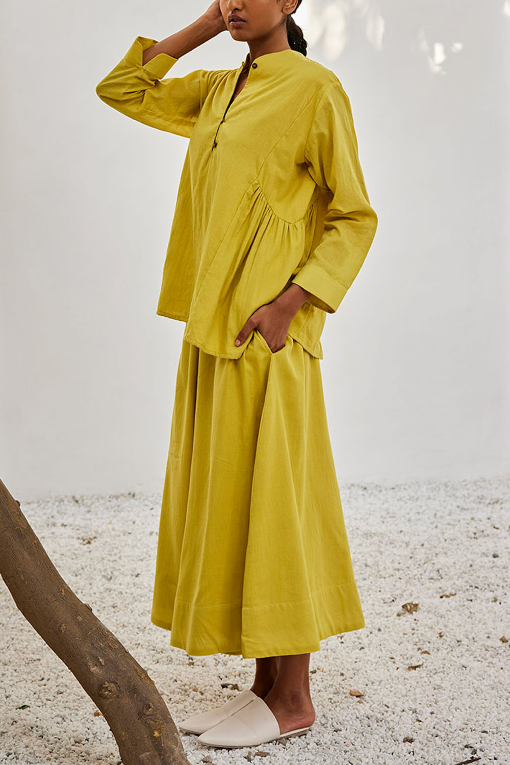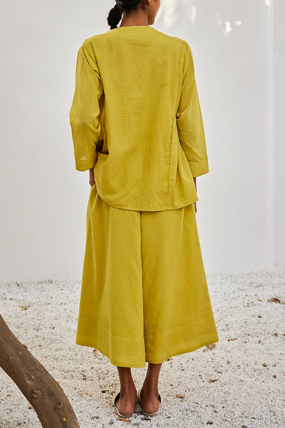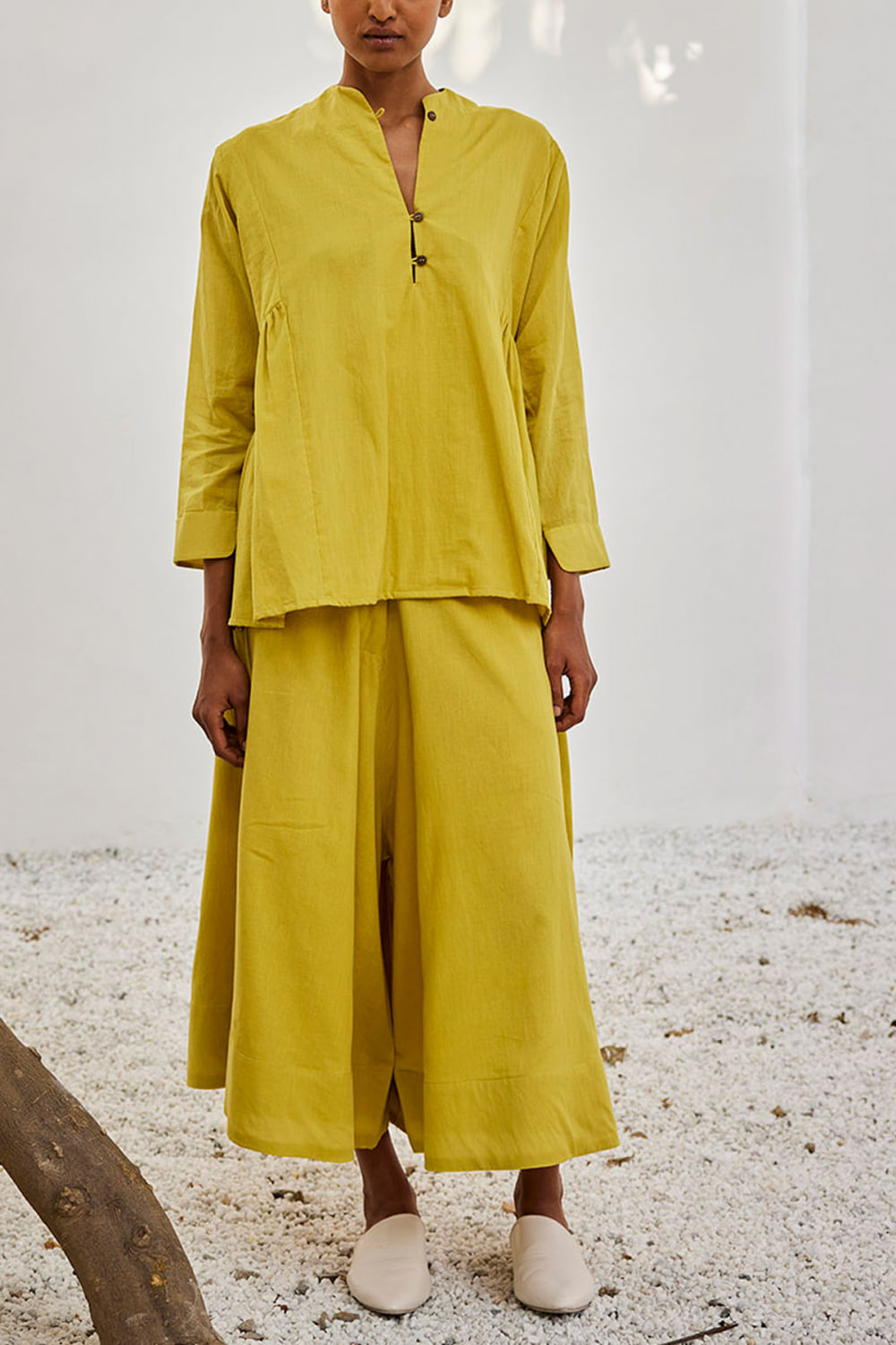 Khara Kapas designs this opulent top customised in mulmul cotton with a front button opening, long sleeves and side gathered detailing, teaming it with a pair of matching flared trousers. Style the look with a handbag and tasselled flats for a casual outing.