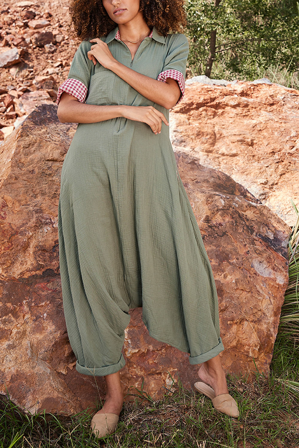 Khara Kapas designs this shirt collar jumpsuit customised in cotton with drop crotch and checkered patterns. Style it with a tote bag for a vacation.