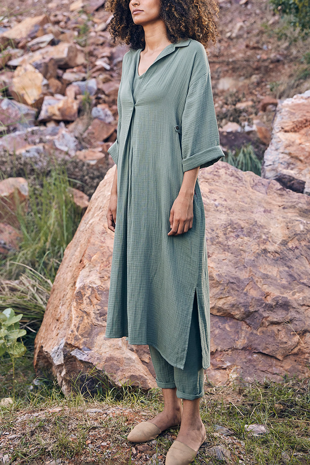 Khara Kapas designs this long tunic with a shirt collar and drop shoulder, featuring inverted pleats, teaming it with straight pants.Style the look with a pair of silver danglers.