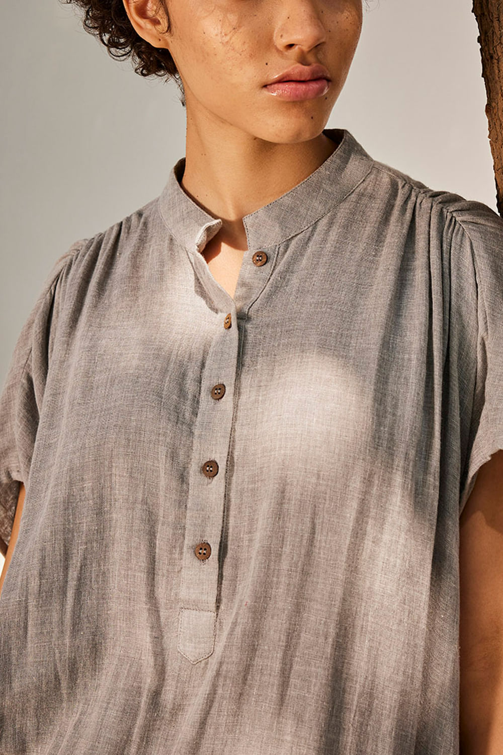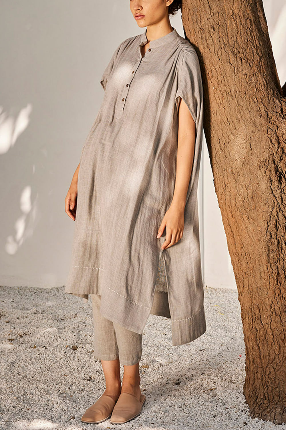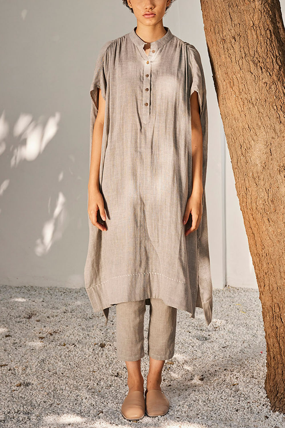 Khara Kapas designs this long tunic with a button collar, shoulder gathering and side slit, featuring delicate running stitch detailing, teaming it with matching pants. Style the look with a pair of silver studs and mules.