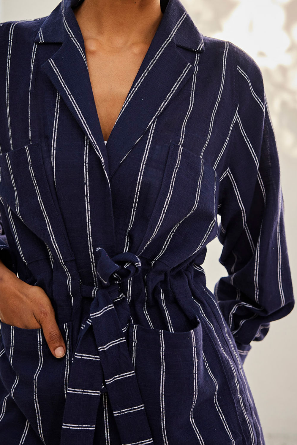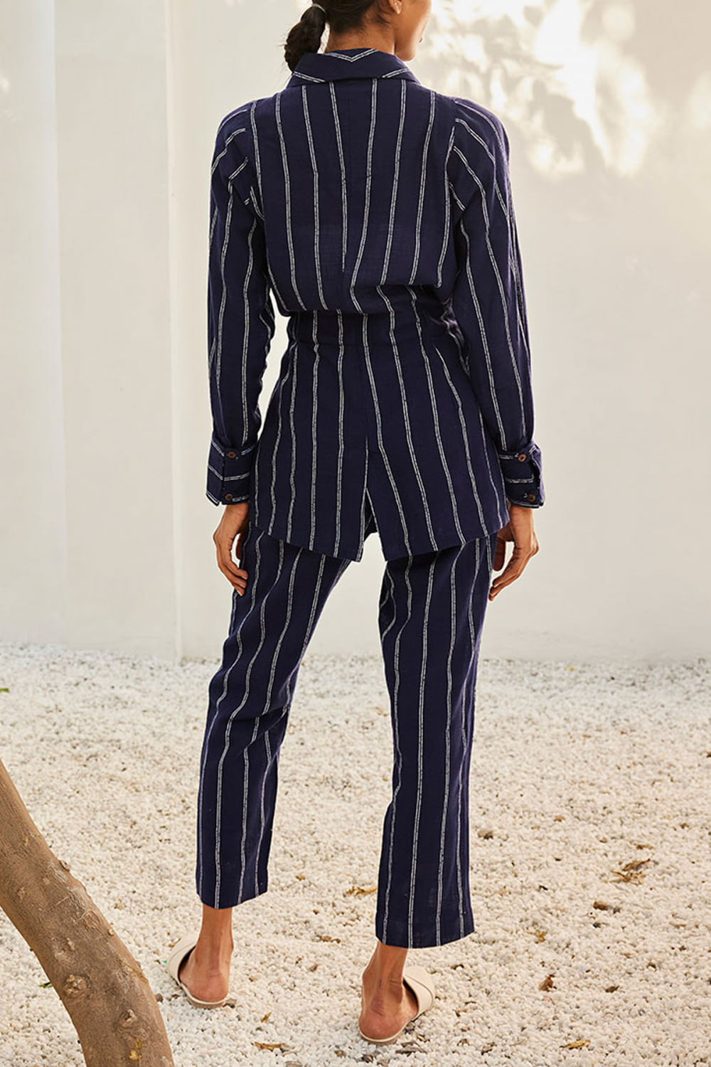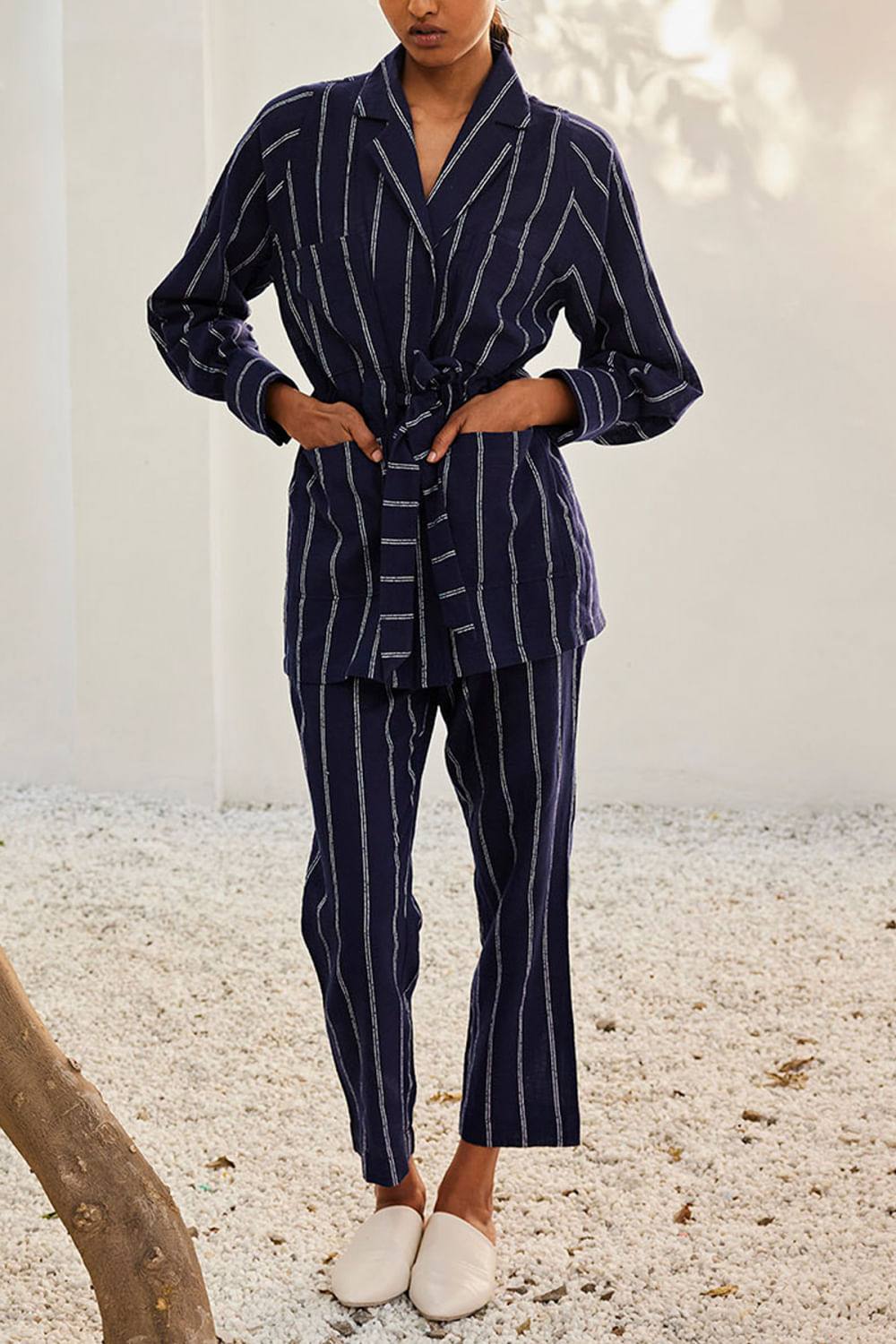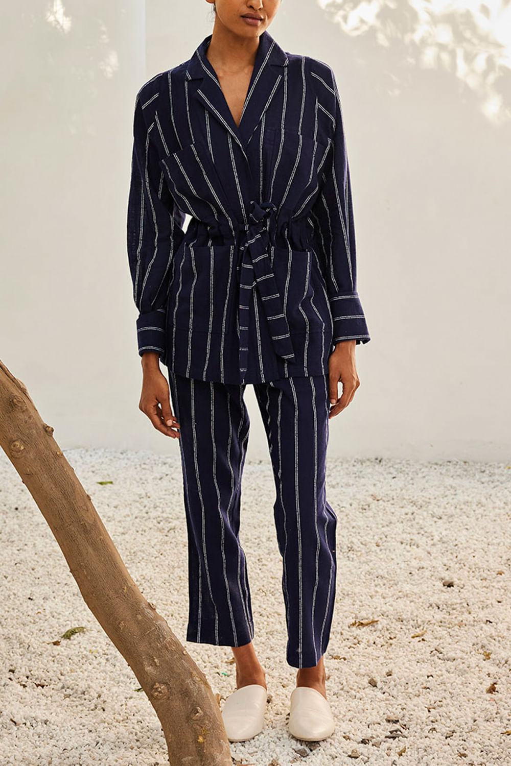 Khara Kapas designs this modish shirt crafted in gauge cotton with a lapel collar, full sleeves, buttoned cuffs and tie-up detailing in stripe patterns, teamed with a pair of matching striped pants. Style the look with metallic studs and a multi-finger ring for an impressive appearance.