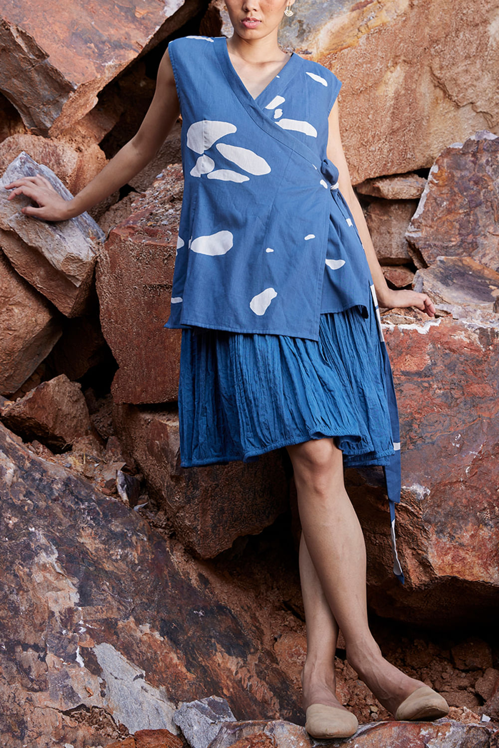 Khara Kapas designs this set of wrap jacket with mosaic prints, customised in wrap silhouette and surplice neckline. It is teamed with crinkled dress. Style the look with a pair of loafers and a sling bag.