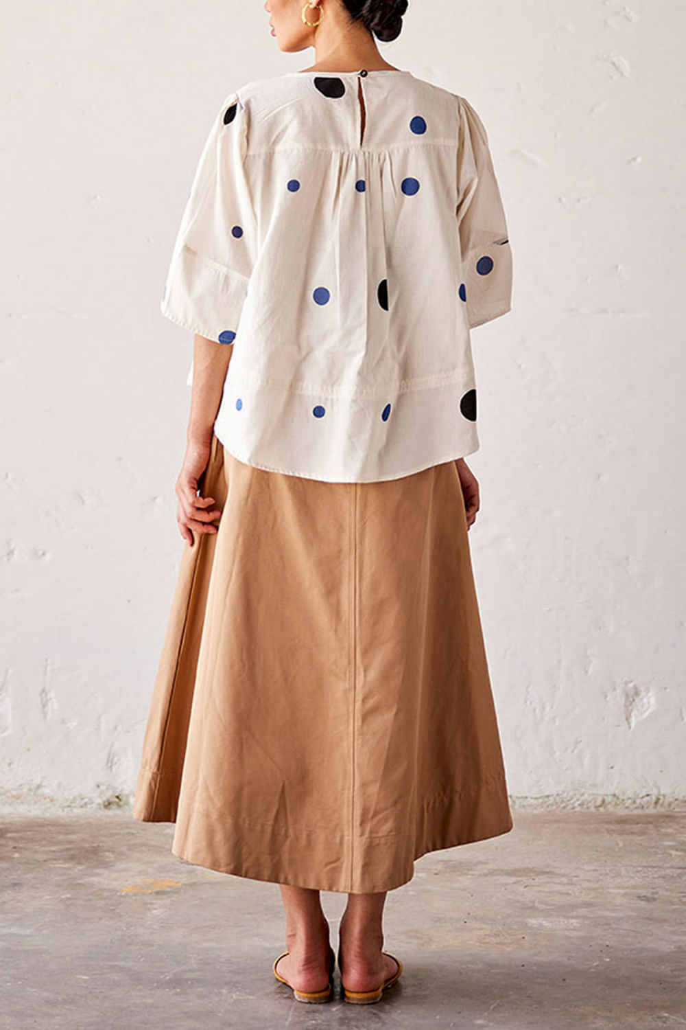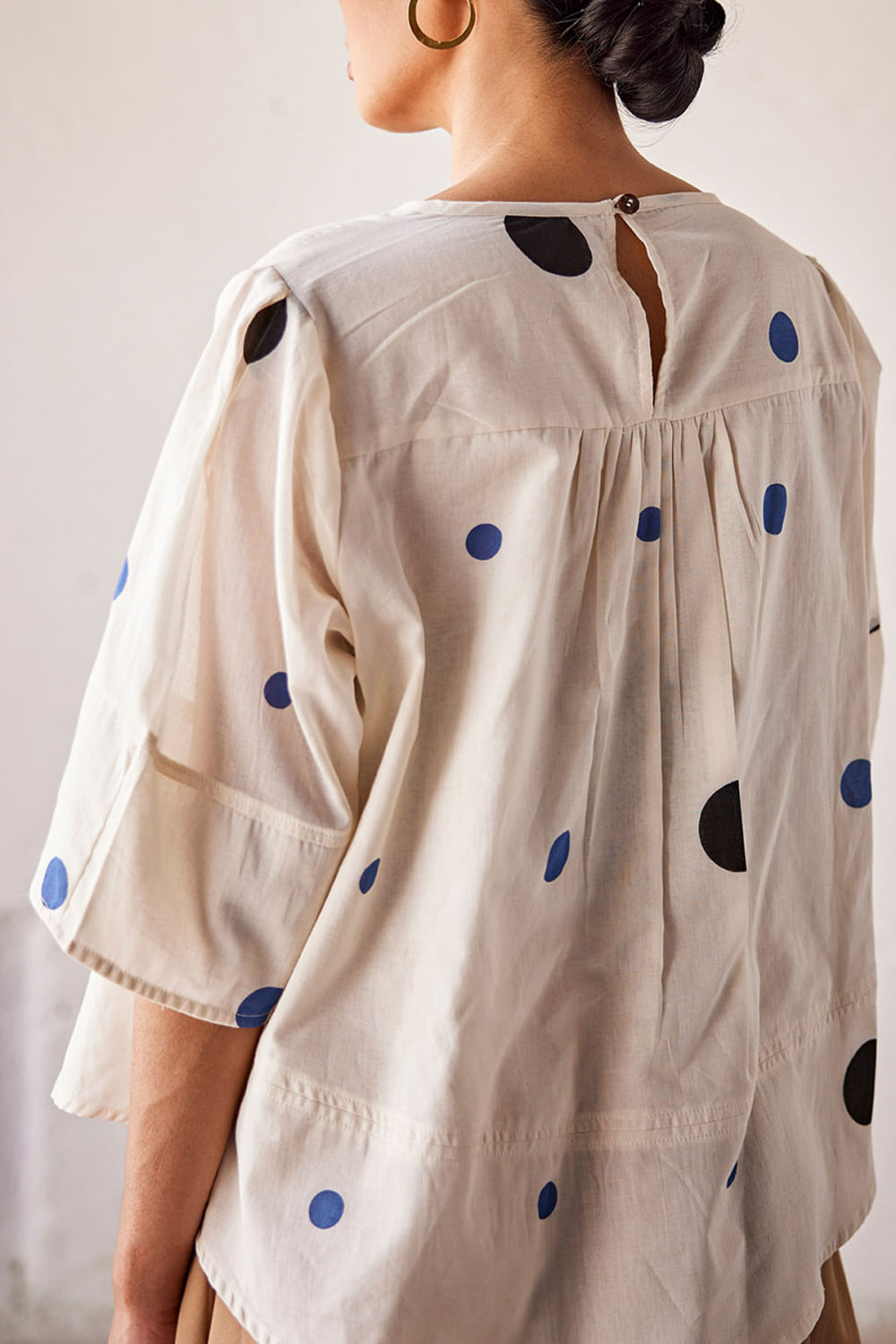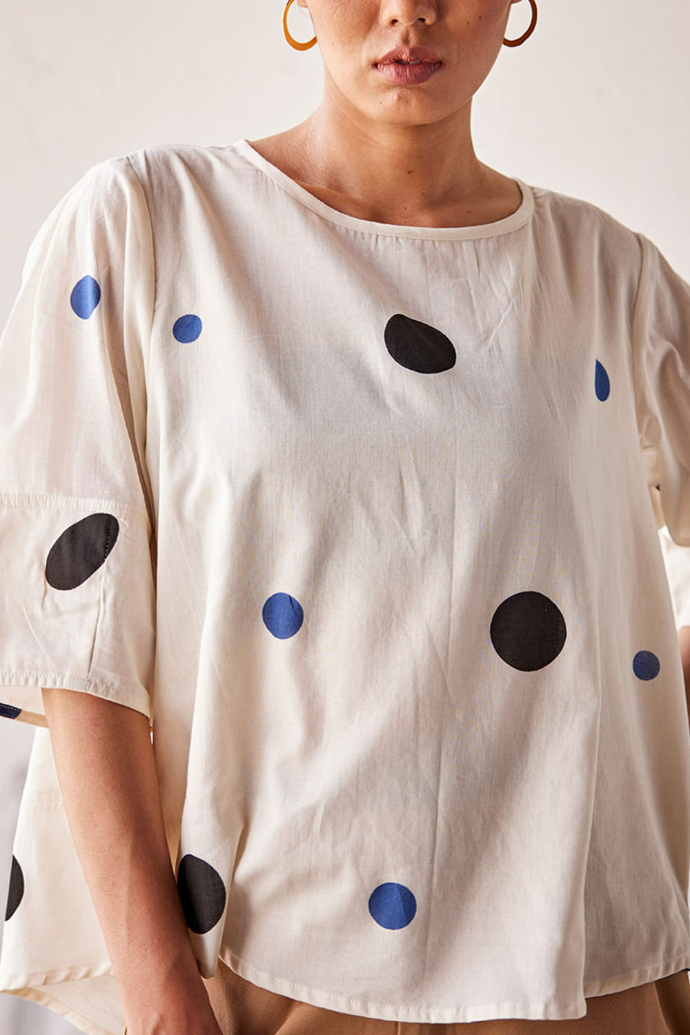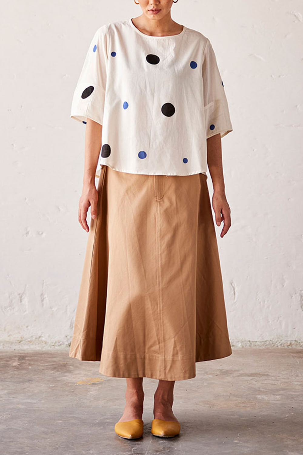 Khara Kapas designs this chic style top in mulmul cotton featuring a polka dot print pattern. Style it with stud earrings and palazzo for a casual look. The skirt here is shown for styling purposes only.