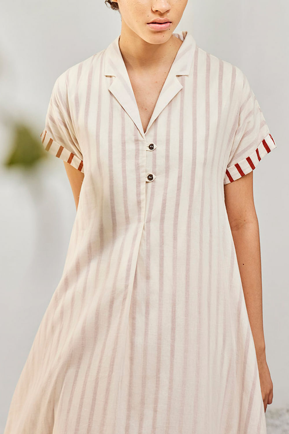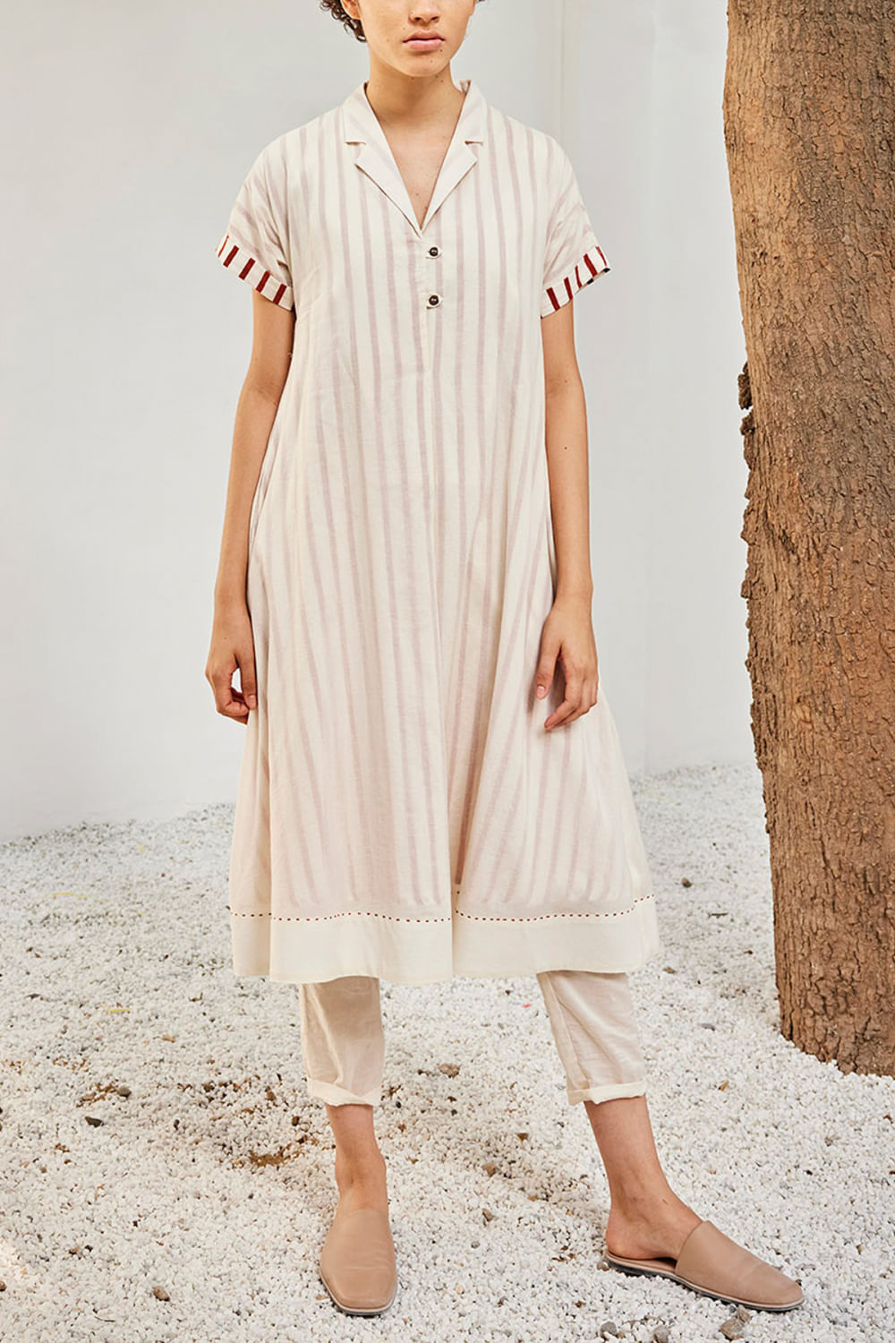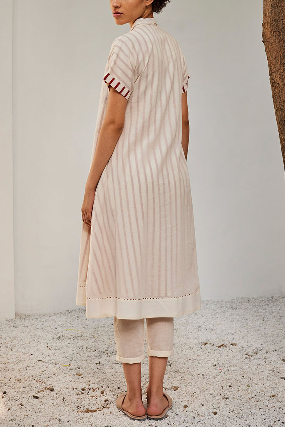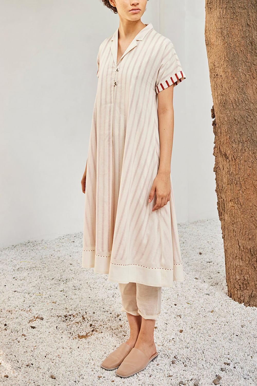 Khara Kapas designs this eye-catching tunic crafted in mulmul cotton with lapel collars, front buttons and stripe prints featuring hand-embroidered running stitches on the hemline, teamed with a pair of matching trousers. Style the look with metallic studs and a statement ring to turn heads.