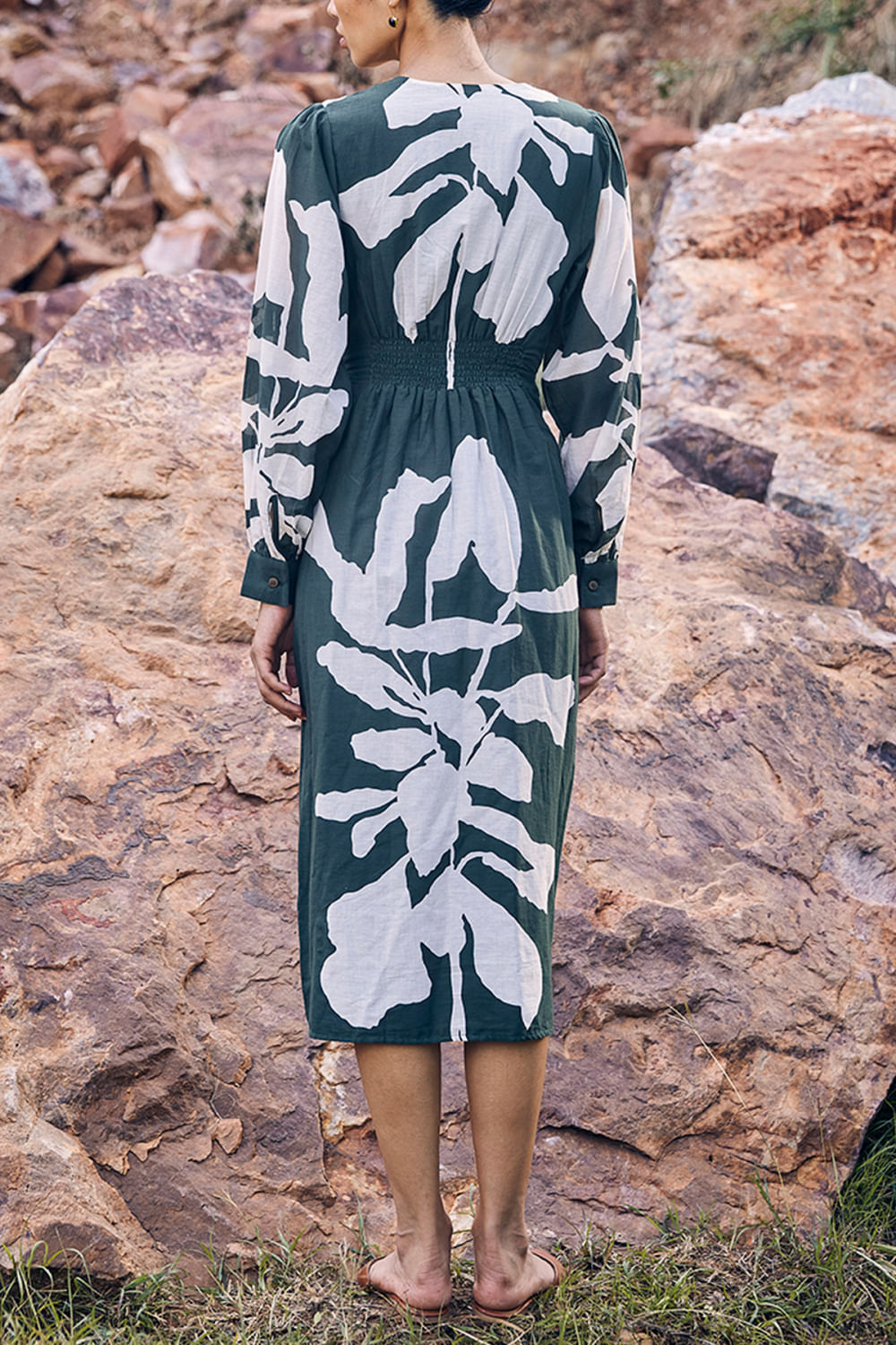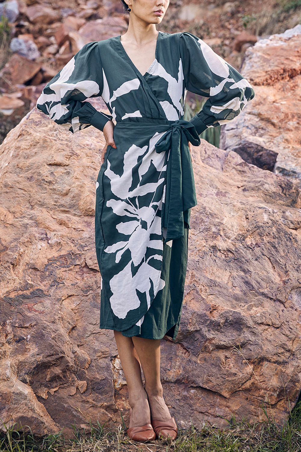 Khara Kapas designs this dress cut in floral prints and surplice neckline, customised in cotton. Style it with a pair of boots and a sling bag.