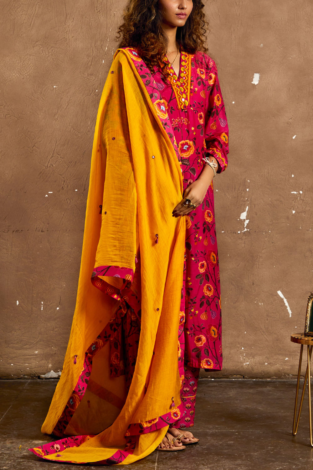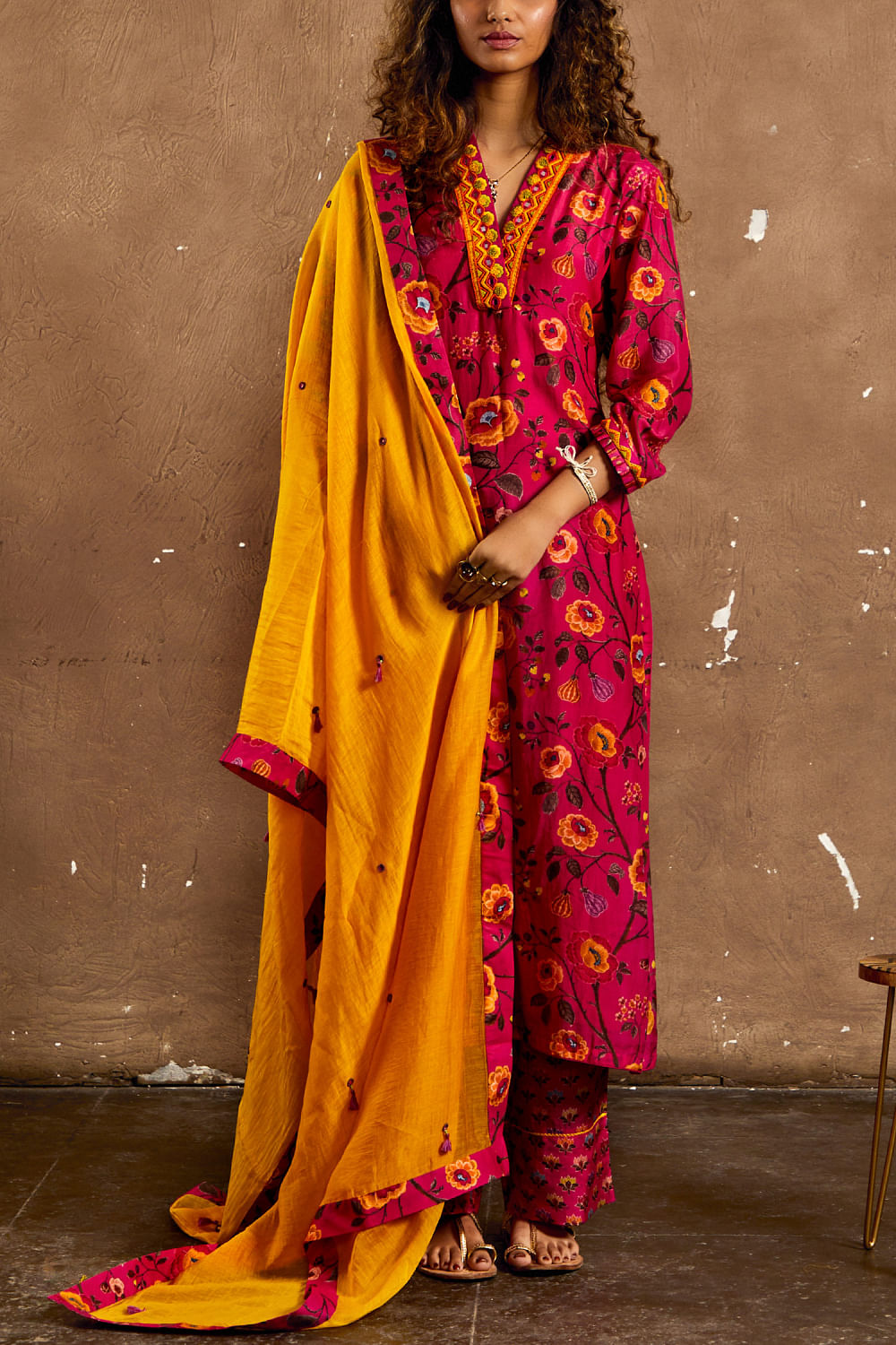 Kinjal Modi designs this chanderi kurta with floral prints, teaming it with matching pants and a chanderi dupatta adorning scalloped edges. Style the look with kolhapuris and silver studs.
