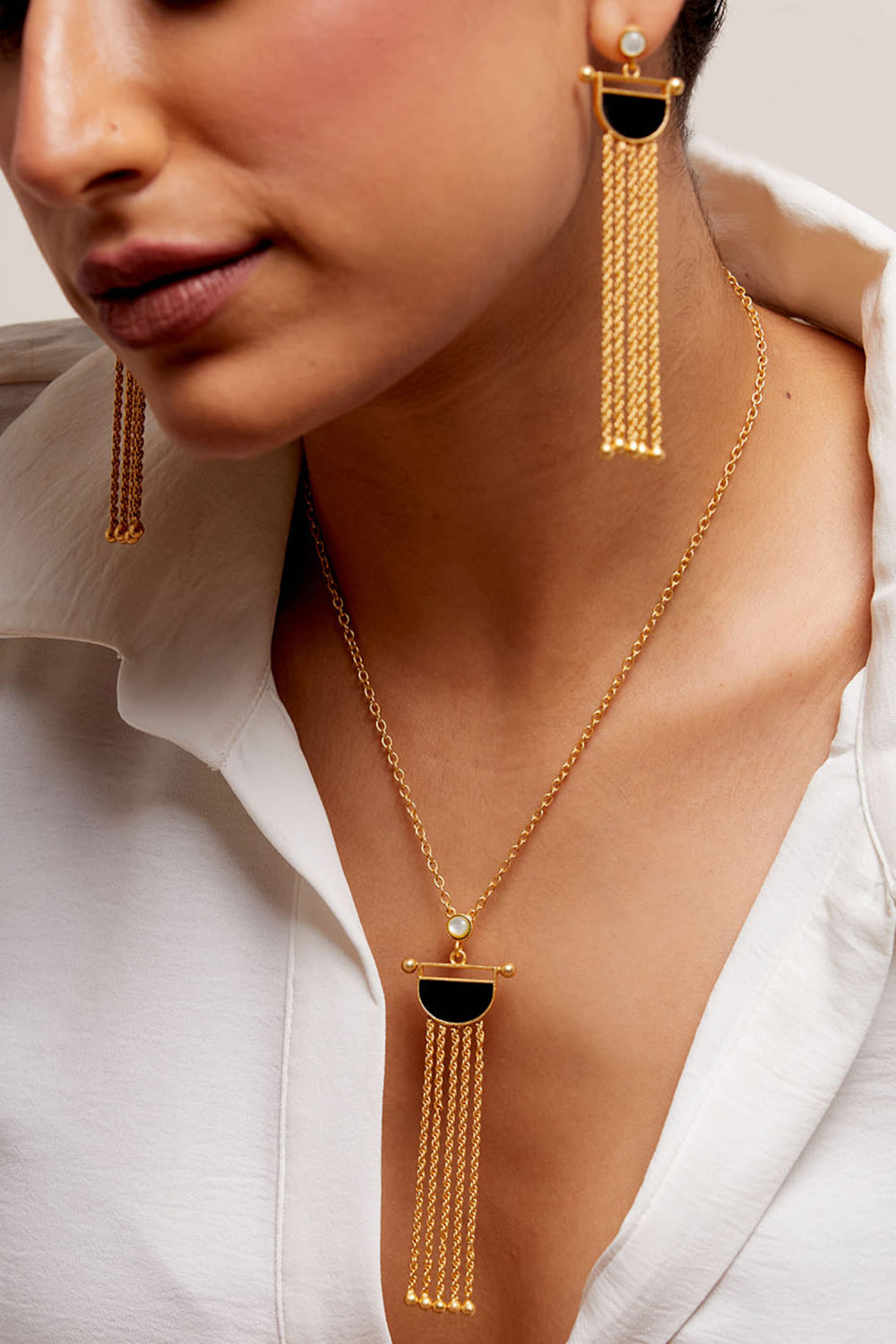 Kivaakshh designs this modern pair of earrings handcrafted in 22kt gold-plated brass with enamel work, delicate pearls, chain and tassel detailing. Style them with a fringed dress for a party.