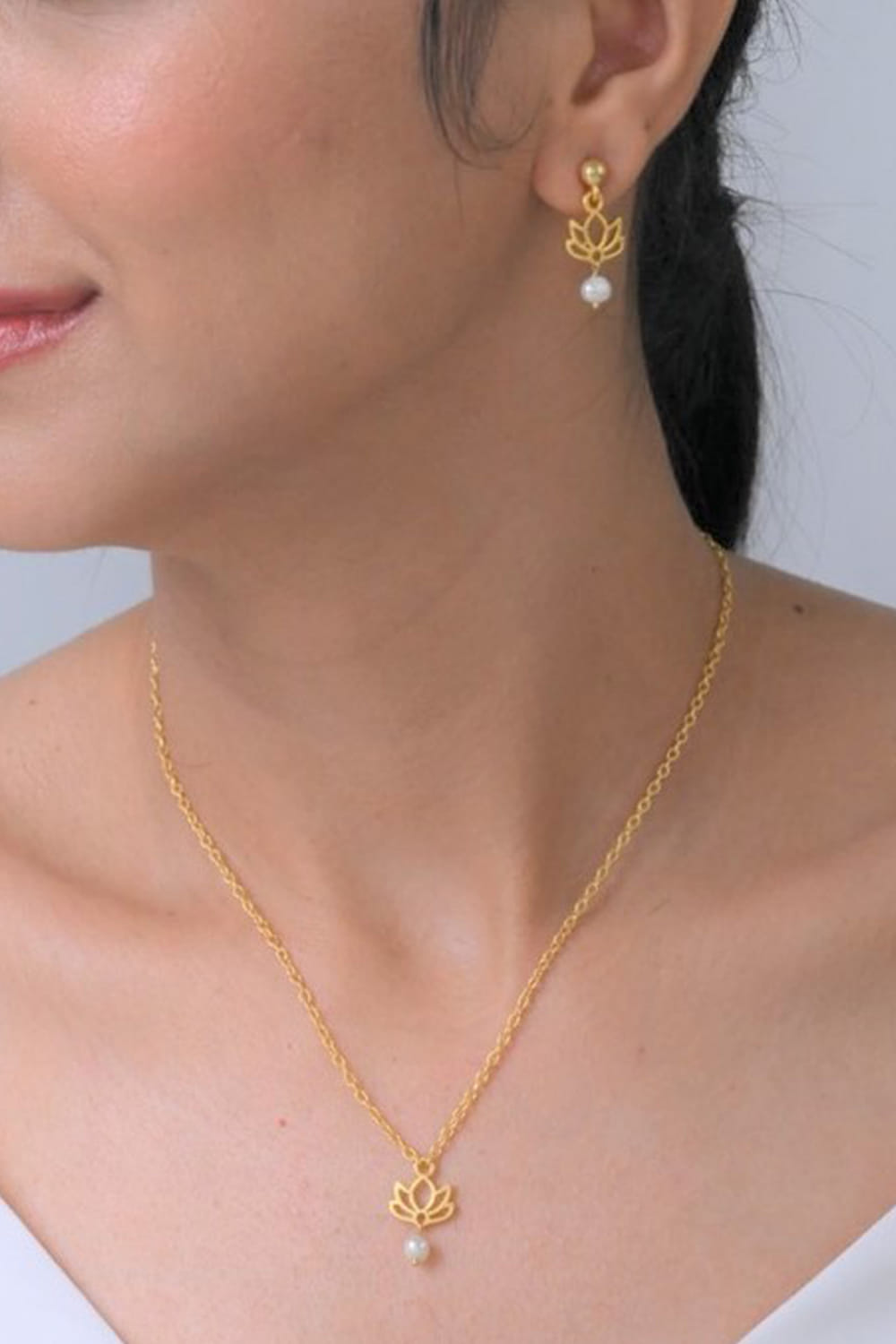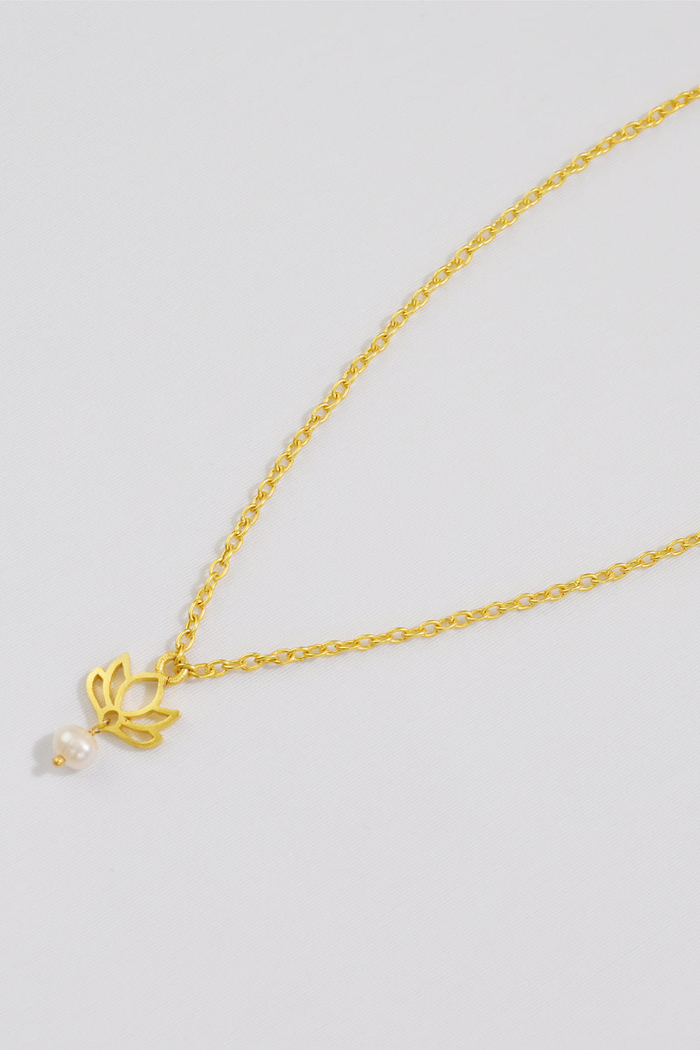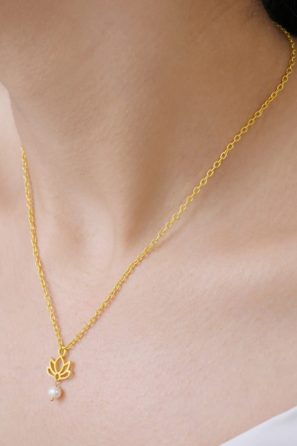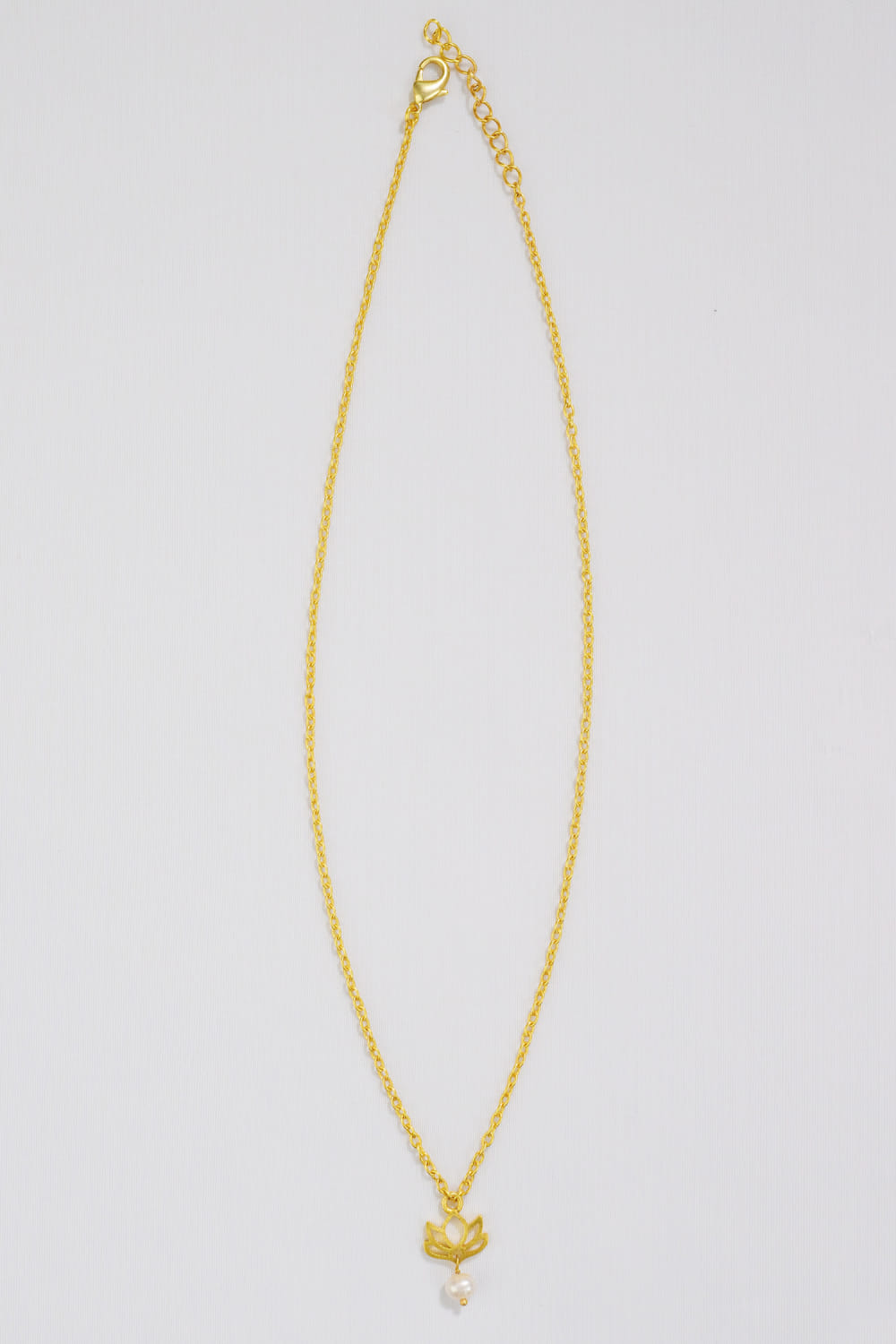 Kivaakshh designs this splendid necklace handcrafted in 22kt gold-plated brass with chain detailing, freshwater pearl drop and a lotus motif. Style it with a strappy dress for an occasion.