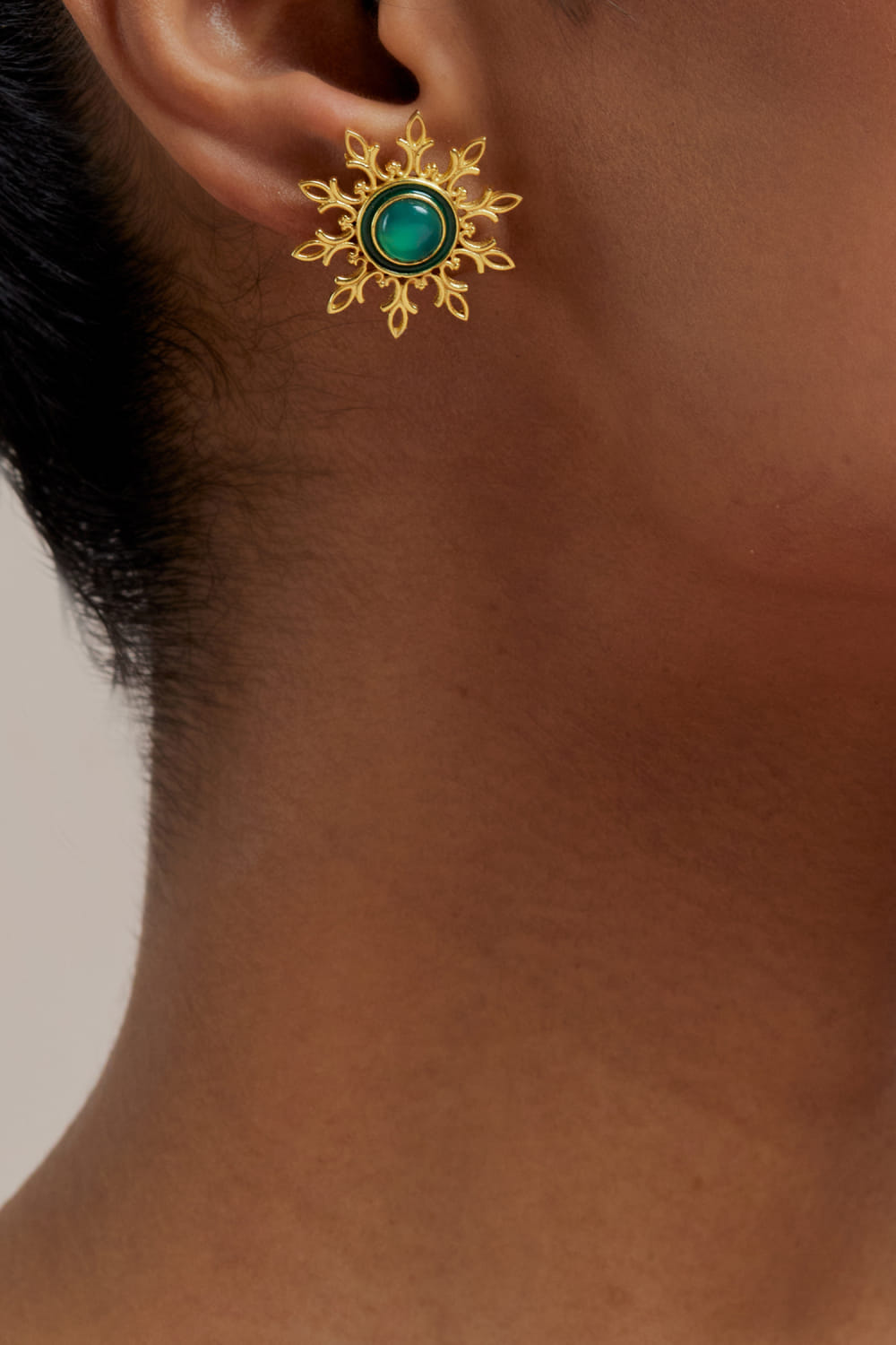 Kivaakshh designs this radiant pair of earrings crafted in 22kt gold-plated brass laden with green onyx embellishments and enamel work featuring intricate detailing. Style them with a kurta set for a festive affair.