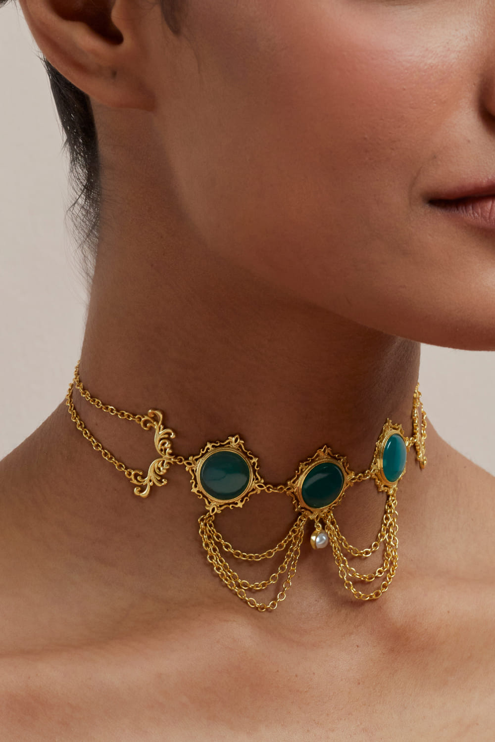 Kivaakshh designs this mesmerising choker customised in 22kt gold-plated brass encapsulated with layered chain detailing, pearl and green onyx embellishments featuring intricate detailing. Style it with a pre-draped sari to make a statement.
