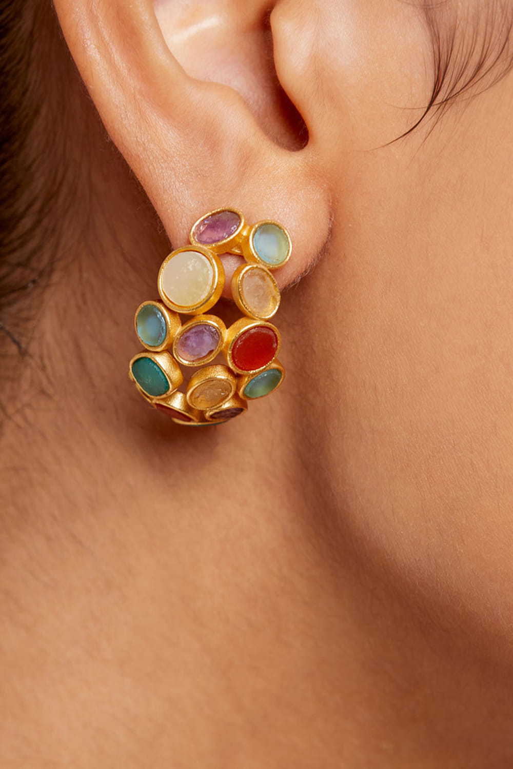 Kivaakshh designs this dramatic pair of earrings handcrafted in 22kt gold-plated brass embedded with navratna stones and delicate pearl detailing. Style them with an off-shoulder dress for a stunning impression.