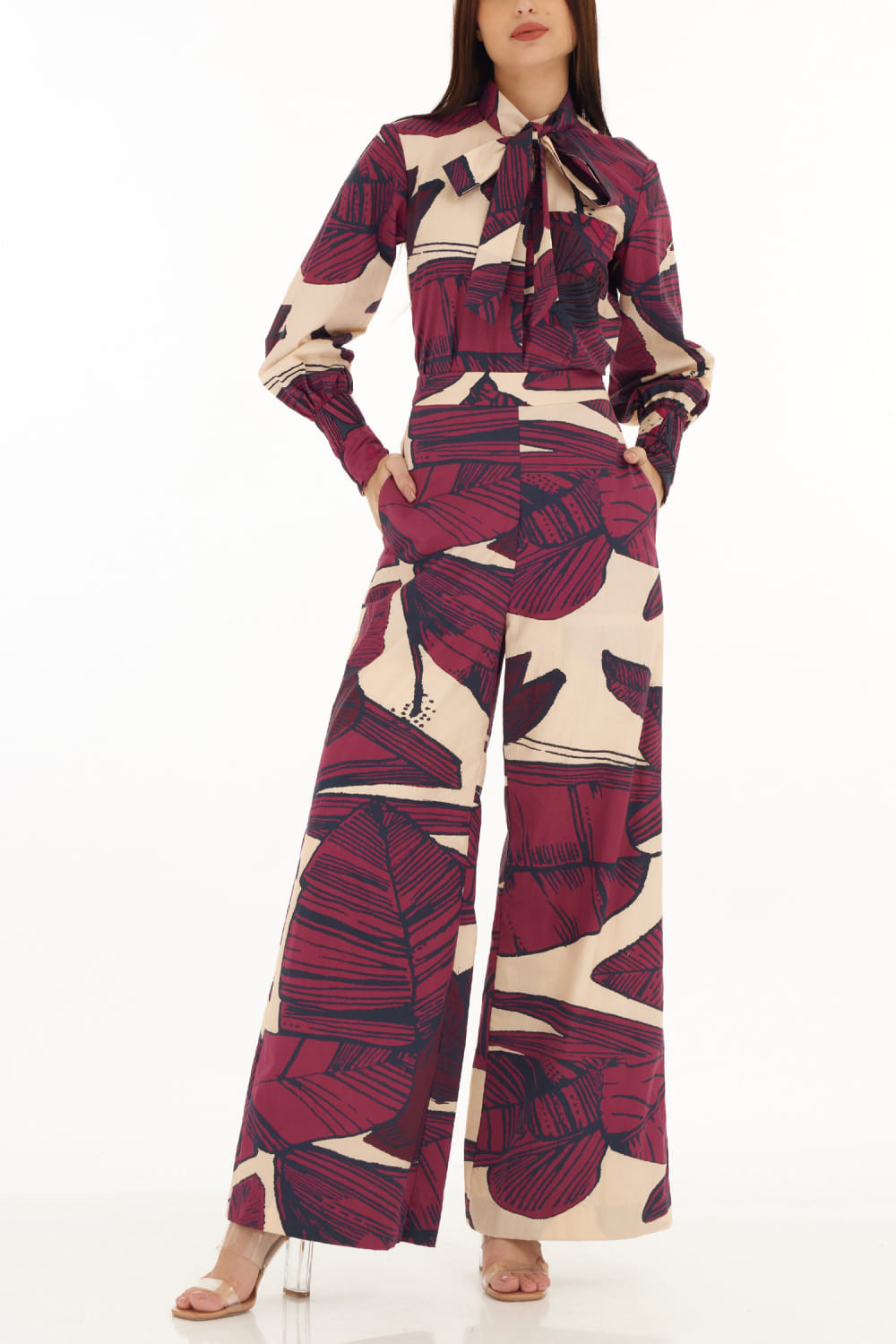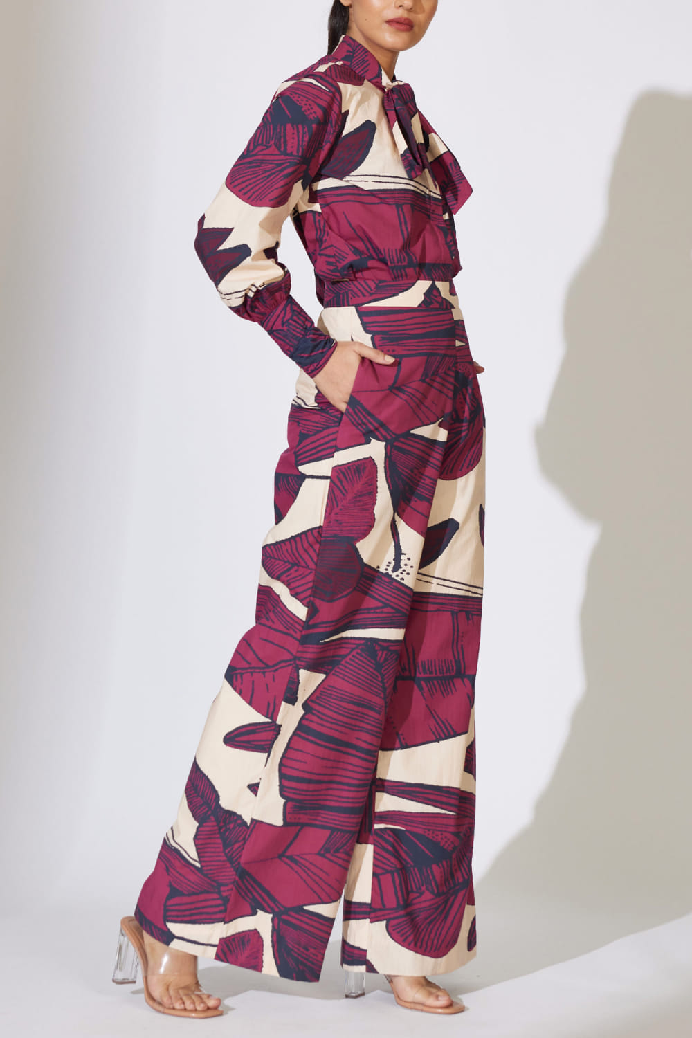 Koai designs this casual yet trendy pair of pants customised in poplin cotton with floral and leaf prints. Style it with an oversized shirt and block heels. The top here is shown for styling purposes only.