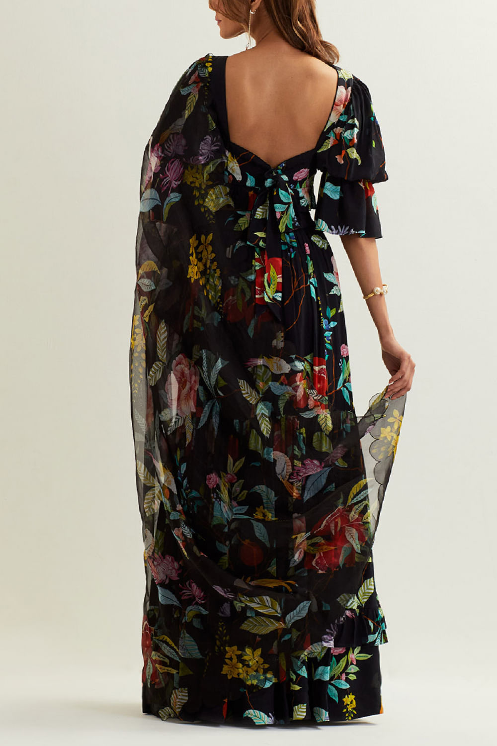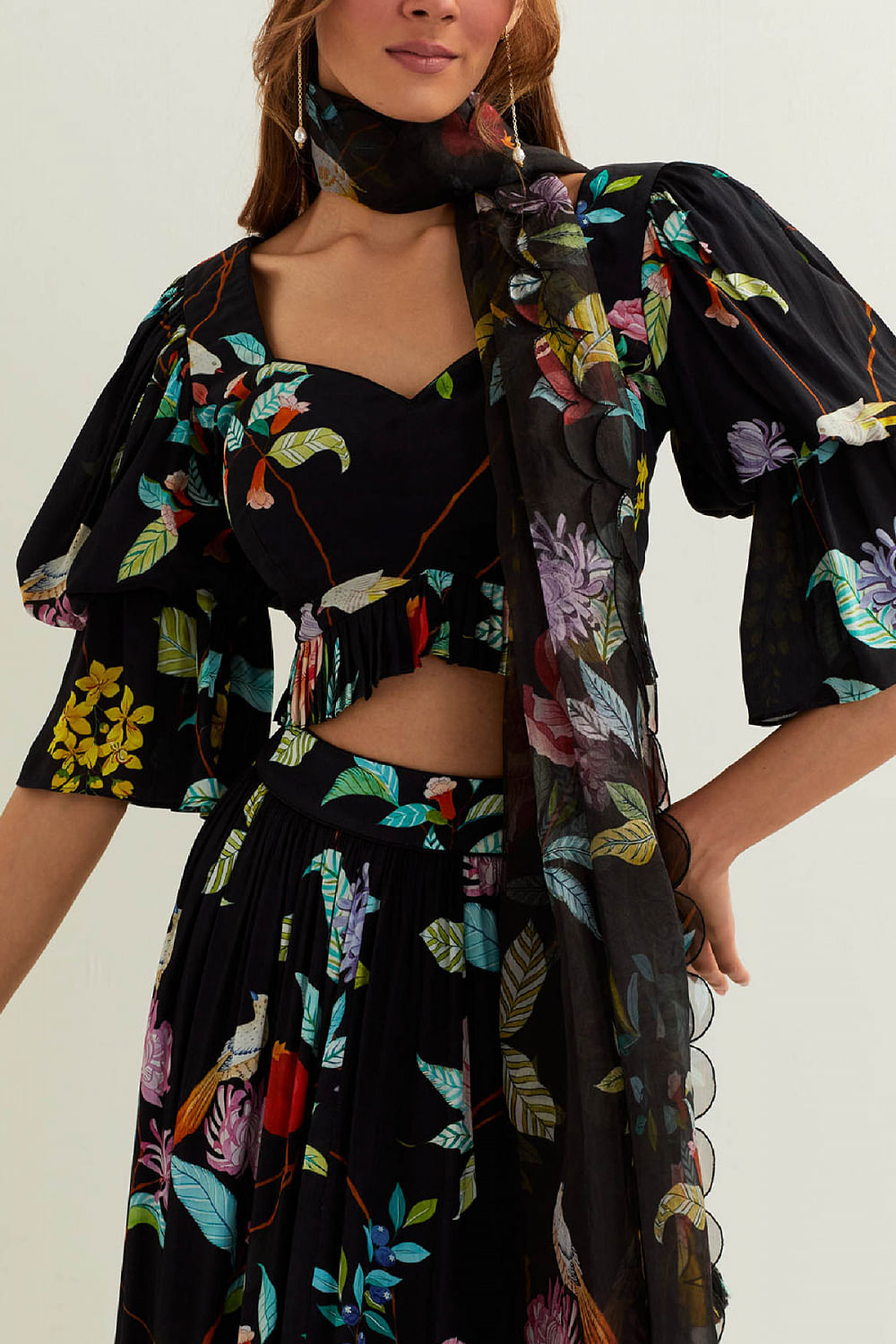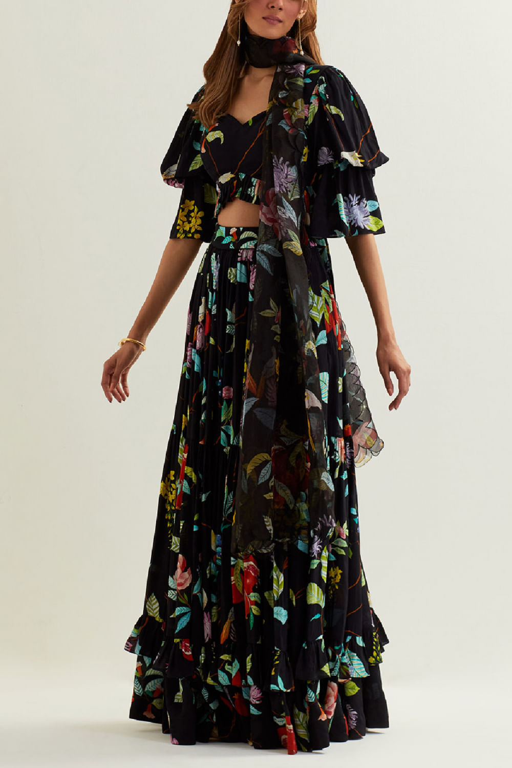 Label Earthan designs this eye-catching lehenga in organza enriched with floral prints and frill detailing, teaming it with a matching blouse and a matching scallop dupatta. Style the look with oversized hoops and strappy heels for summer festivities.