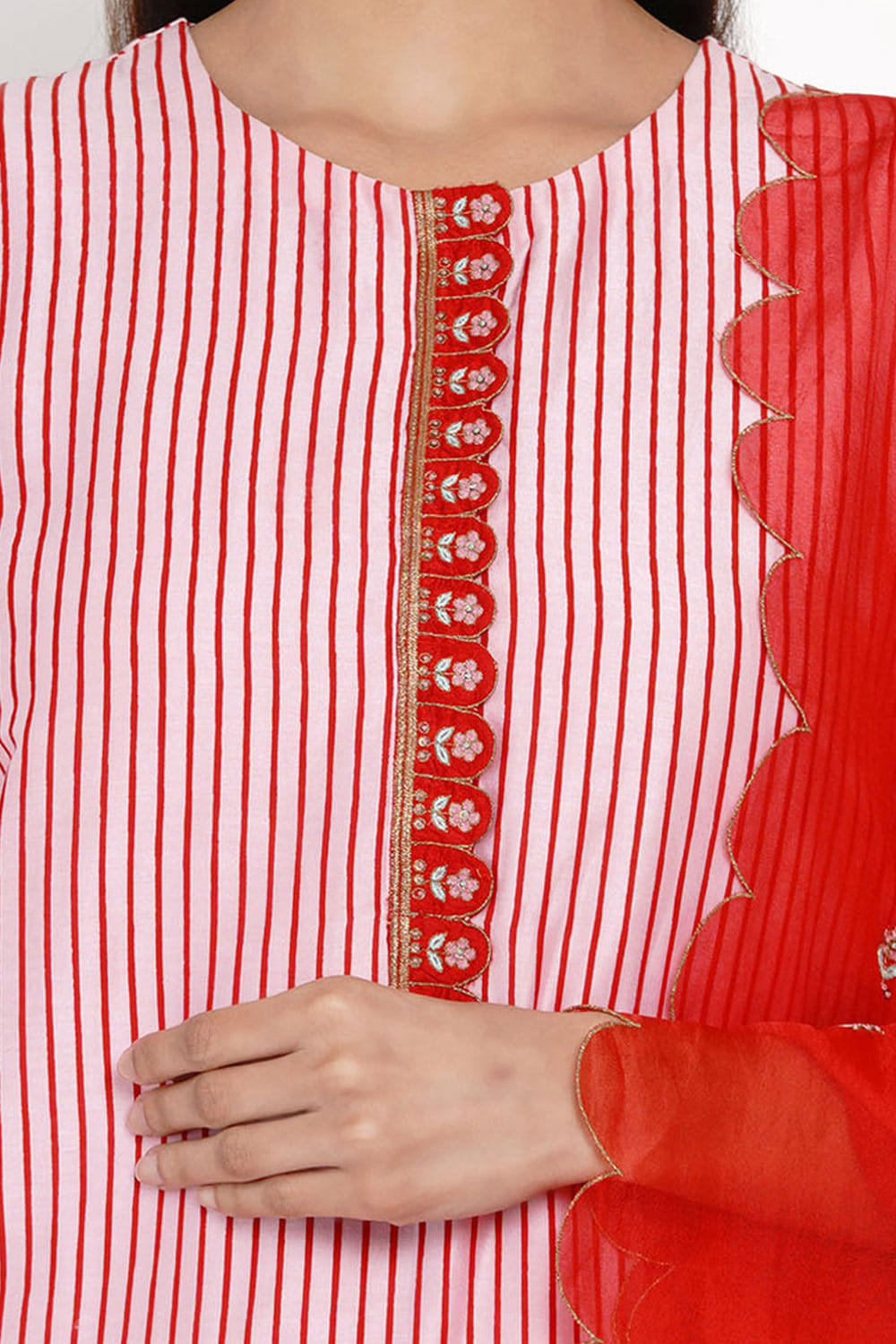 Label Earthen designs a radiant festive look with this striped kurta featuring resham and scallop embroidery, teamed with pants and an embroidered organza dupatta. Style the look with a potli bag and chandbaalis.