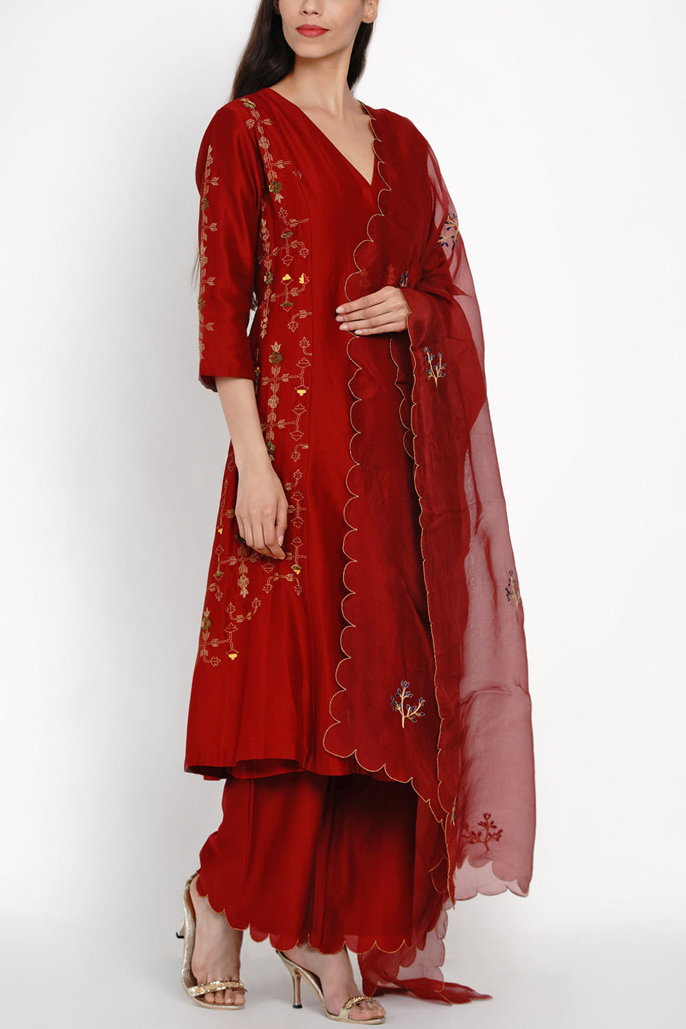 Label Earthen designs a trousseau-worthy ensemble with this chanderi silk kalidaar kurta featuring resham hand embroidery, teamed with a pants and an embroidered silk dupatta. Style the look with a pair of kundan earrings.
