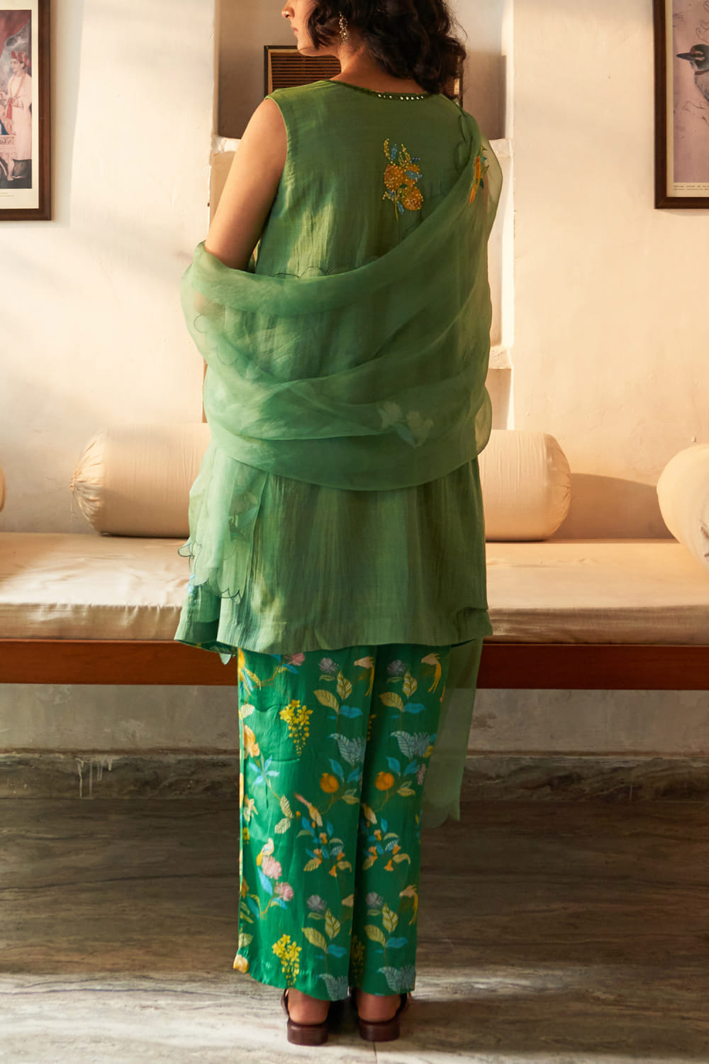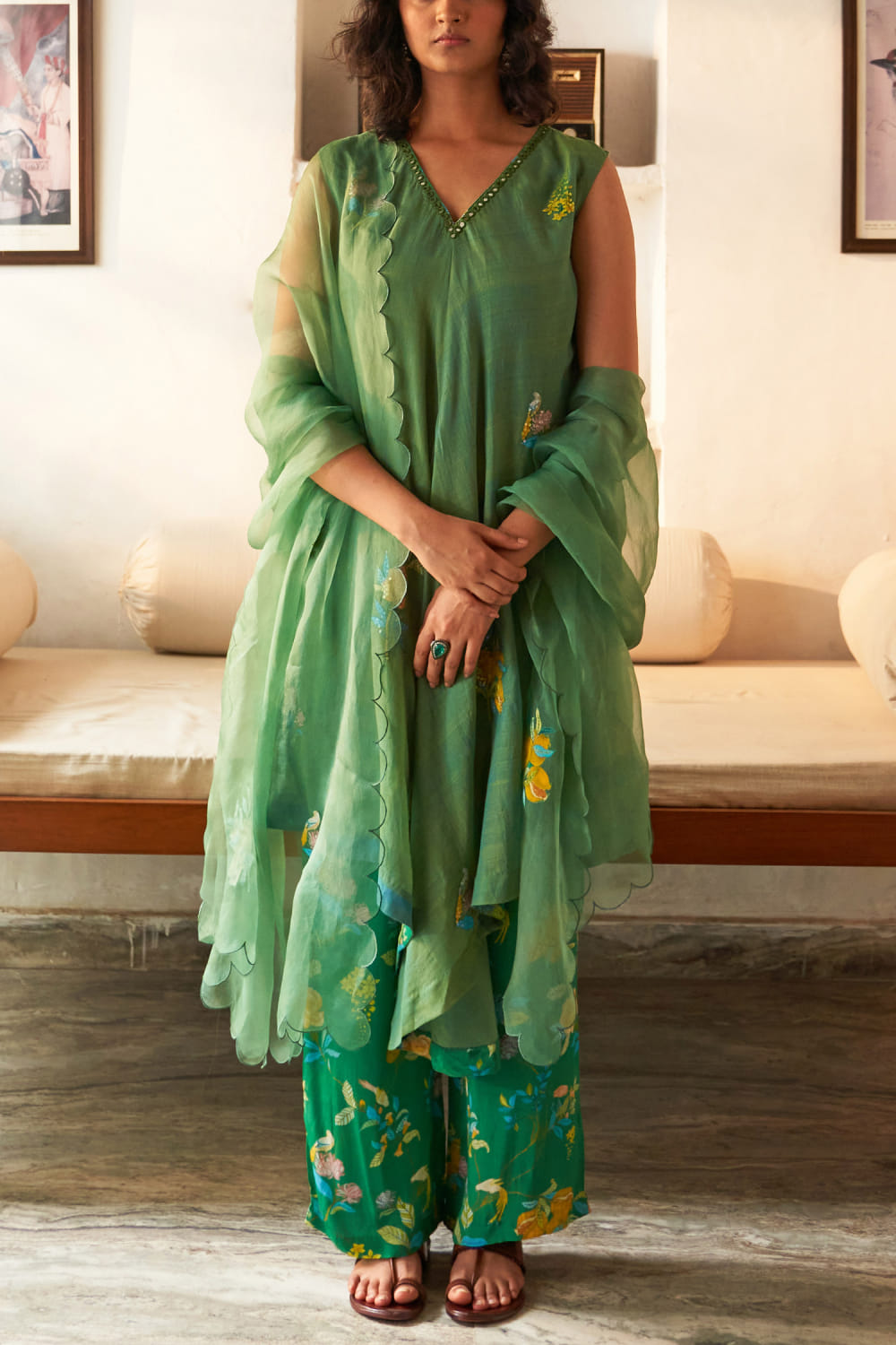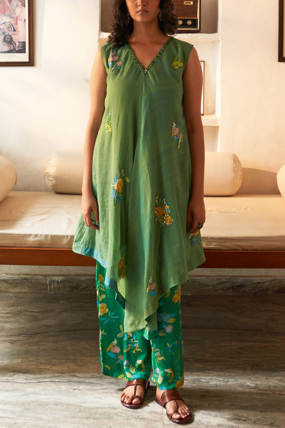 Label Earthen designs this modern sleeveless kurta handwoven in mangalgiri cotton with sequins and applique embroidery detailing in floral motifs featuring mirror work in an asymmetrical silhouette, pairing it with printed pants and a matching scalloped dupatta. Style the look with an emerald choker and stackable bangles.