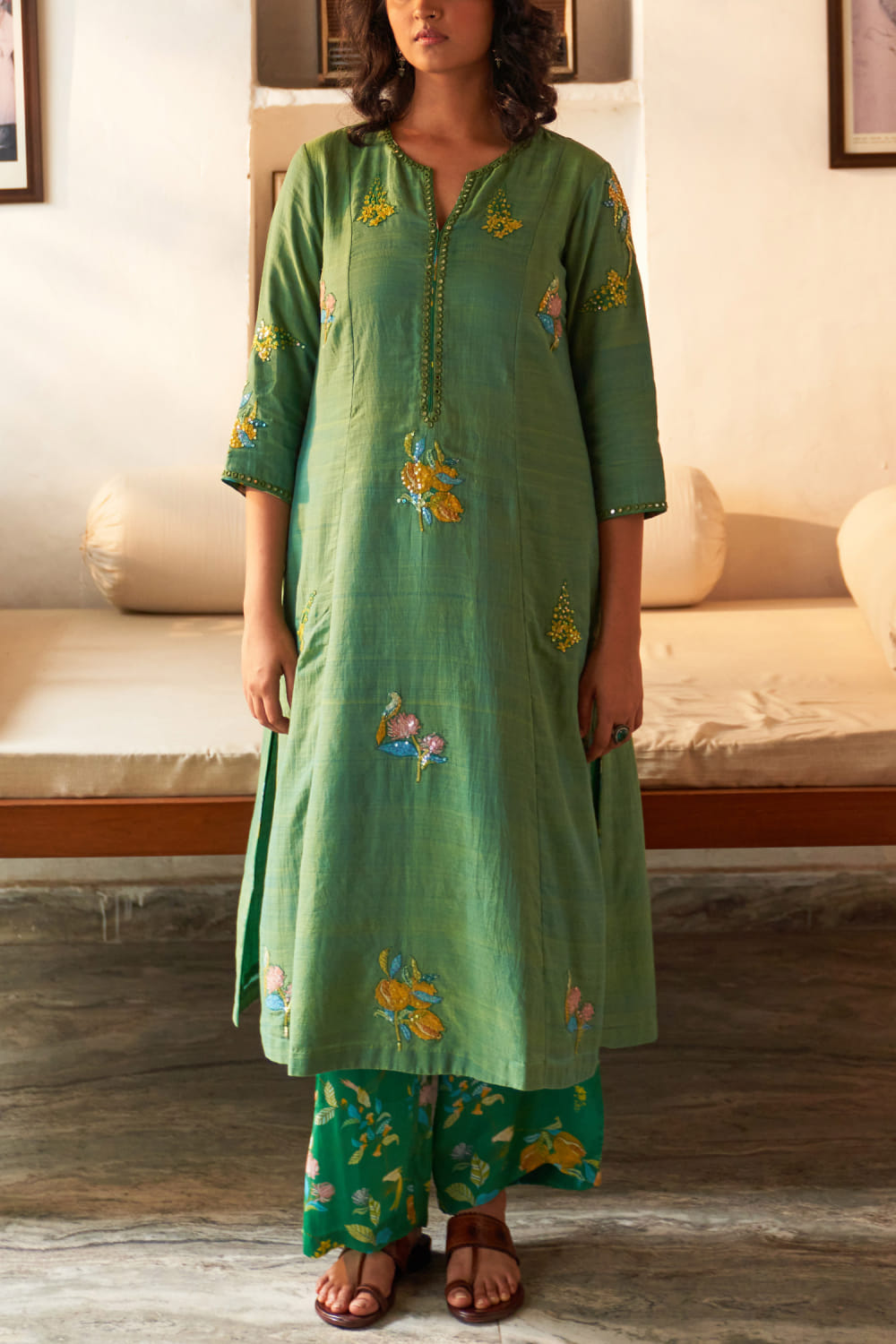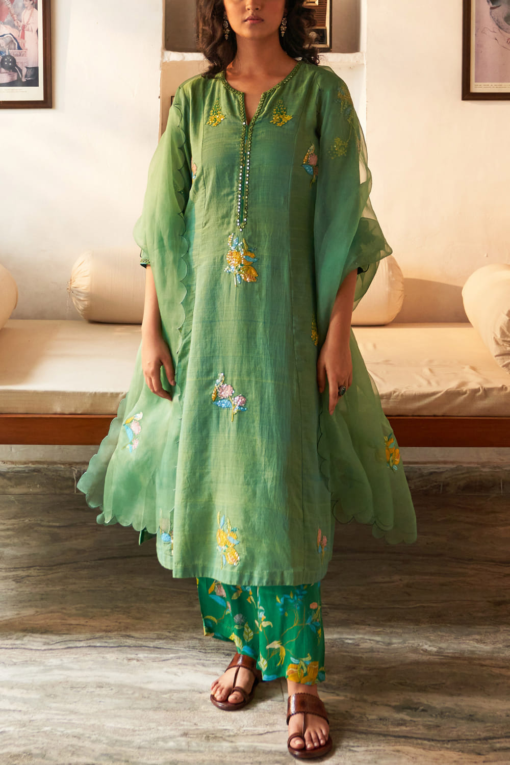 Label Earthen designs this timeless kurta handwoven in mangalgiri cotton with sequins and applique embroidery detailing in floral motifs featuring mirror work, teaming it with printed pants and a matching scalloped dupatta. Style the look with silver jhumkas and juttis for festivities.