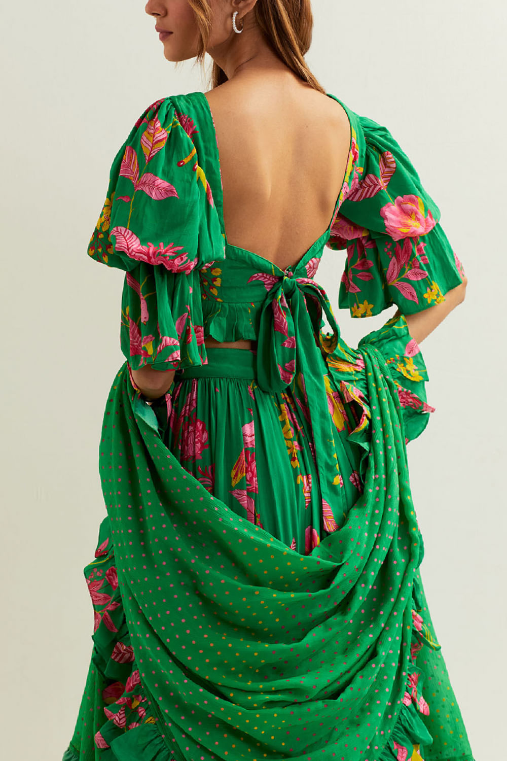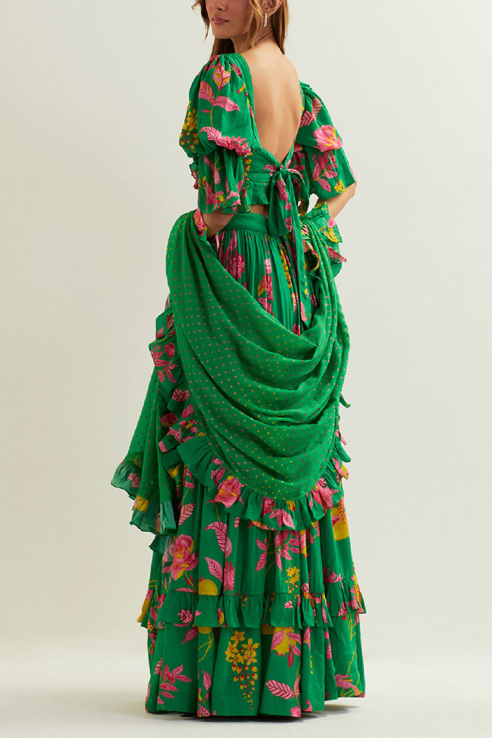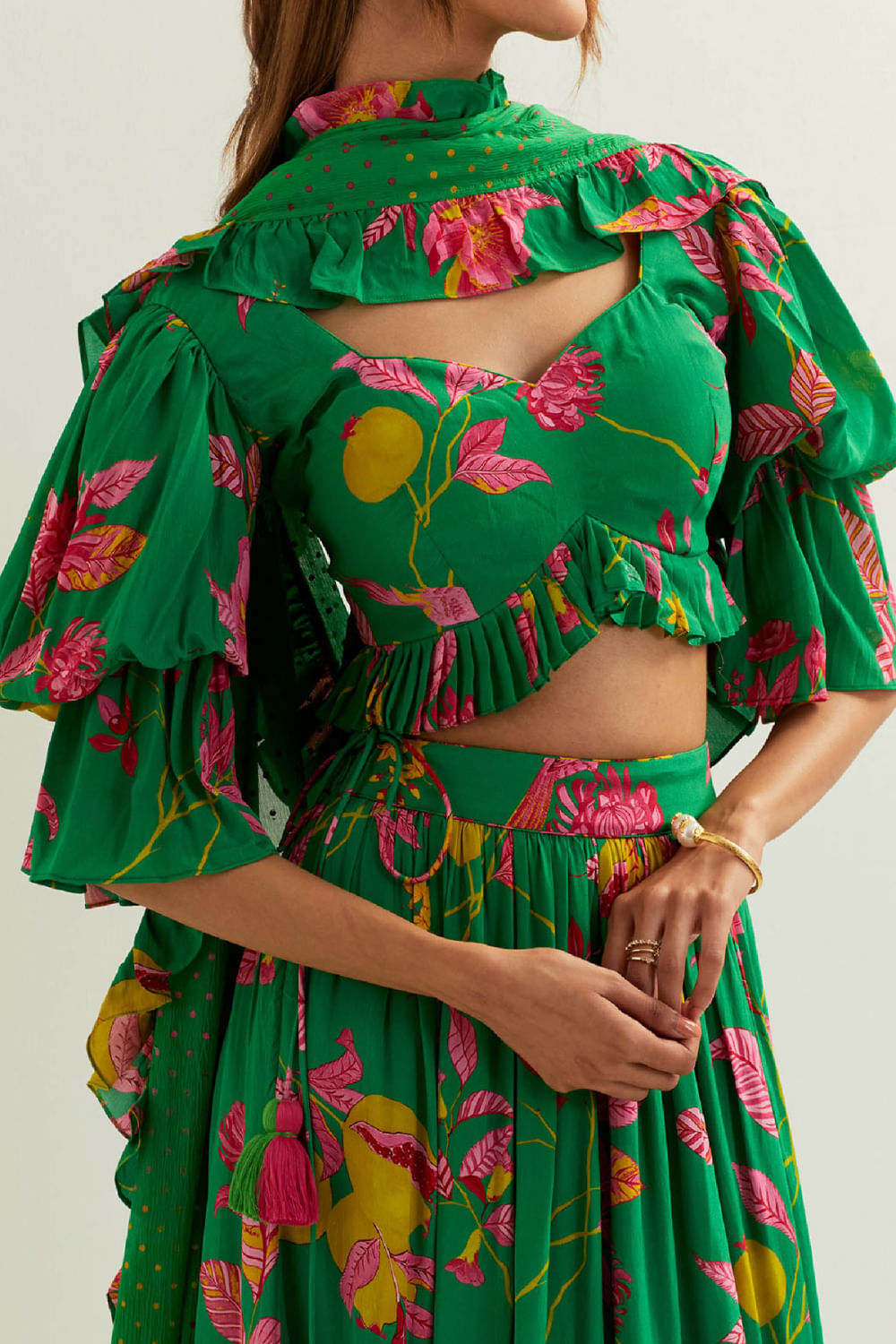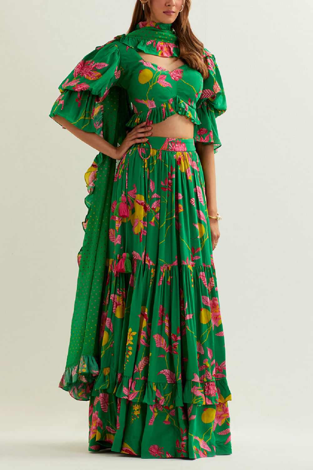 Label Earthen designs this awe-inspiring tiered lehenga enriched with floral prints and frill highlights featuring gathered and pleated detailing. It is teamed with a matching blouse and a polka dot-printed dupatta. Style the look with chandelier earrings and embroidered juttis for a festive occasion.