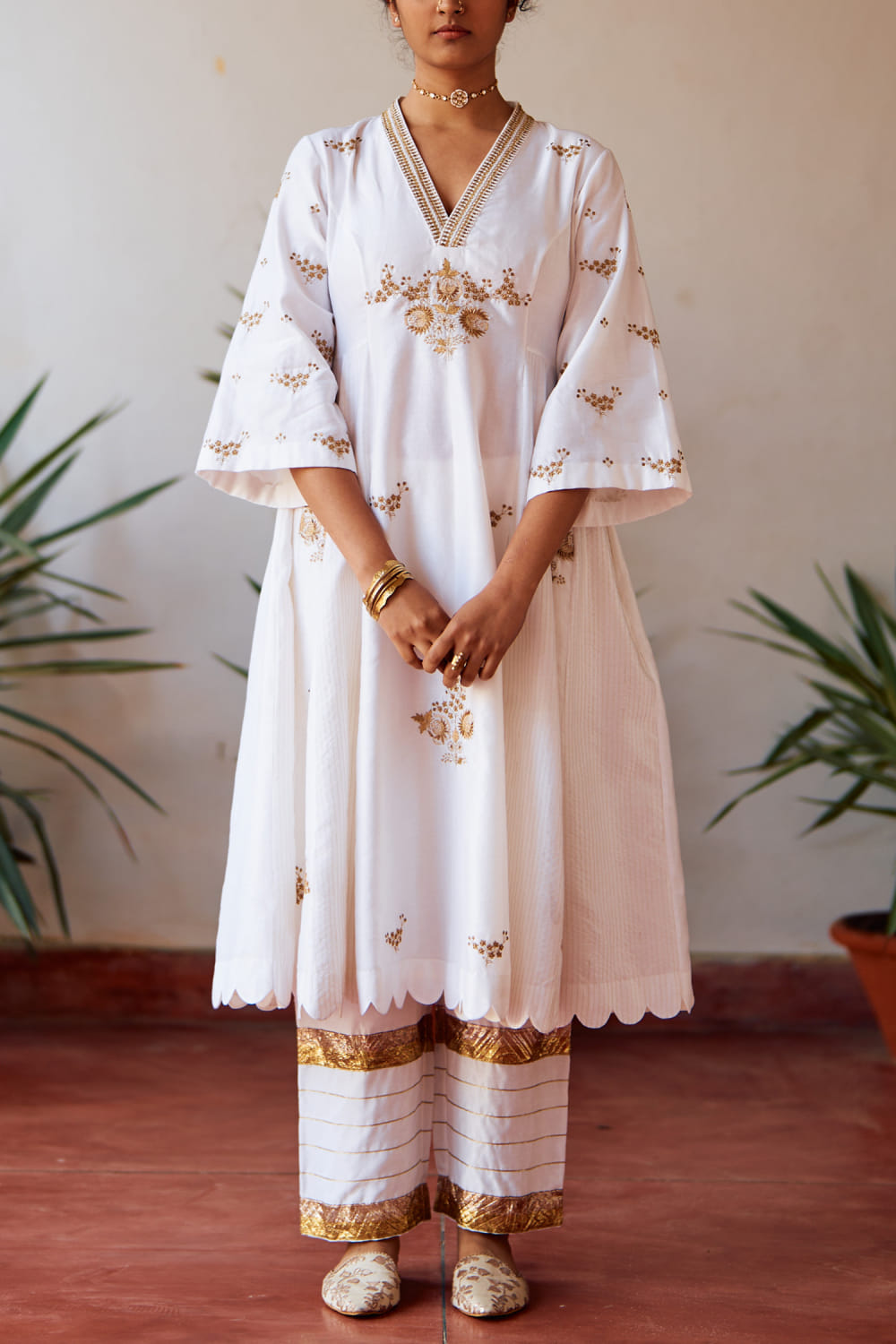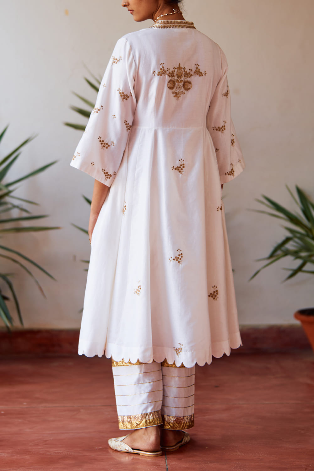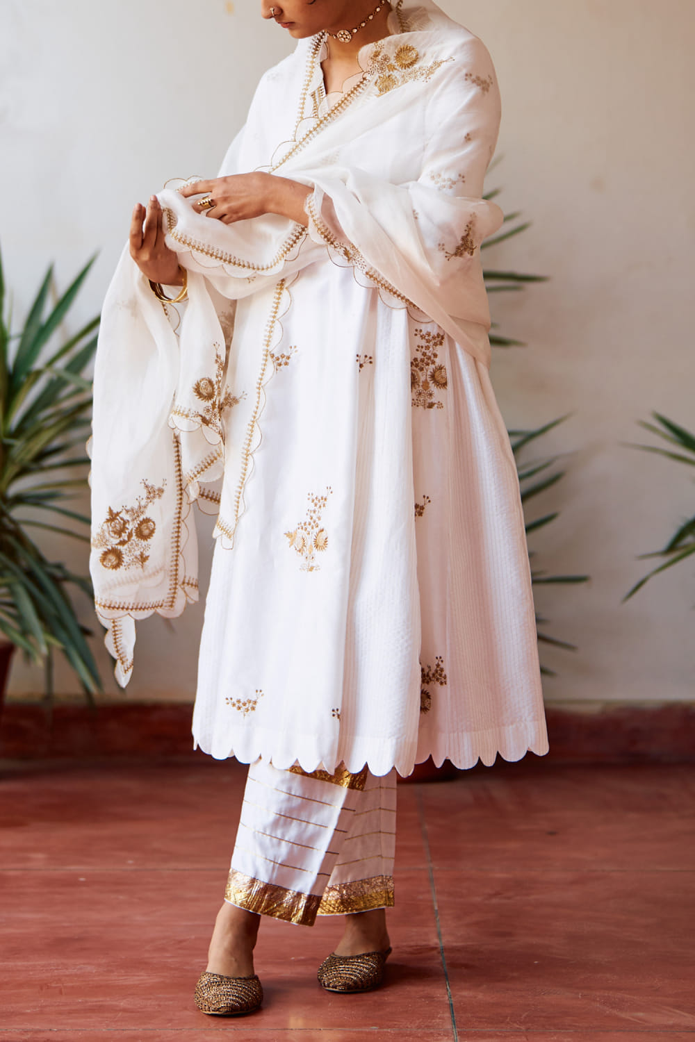 Label Earthen introduces this exquisite ensemble featuring an ivory hand-embroidered chanderi silk kalidar kurta paired with an organza embroidered dupatta and pants, exuding elegance and grace. Elevate your look with delicate silver jewellery and nude heels for a sophisticated ensemble perfect for wedding occasions.