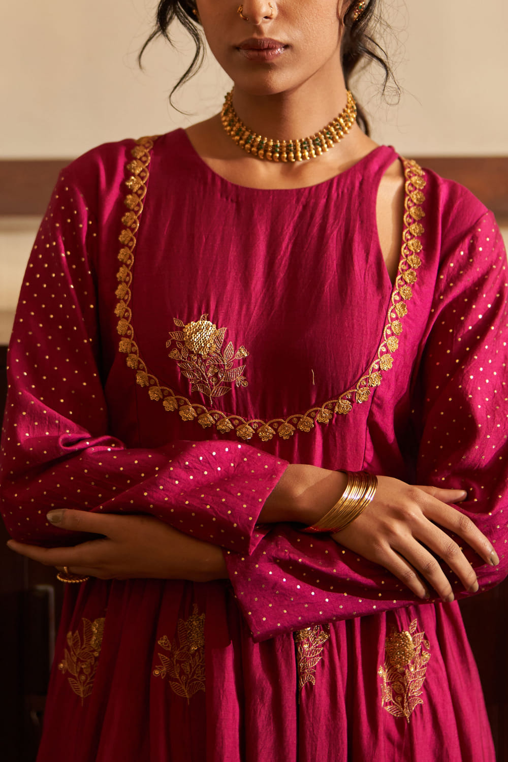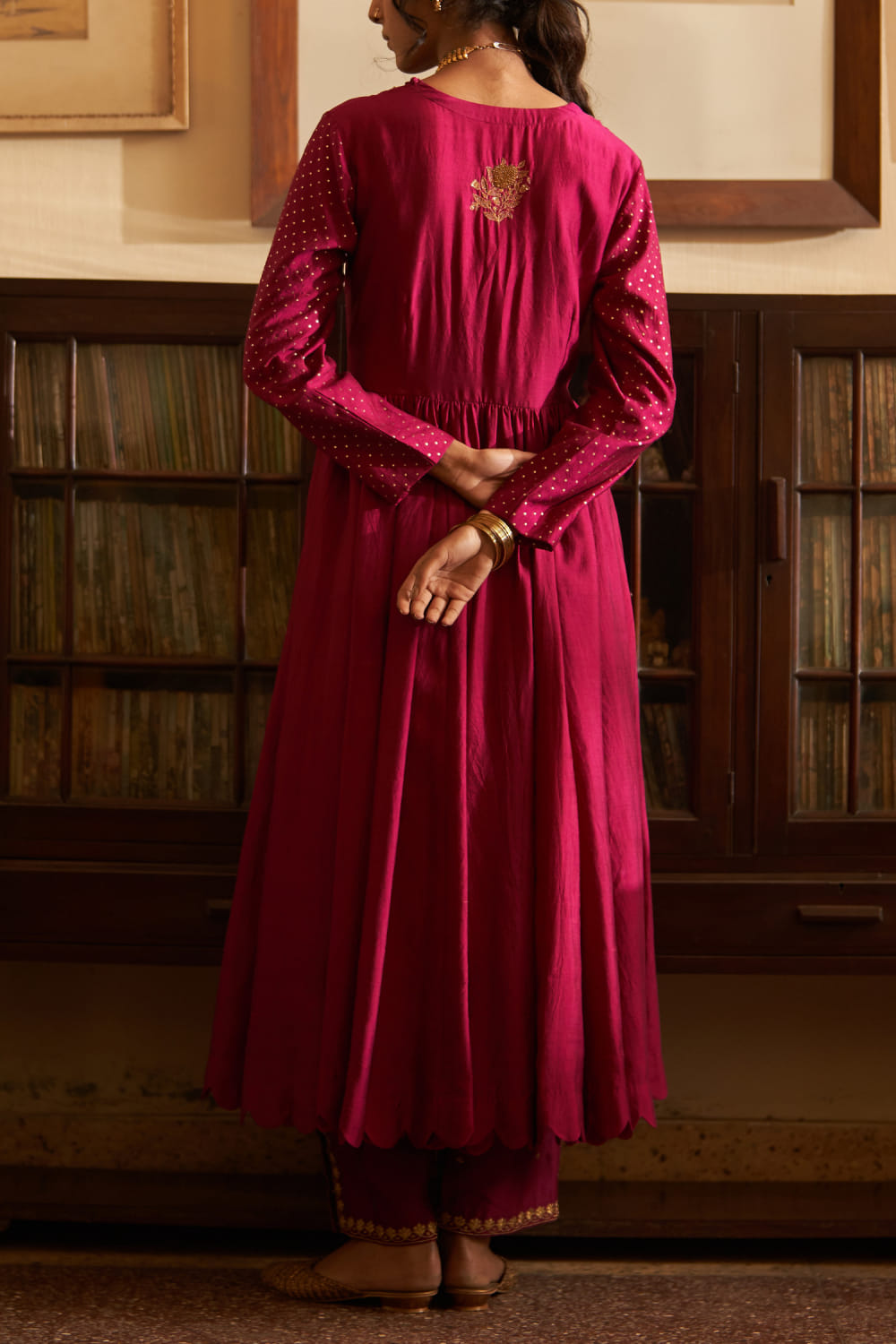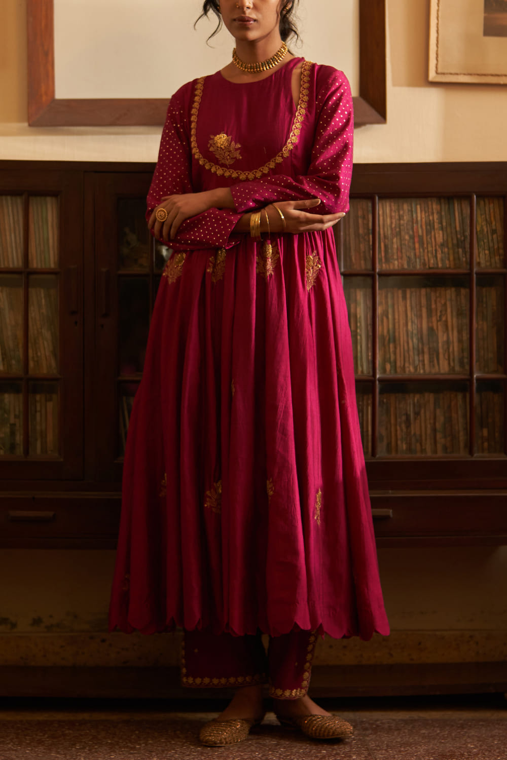 Label Earthen presents the royal magenta sequin splendour kalidar kurta with dupatta and pants, dazzling with intricate zari work and drizzling sequins for a regal presence. Complete your look with statement kundan jewellery and a potli bag for wedding festivities.