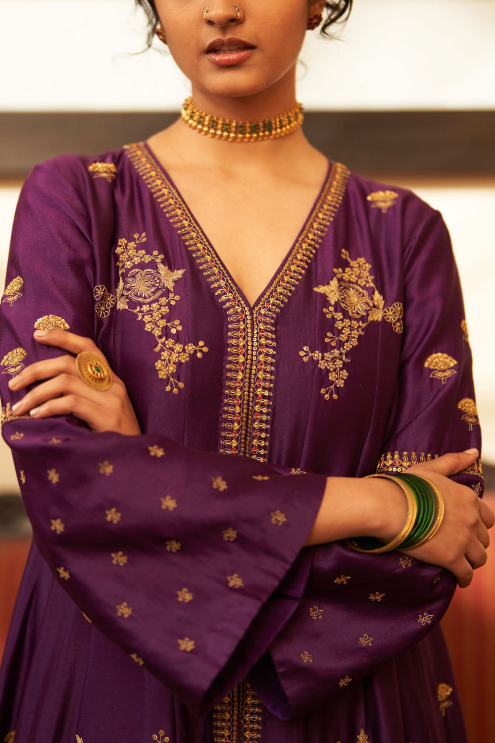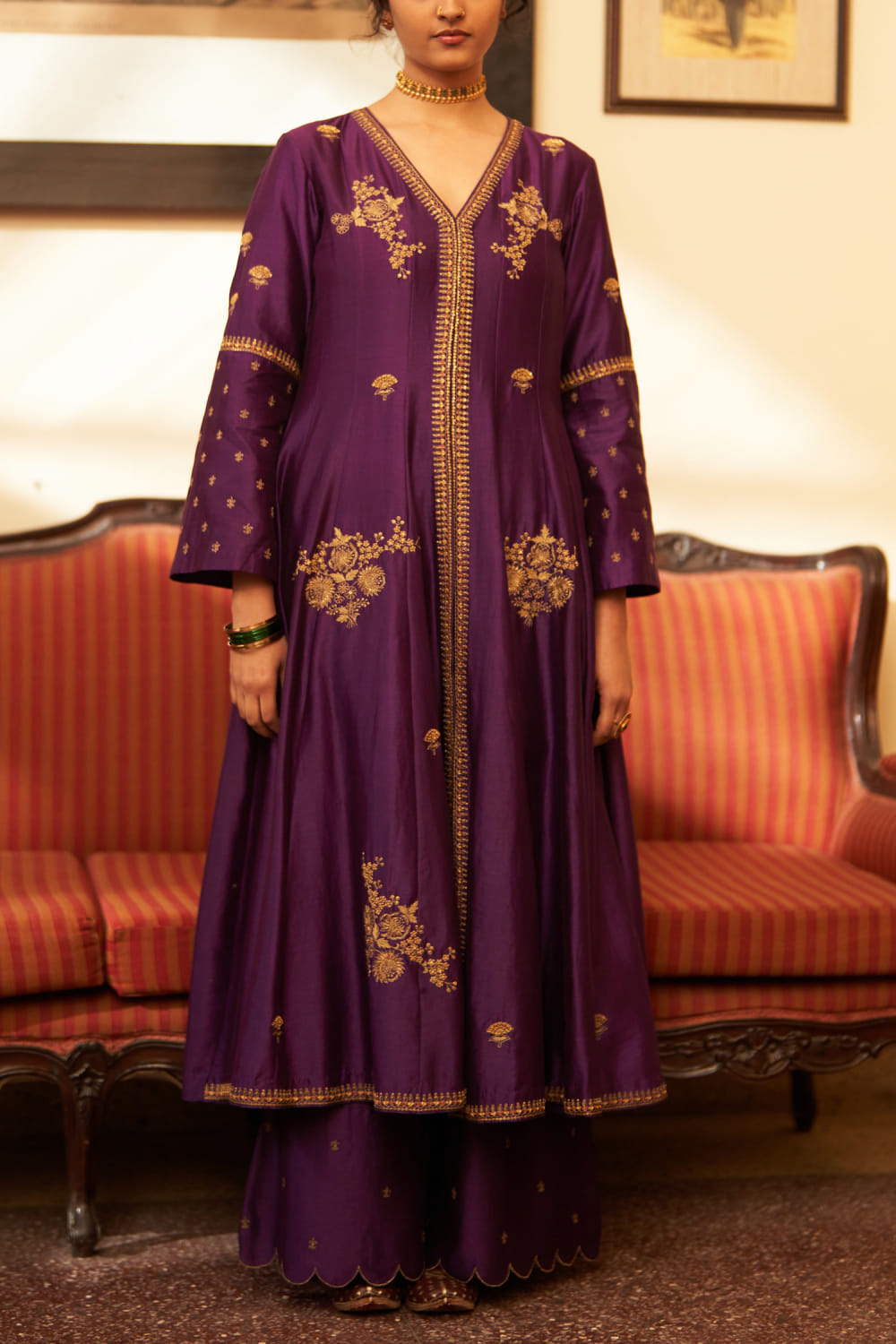 Label Earthen presents this exquisite front-open kalidar kurta adorned with hand-embroidered resham and sequins featuring zari work, paired gracefully with featherlight organza dupatta and palazzo pants, creating a striking ensemble in luxurious simplicity. Elevate your look by accessorizing with delicate gold jewellery and nude heels for an elegant touch suitable for any special occasion.