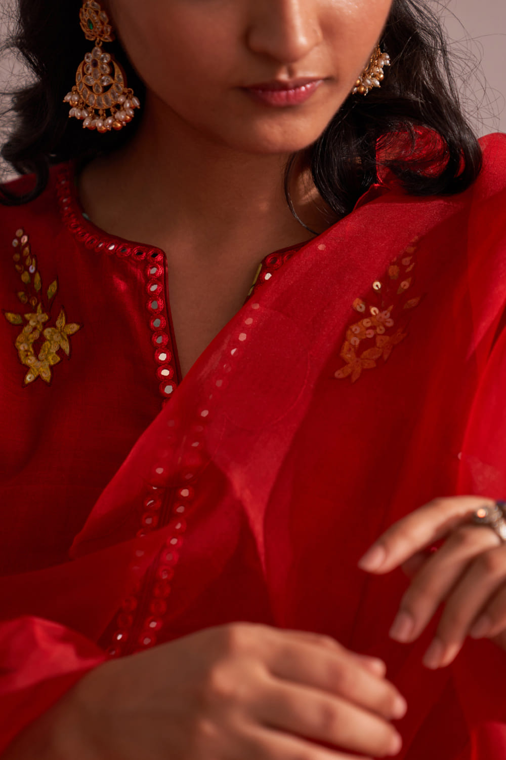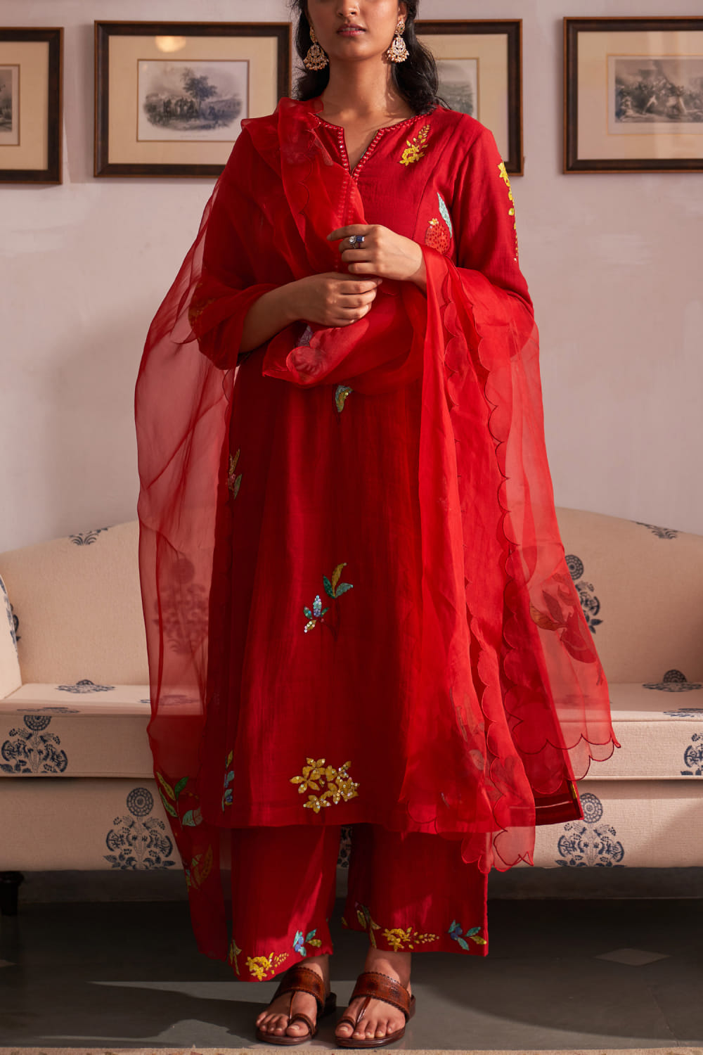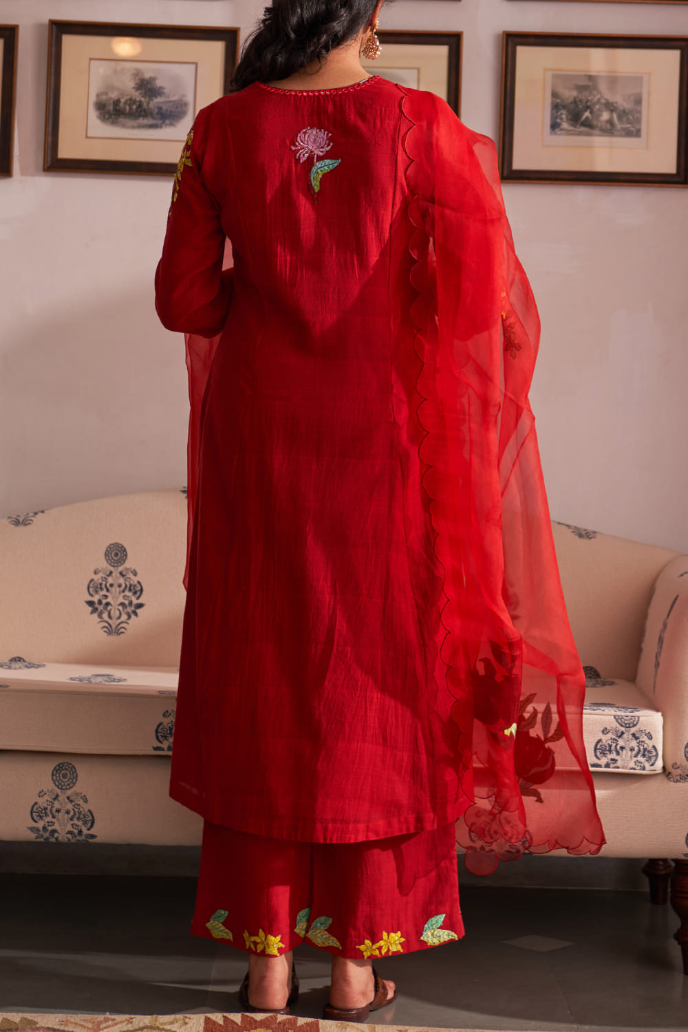 Red floral applique kurta set