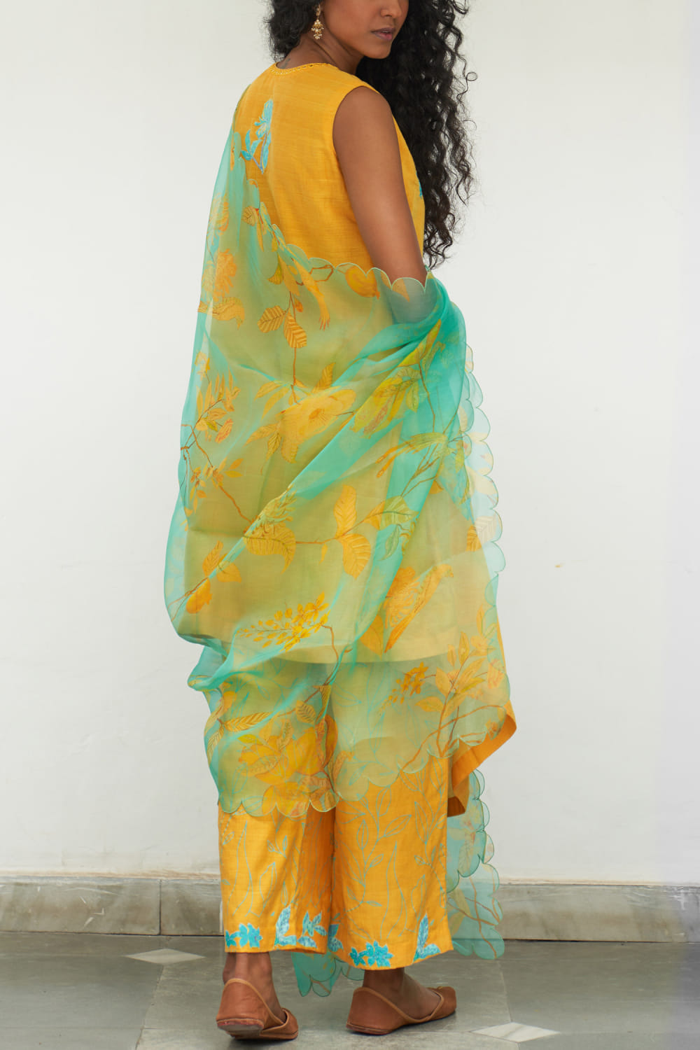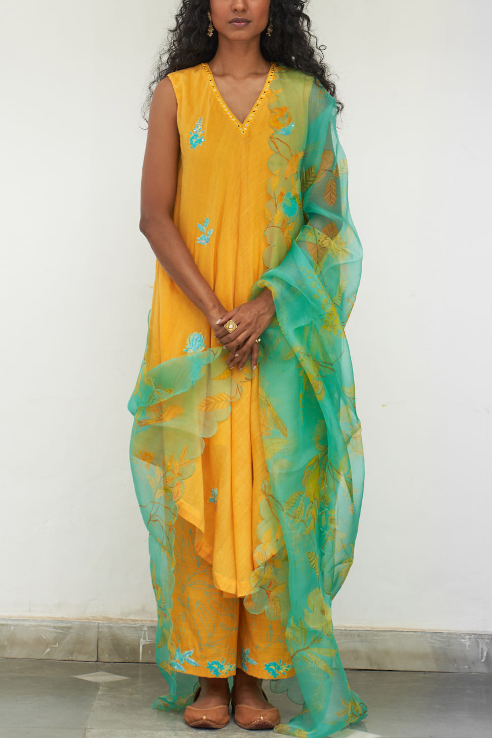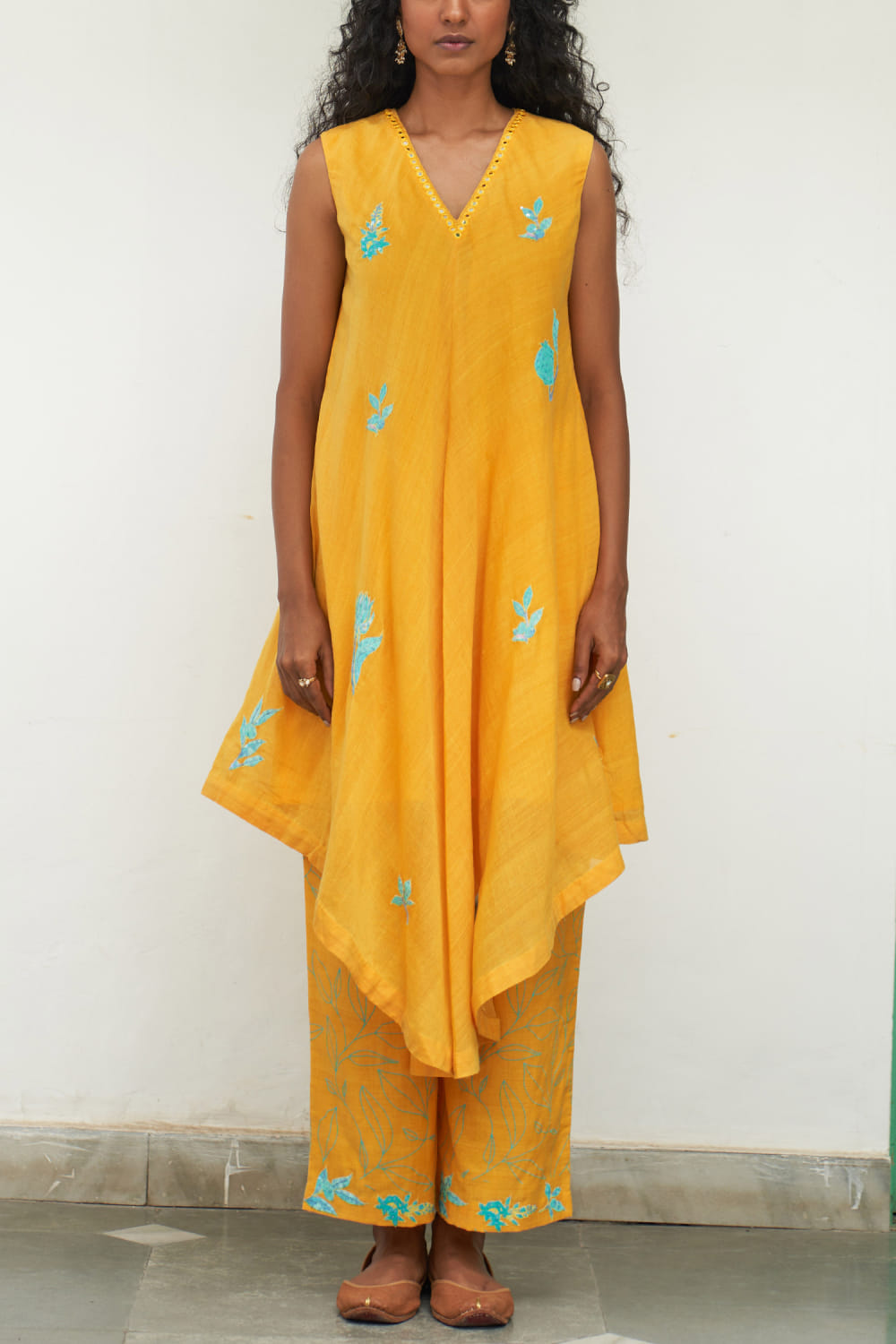 Label Earthen designs this classic sleeveless kurta handwoven in mangalgiri cotton with sequins and applique embroidery detailing in floral motifs featuring mirror work in an asymmetrical silhouette, teaming it with matching printed pants and a matching printed scalloped dupatta. Style the look with polki earrings and mules.