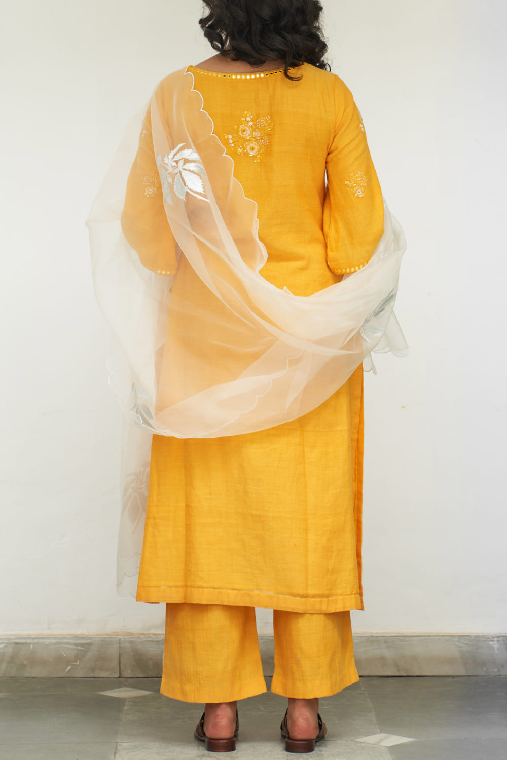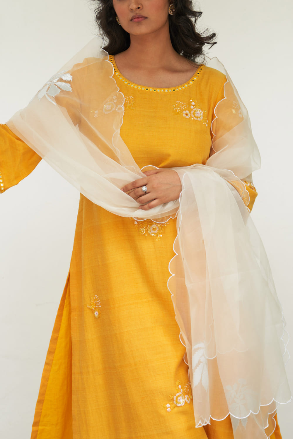 Label Earthen designs this exquisite kurta handwoven in mangalgiri cotton with sequins and resham embroidery detailing in floral motifs featuring mirror work, teaming it with matching pants and a contrasting appliqued scalloped dupatta. Style the look with pearl danglers and kolhapuri wedges.