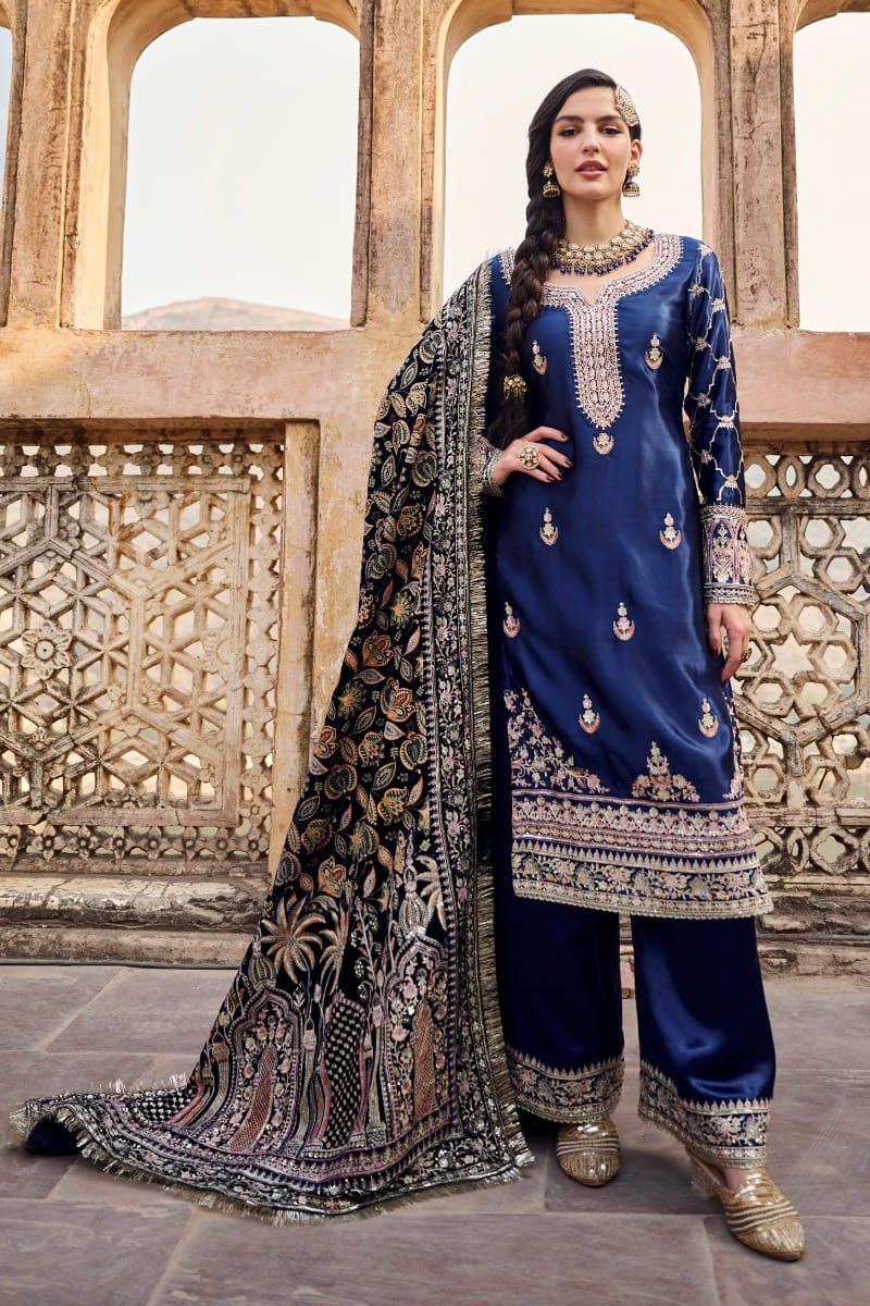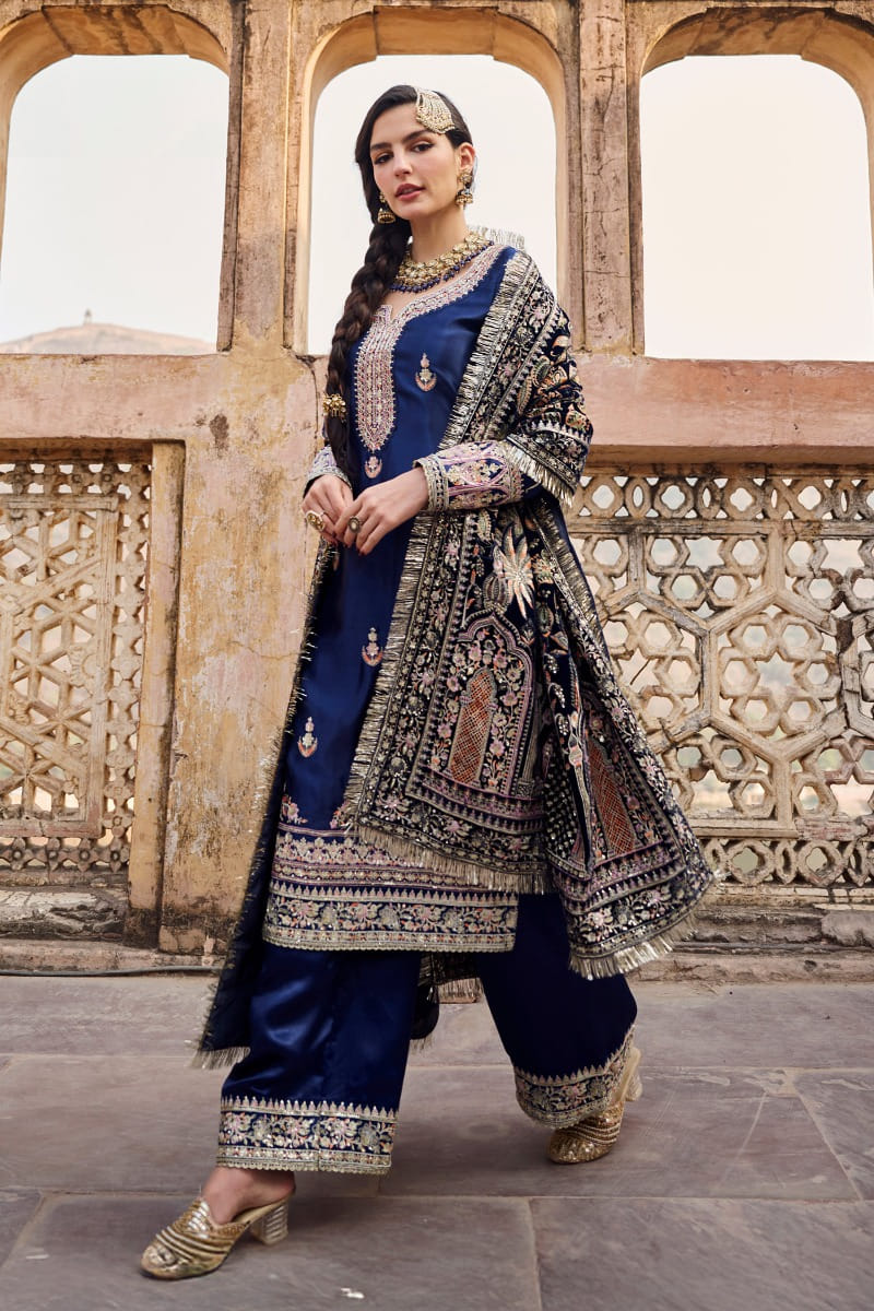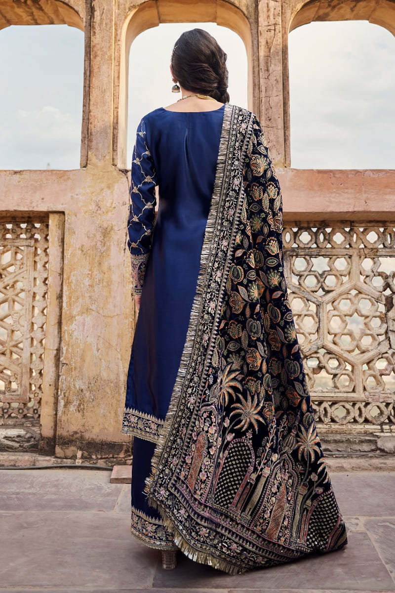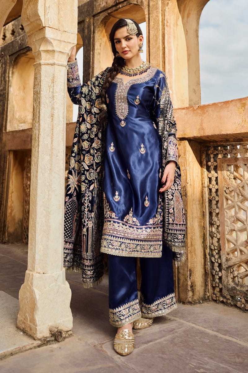 Blue zari and thread embroidered kurta set