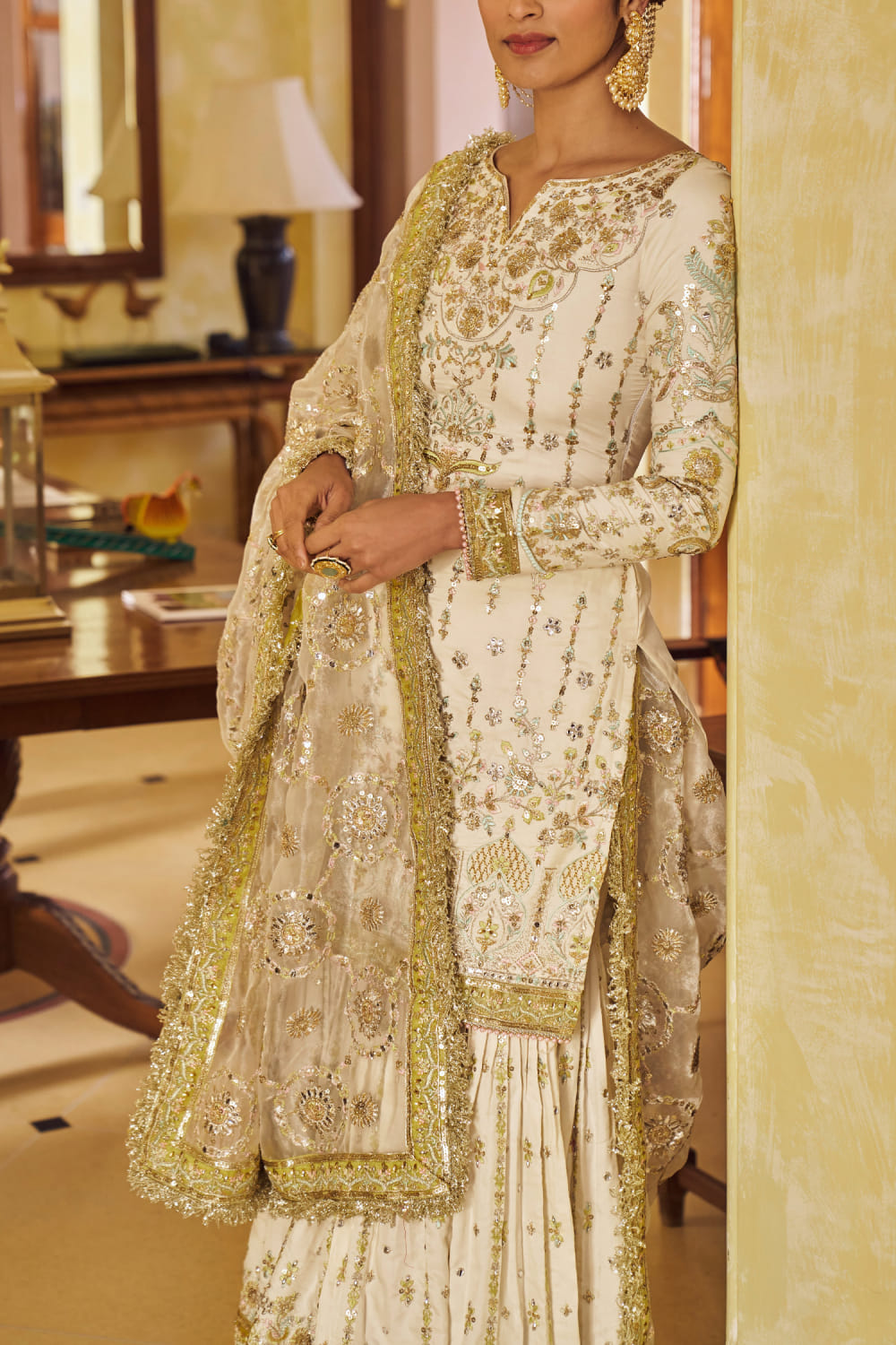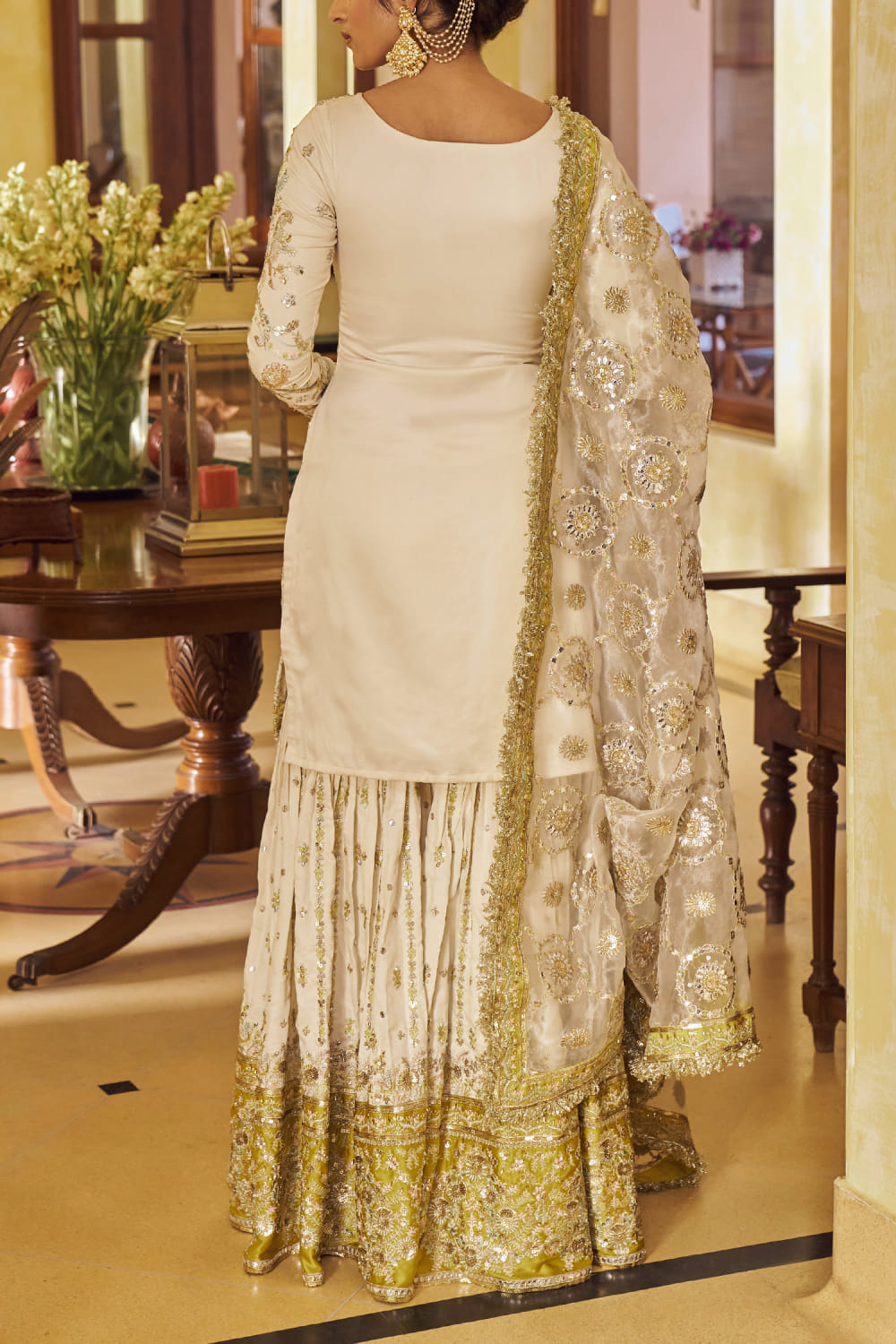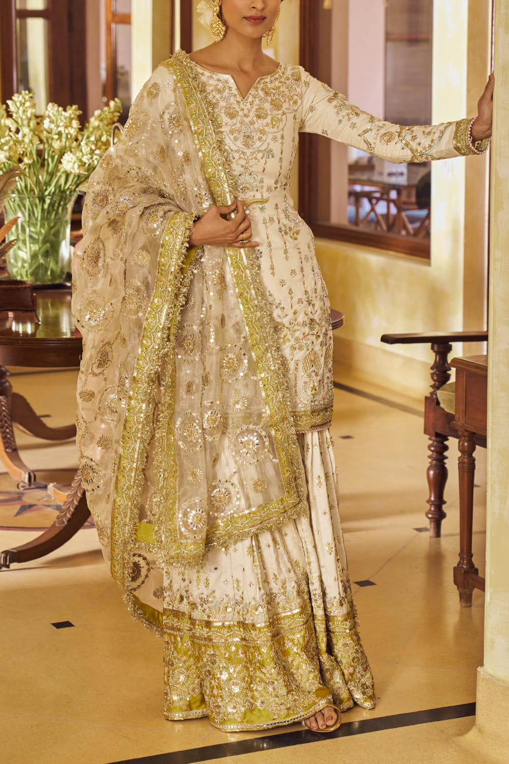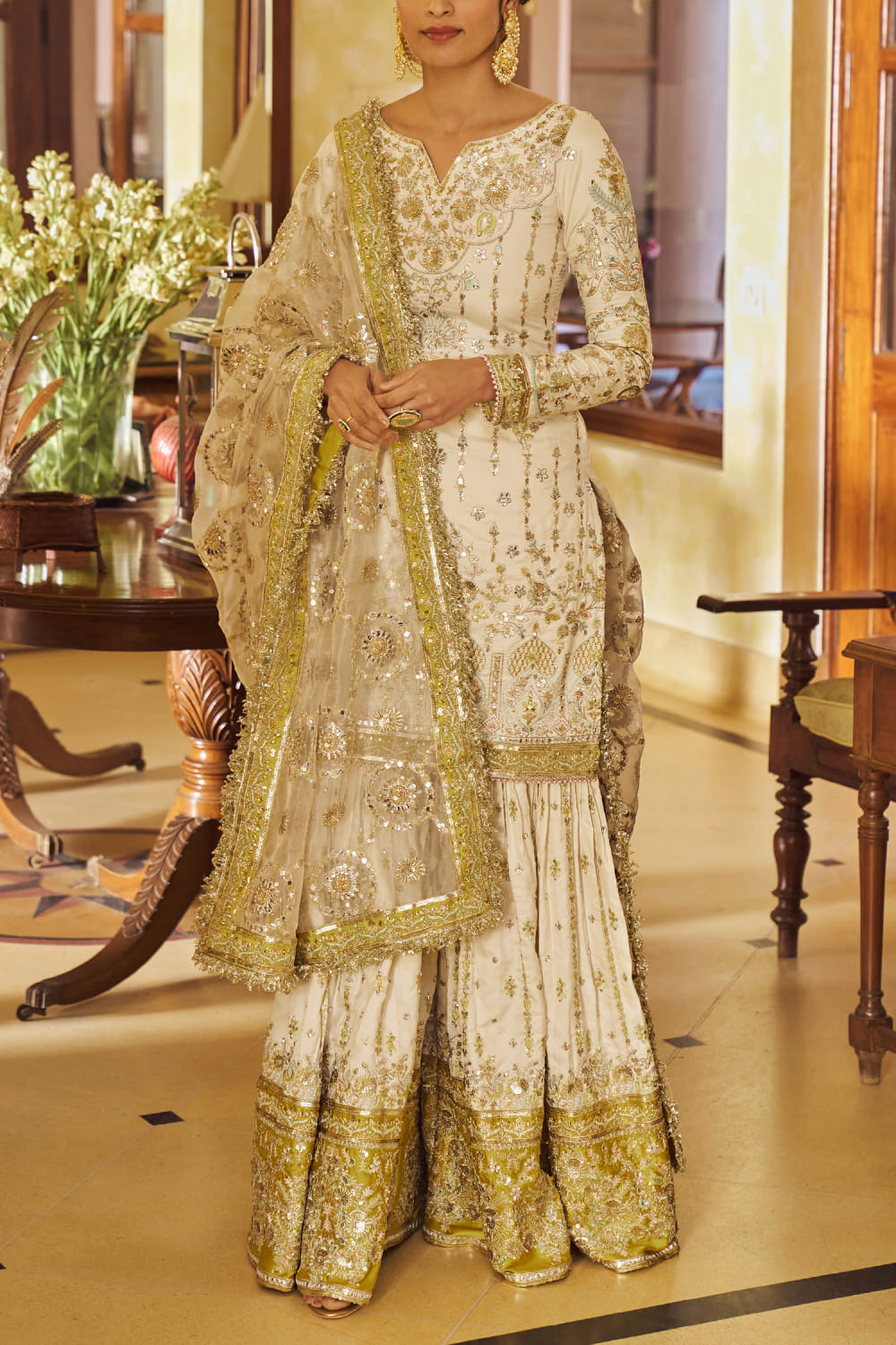 Cream and gold floral embroidered gharara set