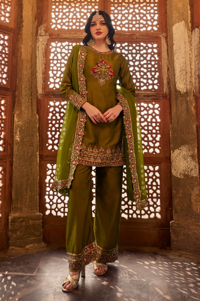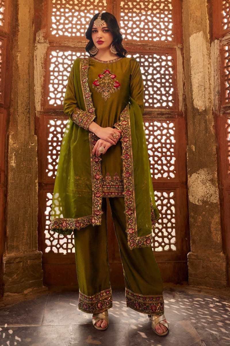 Lashkaraa designs this traditional kurta rendered in silk and adorned with floral embroidery featuring sequins, zari and thread work. It is complemented by silk pants and a matching dupatta. Style the look with gold jhumkas and embellished heels for a festive puja gathering.