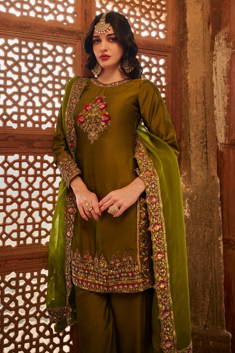 Green floral zari embroidered kurta set