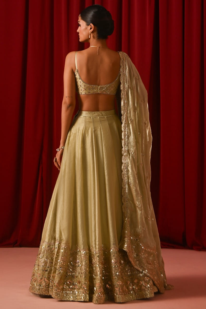 Lashkaraa designs this radiant lehenga in tissue. It features intricate sequin, zari and cord embroidery. It is paired with a blouse and a dupatta. Style the look with statement chandbalis and a metallic clutch for wedding festivities.