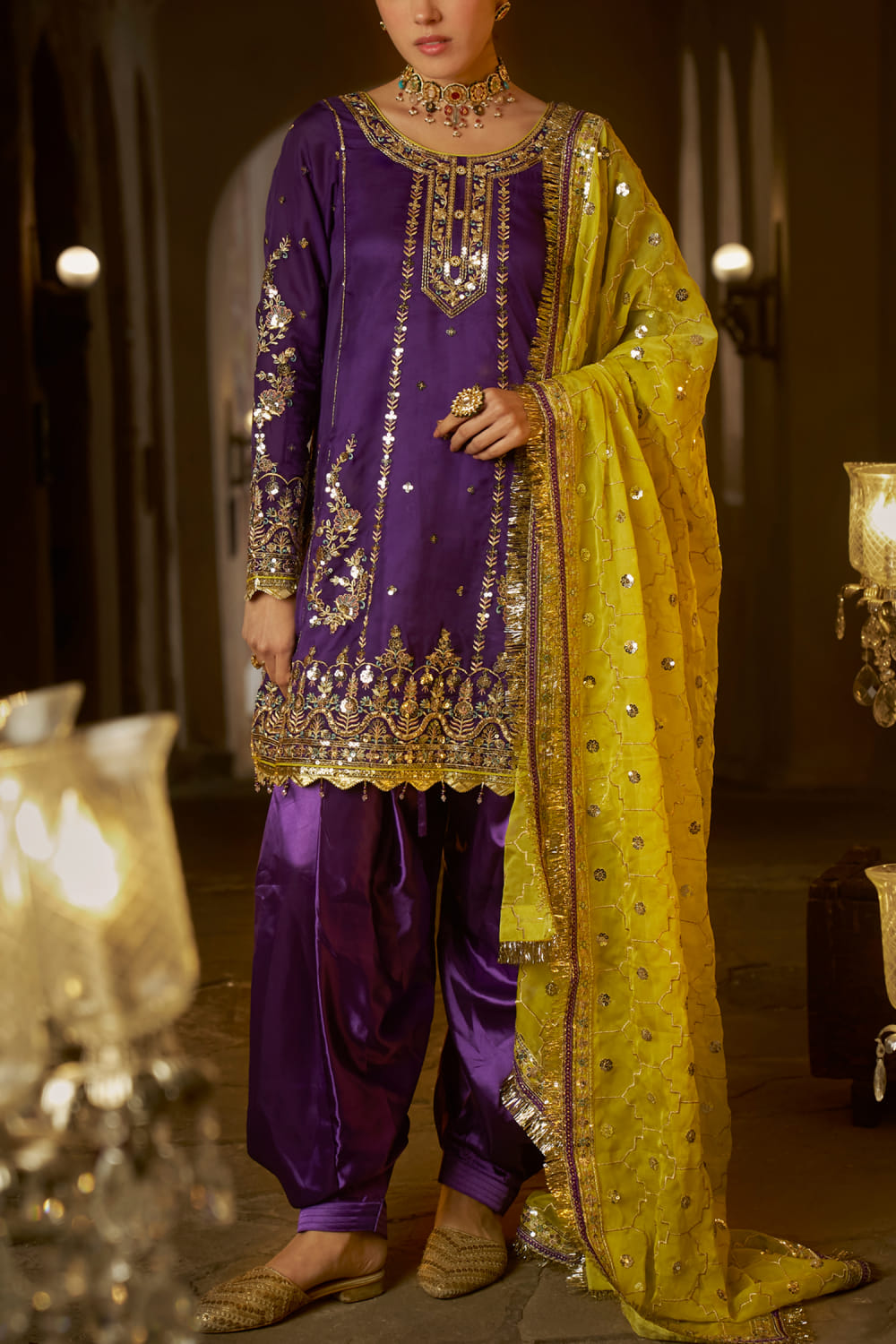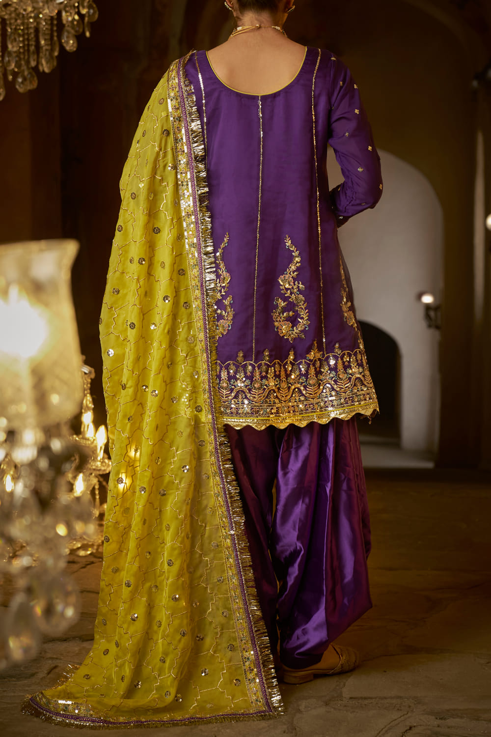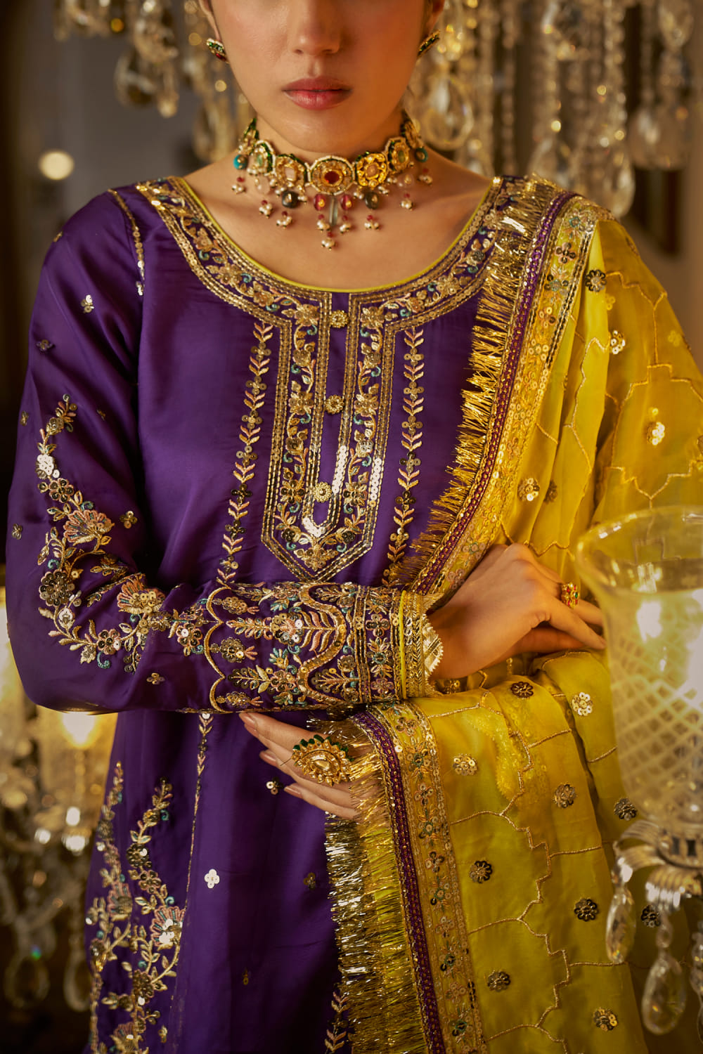Lashkaraa designs this stunning kurta rendered in organza with zari, sequin and thread embroidery detailing in a floral placement pattern featuring tassel detailing on the hem. It is teamed with matching satin pants and a contrasting organza dupatta. Style the look with a vintage necklace and a potli bag for a quintessential ethnic vibe.