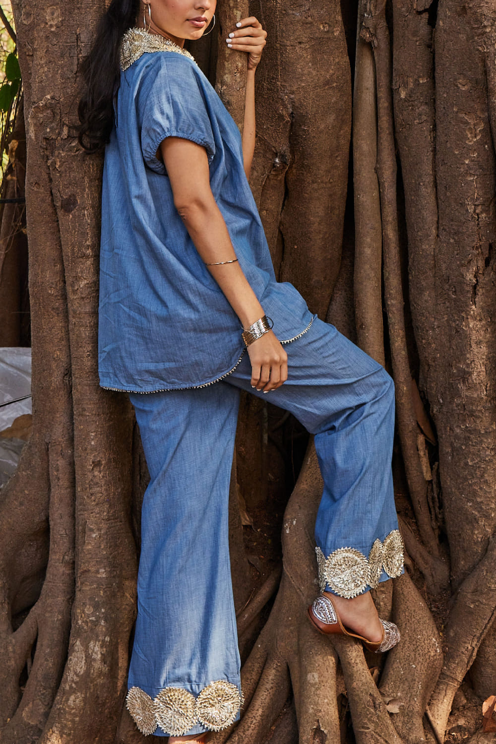 Love Shafali designs this uber-stylish pair of pants embraced in stonewash denim with floral gota embellishments at the hem. Style it with a matching top and mule heels for an occasion. The top here is shown for styling purposes only.