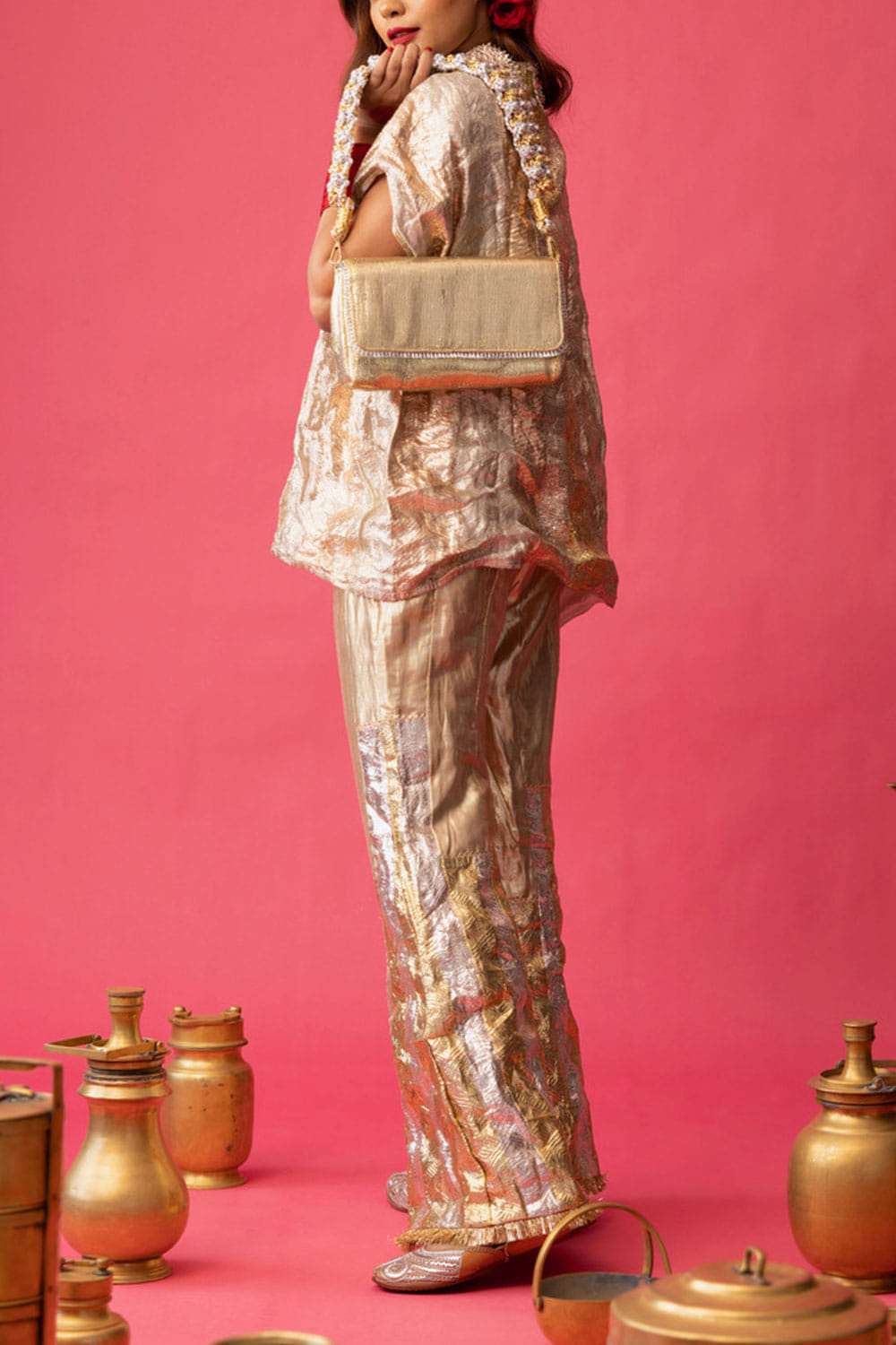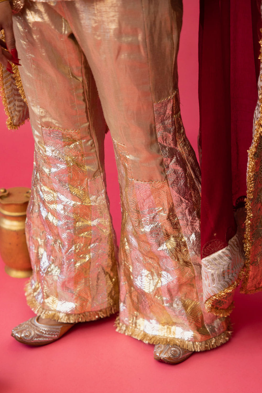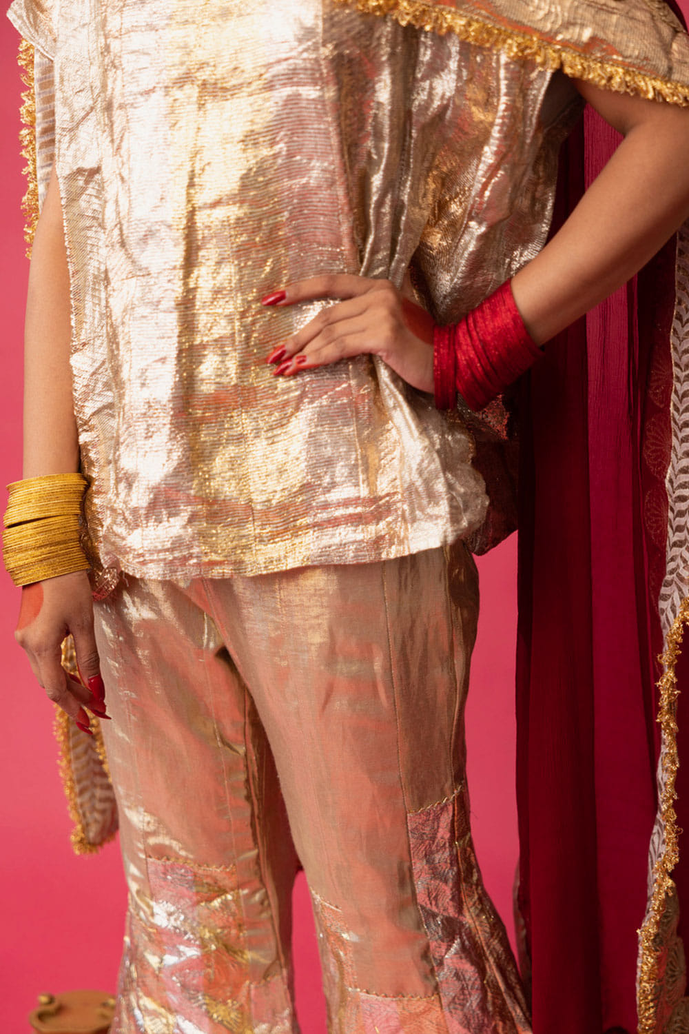 Love Shafali presents a must-have for a contemporary bride with this pair of artsy pants. Worn high on the waist and gently flaring from the knees, these pants are inspired by the New York skyline. Crafted from lurex linen with the signature pure Gota in vertical uneven stripes, these pants exude a fun and stylish 70's vibe. Style them with towering heels and a short kurta.
