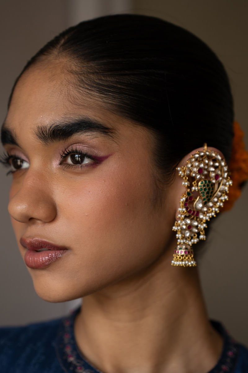 Mahima Mahajan amps up this modal satin sari with artsy print, teaming it with a matching blouse and petticoat. Style the look with a clutch.