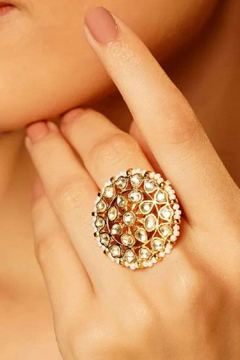 Maisara designs this traditional floral kundan jadau ring with gold polish to make a statement. Style it with a benarasi sari for a festive occasion.