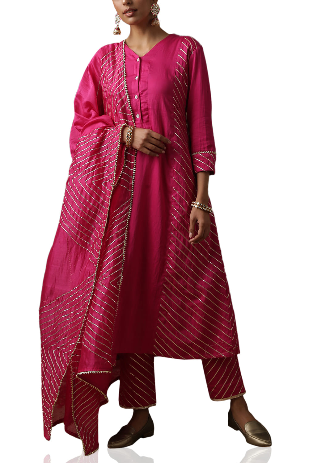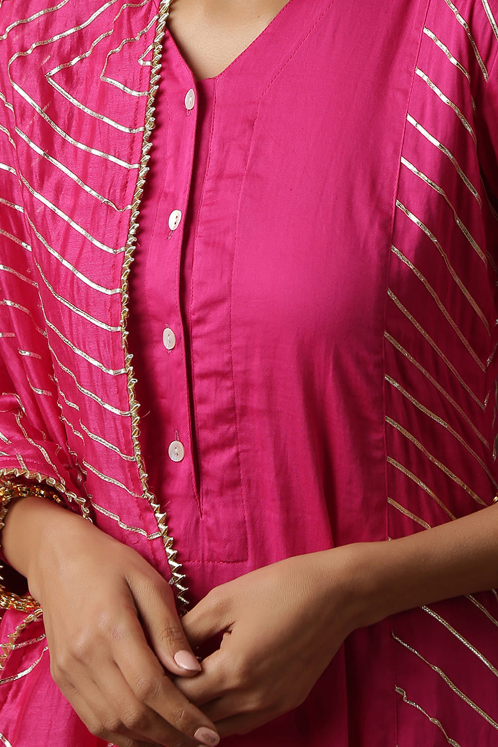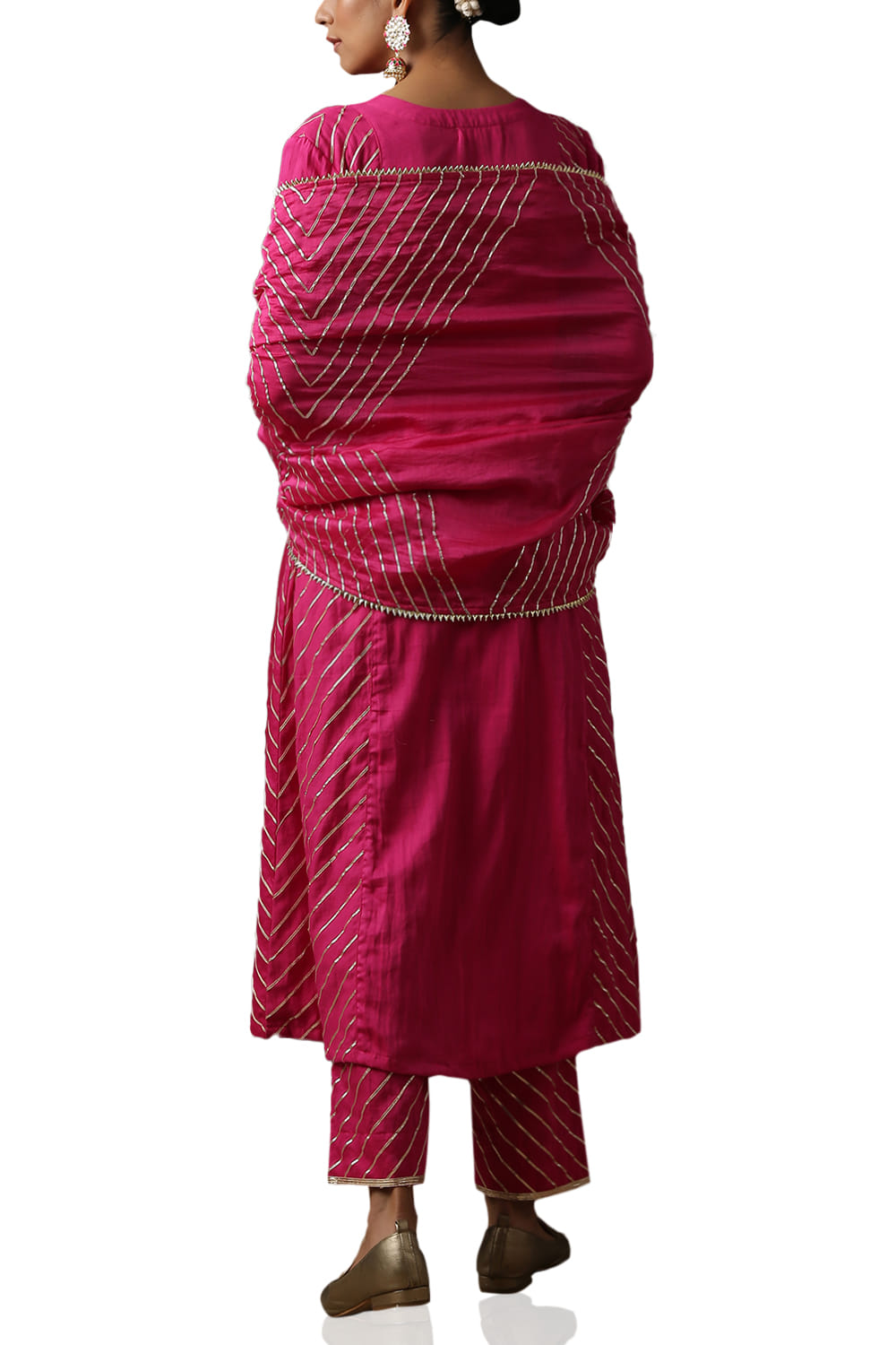 Maison Shefali designs this culture-enriched kurta set in chanderi featuring gota work and mother of pearl buttons, complemented with a heavy gota embellished dupatta and flared pants. Style the look with embroidered juttis and heirloom jewellery.