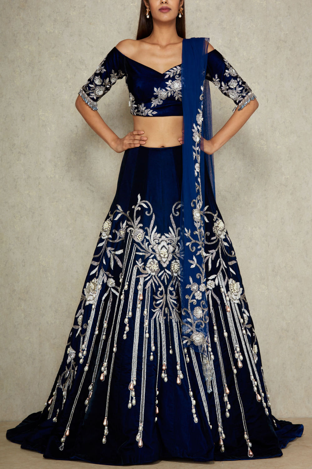 Manish Malhotra oozes glamour in a navy blue pearl embellished velvet lehenga with cancan paired with an off-shoulder blouse and a dupatta in net. Style the look with pearl drop earrings and choker.