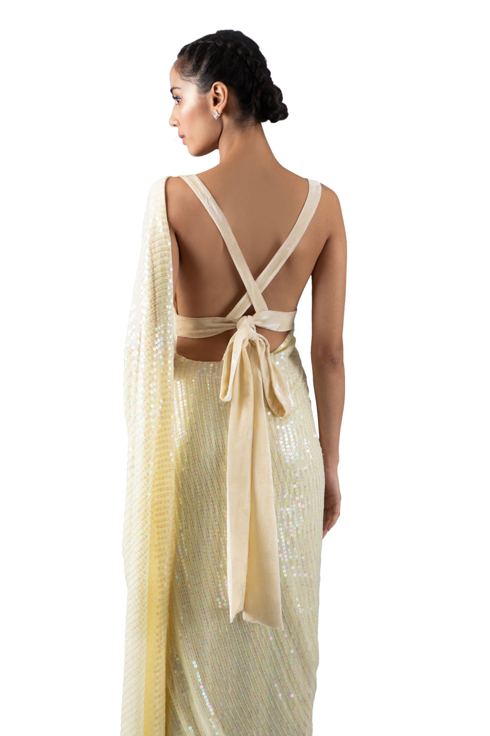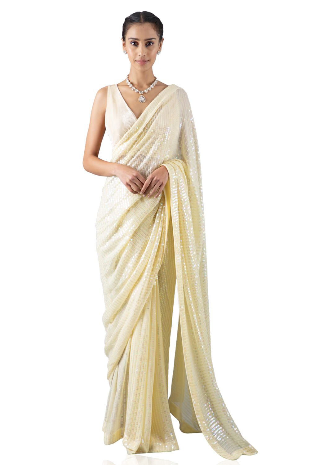 Manish Malhotra defines elegance with this wispy chiffon sari accented with tonal sequin embroidery, paired with a velvet blouse and an in-skirt. Complete the look with sapphire jewels.