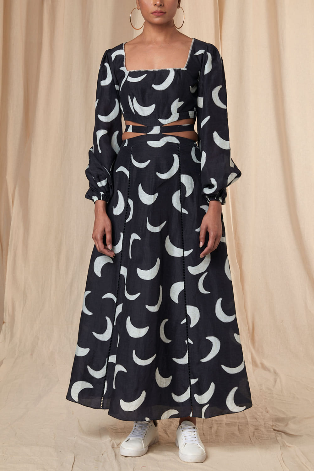 Masaba designs this eye-catching A-line dress crafted in bemberg linen with a square neck, waist cutouts, back tie-up, and puff sleeves in monochromatic crescent moon prints. Style the look with drop earrings and heel sandals for a family outing.