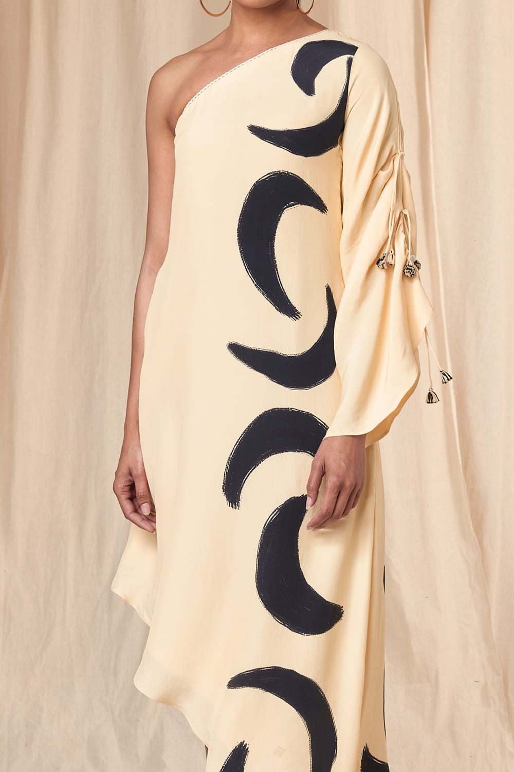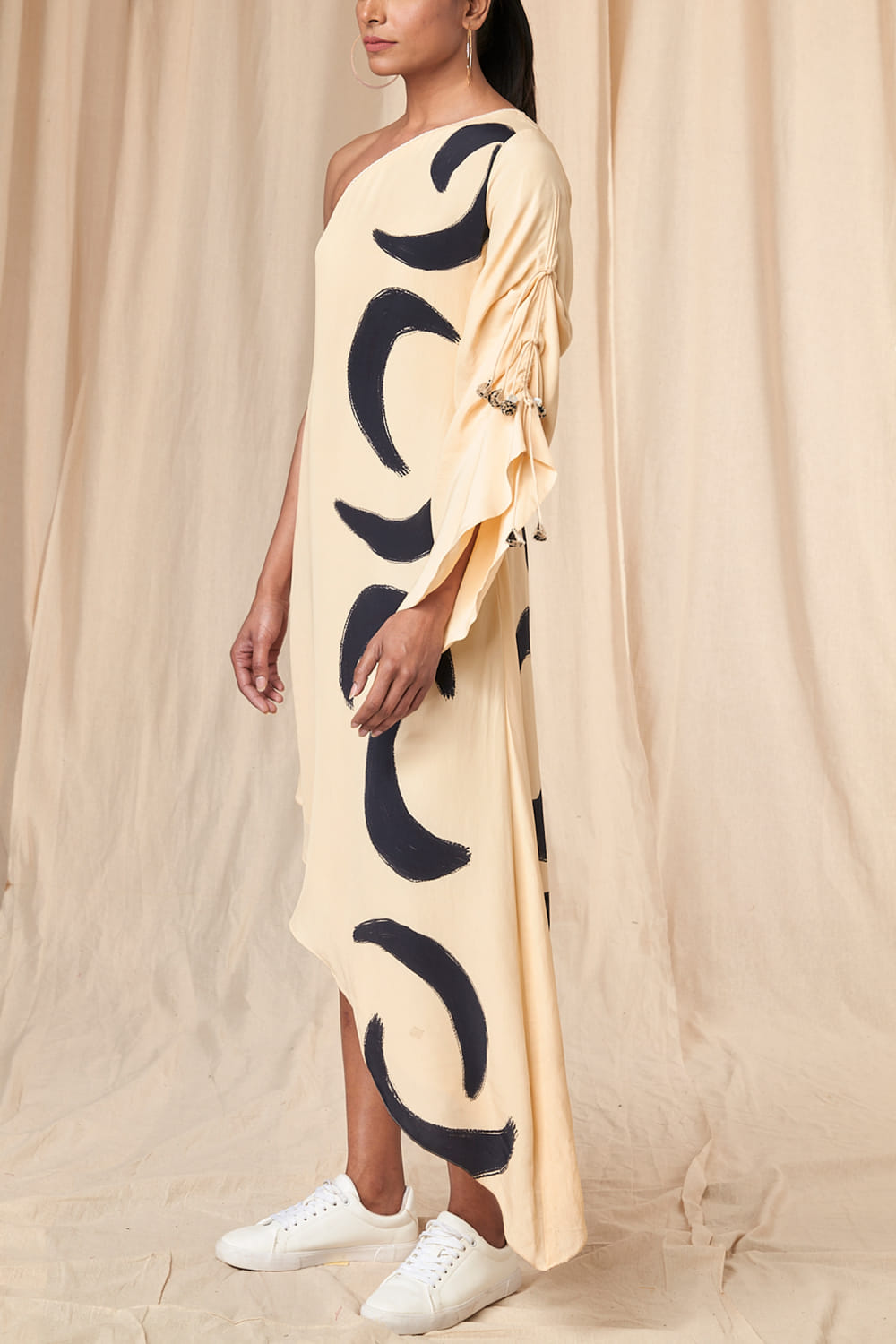 Masaba designs this vacation-ready kaftan-style dress crafted in natural crepe with one-shoulder and an asymmetric silhouette, featuring crescent moon print in a placement pattern. Style the look with tassel earrings and stilettoes for a day outing.