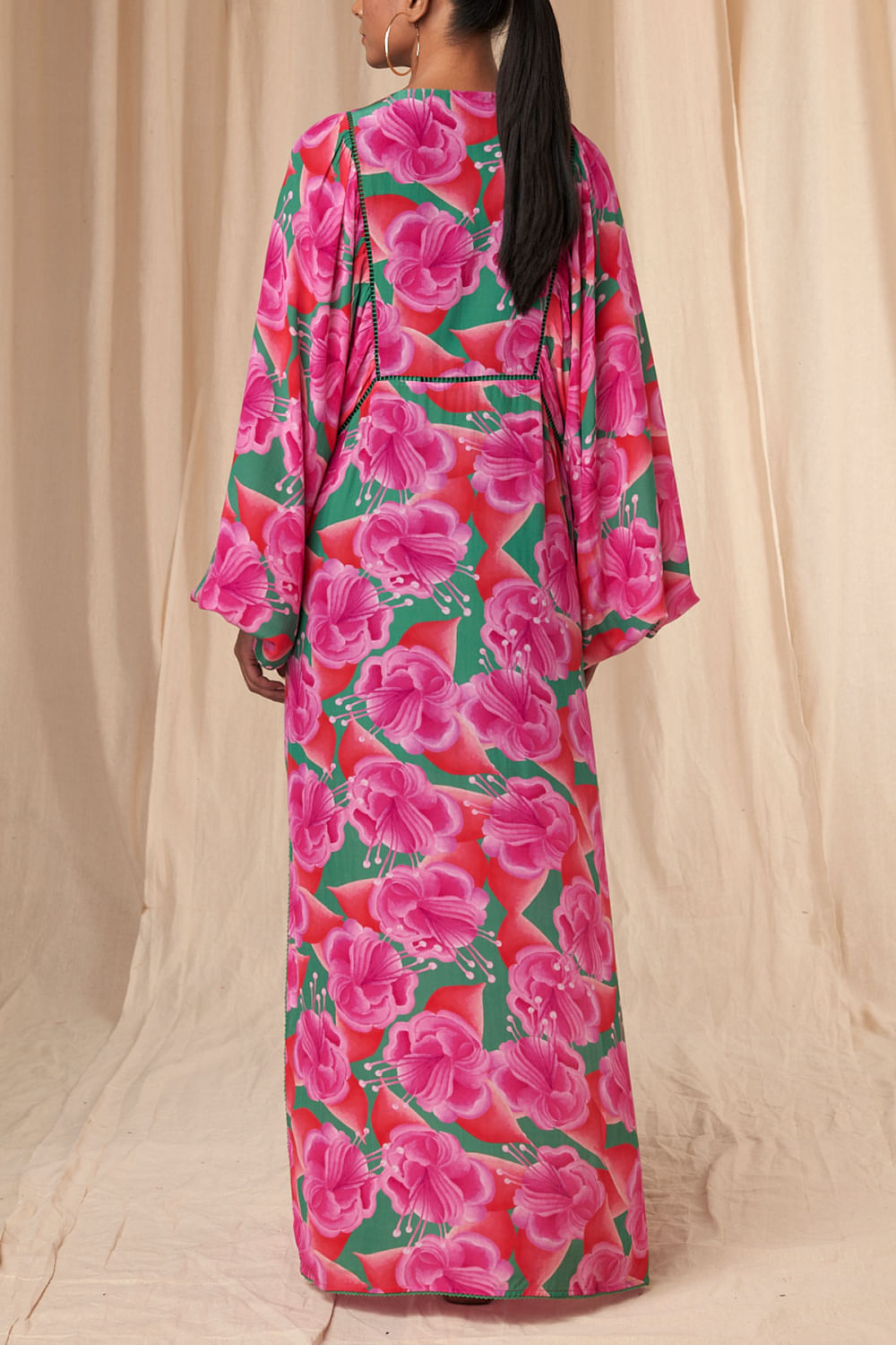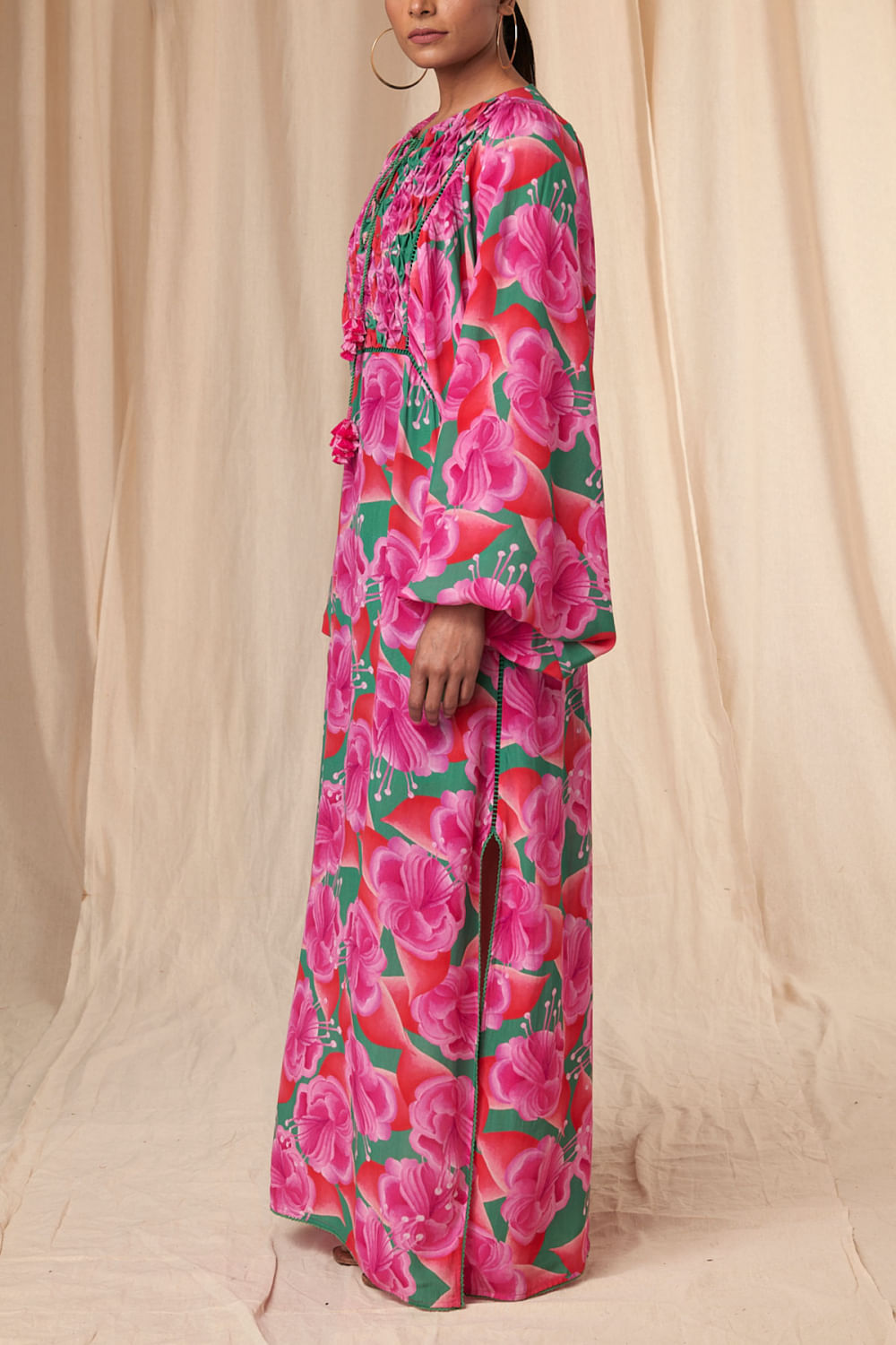 Masaba designs this summer-ready kaftan customised in natural crepe with smocking details on the yoke, tassels, bell sleeves, scallop, and ladder lace in floral prints, paired with an embroidered belt. Style the look with linear earrings and mules for a chic update.