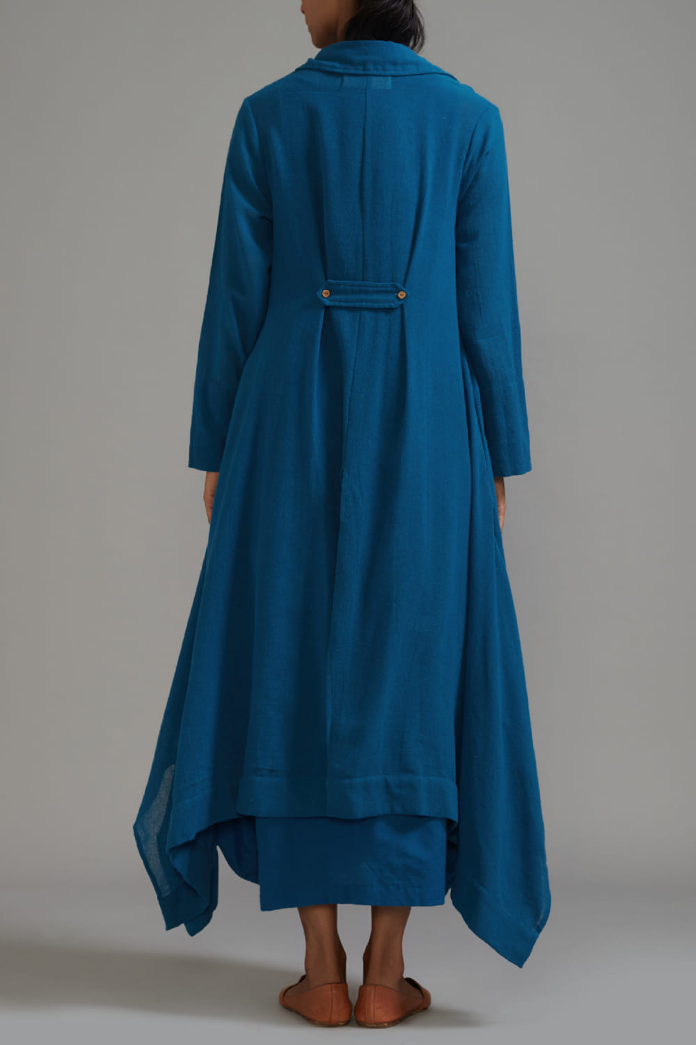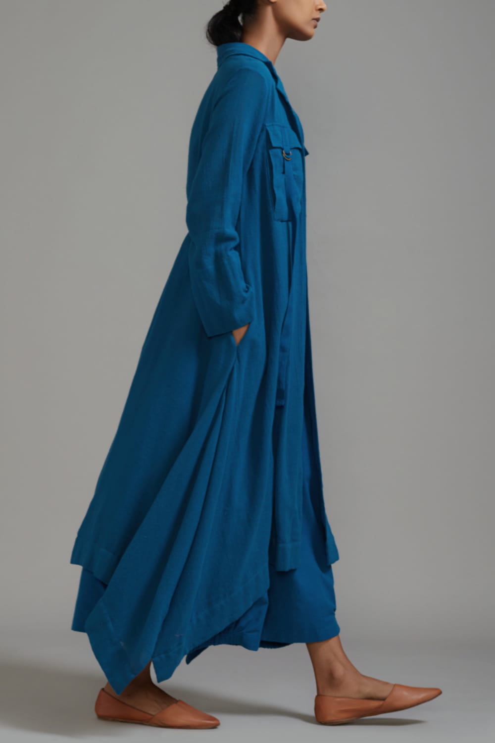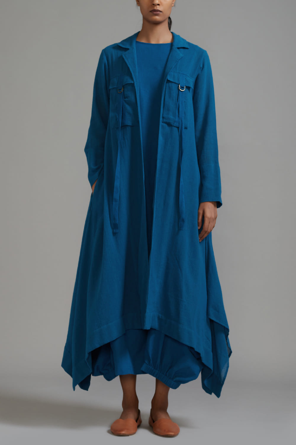 Mati designs this new-age jacket handspun in textured cotton with pockets and strap detailing featuring an asymmetrical hem. Style it with a striped short dress for a modern look. The dress here is shown for styling purposes only.