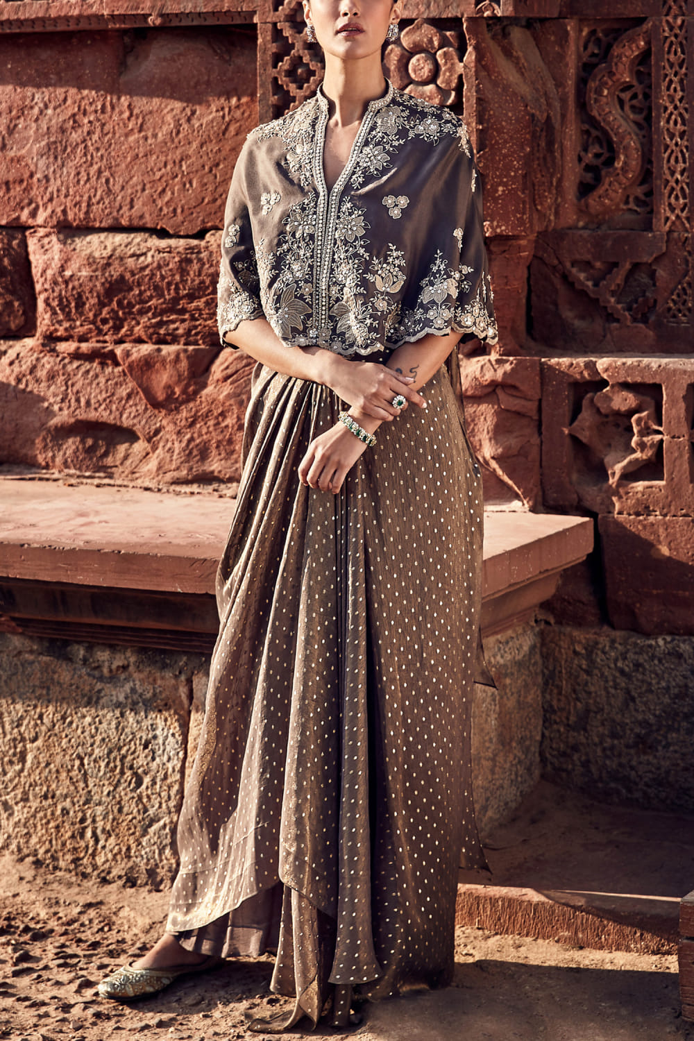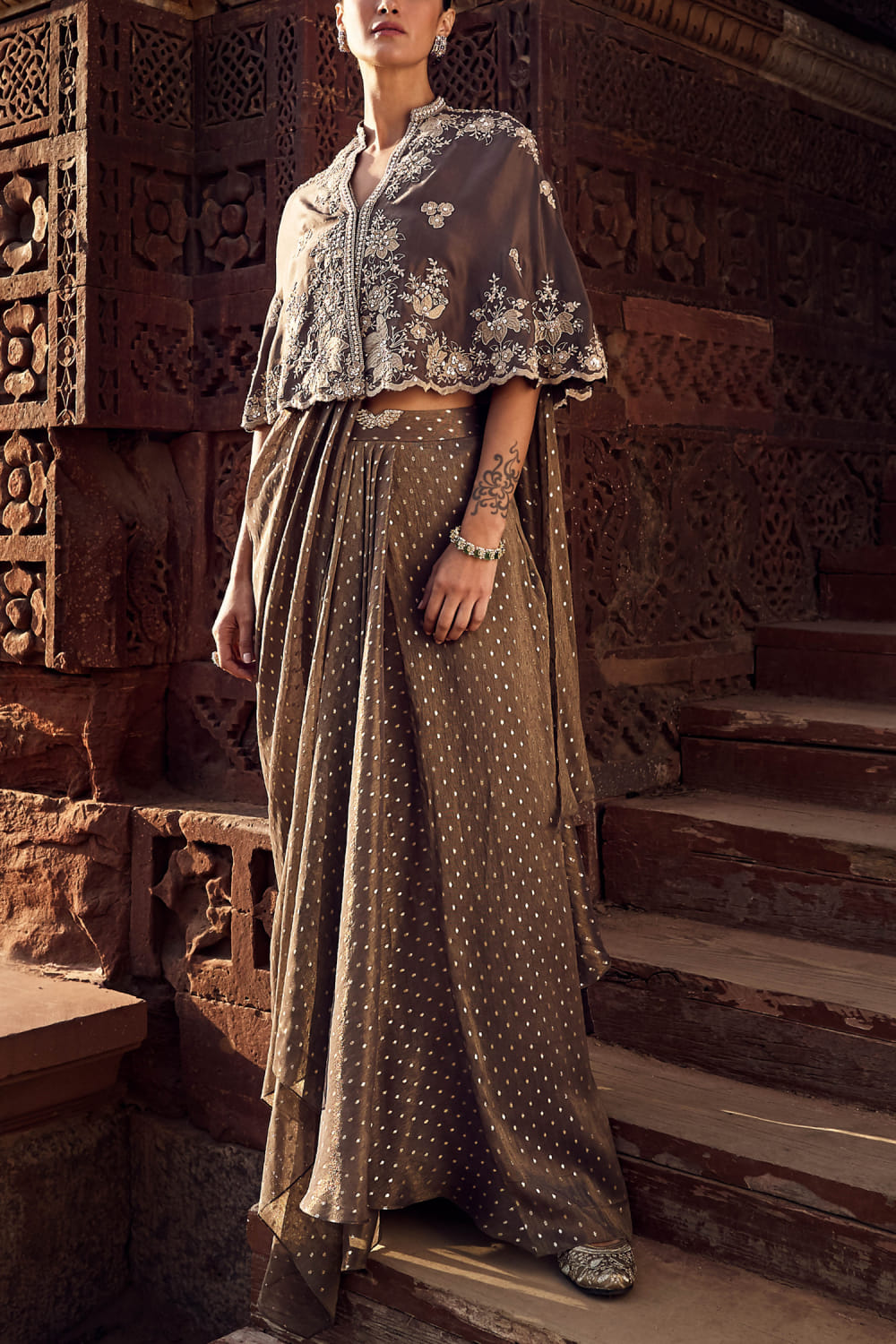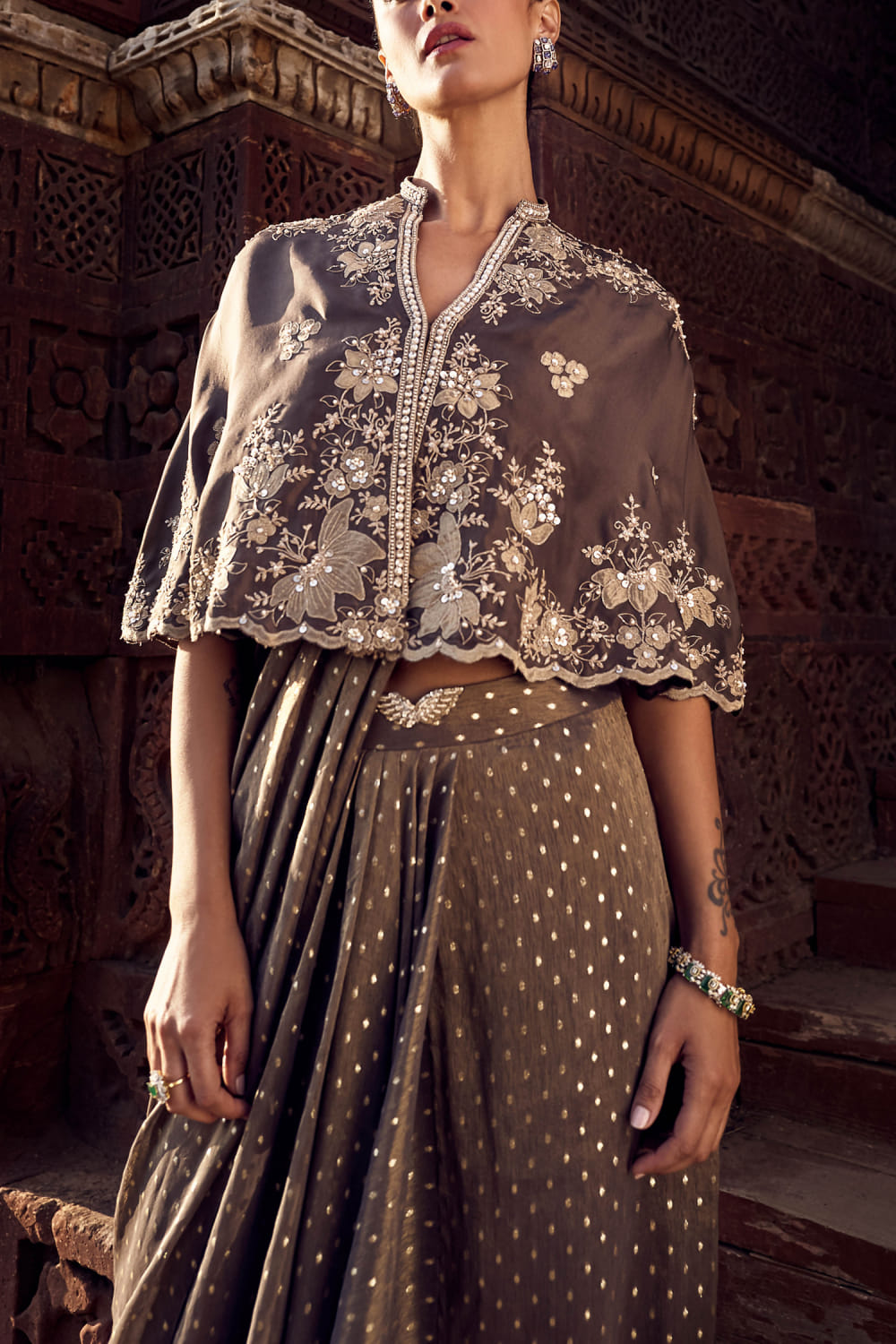 Matsya designs this opulent mini cape embraced in chanderi with dori work and applique embroidery detailing in floral patterns featuring a scalloped hem, teaming it with a matching draped sari. Style the look with pearl drop earrings and mule heels for a pre-wedding function.