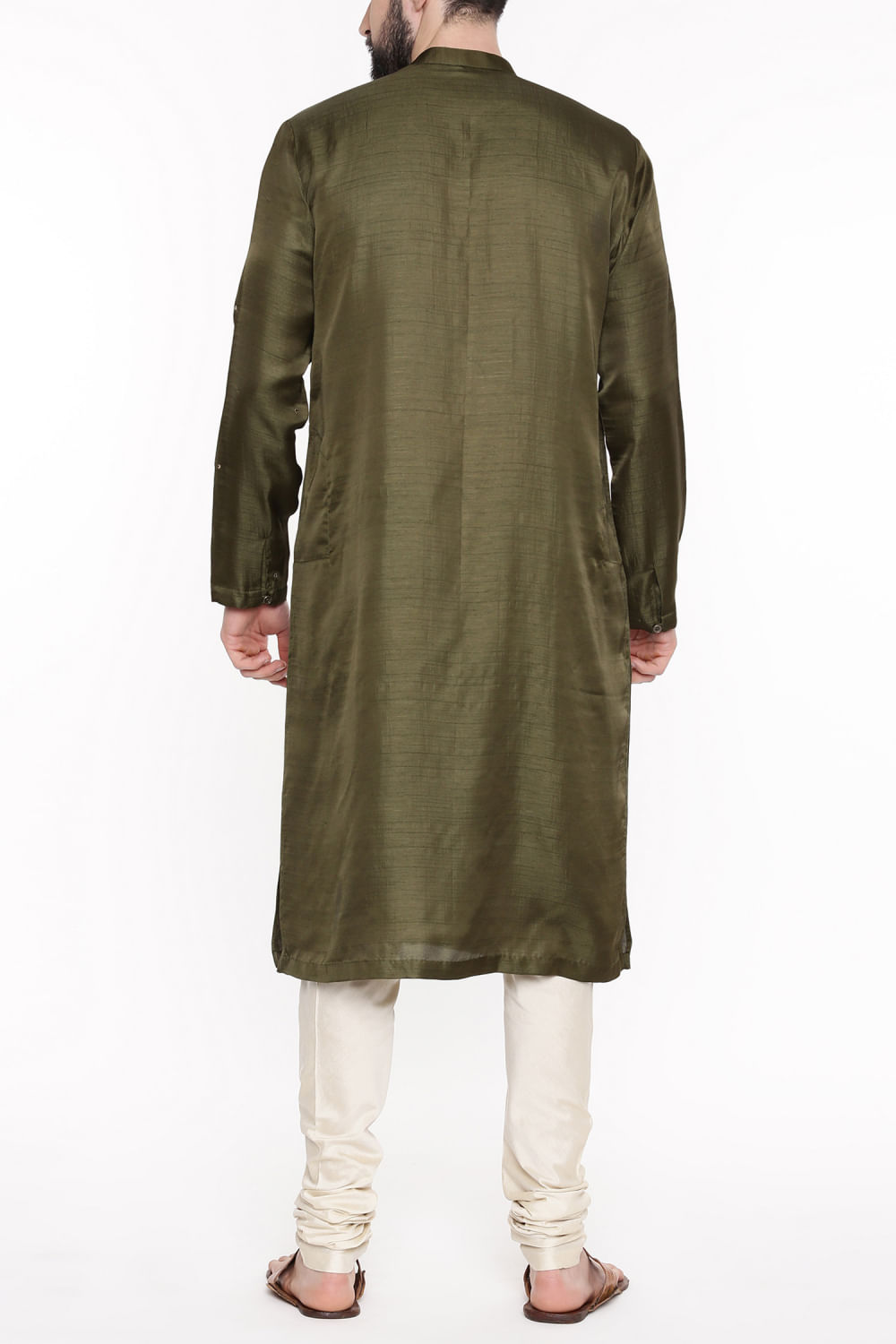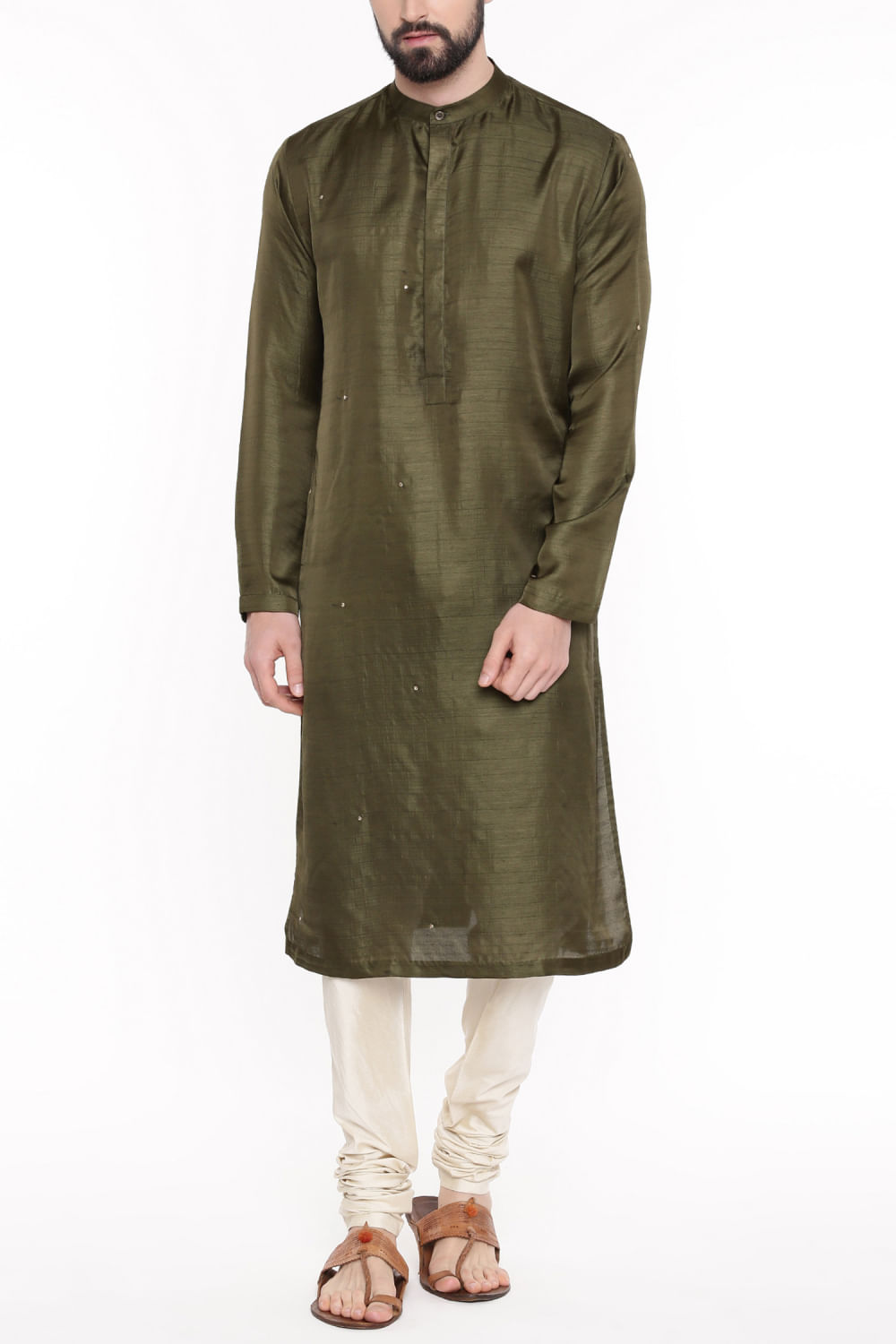 Mayank Modi designs this timeless silk slub kurta with subtle mukaish hand embroidery, pairing it with a churidar. Style the look with a pair of kolhapuris.